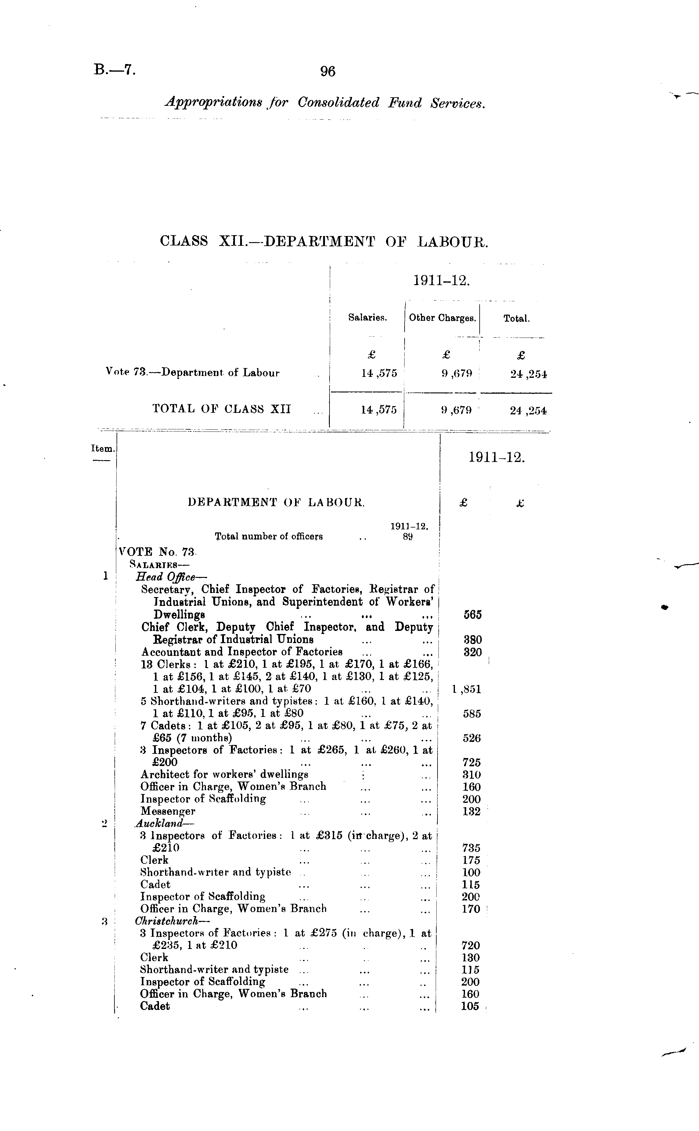 1911-12. Salaries. Other Charges. Total. £ Vote 73—Department of Labour 14,575 £ £ £ 14 ,575 9 ,079 24 ,254 TOTAL OF CLASS XII ... 14,575 9,679 24 ,254 .. Item. 1911-12. DEPARTMENT OF LABOUR. £ £ 1911-12. Total number of officers .. 89 VOTE No 73 Salaries— 1 Head Office— Secretary, Chief Inspector of Factories, Registrar of Industrial Unions, and Superintendent of Workers' Dwellings Chief Clerk, Deputy Chief Inspector, and Deputy Registrar of Industrial Unions Accountant and Inspector of Factories 13 Clerks : 1 at £210, 1 at £195, 1 at £170, 1 at £166, 1 at £156, I at £145, 2 at £140, 1 at £130, 1 at £125, 1 at £104, 1 at £100, 1 at £70 5 Shorthand-writers and typistes: 1 at £160, 1 at £140, 1 at £110. 1 at £95. 1 at £80 7 Cadets: 1 at £105, 2 at £95, 1 at £80, 1 at £75, 2 at £65 (7 months) 3 Inspectors of Factories: 1 at £265, 1 at £260, 1 at £200 Architect for workers' dwellings \ Officer in Charge, Women's Branch Inspector of Scaffolding Messenger 2 Auckland — 3 Inspectors of Factories: 1 at £315 (in charge), 2 at £210 Clerk Shorthand-writer and typiste . Cadet Inspector of Scaffolding Officer in Charge, Women's Branch 3 Christchurch — 3 Inspectors of Factories : 1 at £275 (in charge), 1 at £235, lat £210 Clerk Shorthand-writer and typiste ... Inspector of Scaffolding Officer in Charge, Women's Branch Cadet 565 380 320 1 ,851 585 526 725 310 160 200 132 735 175 100 115 200 170 720 130 115 200 160 105