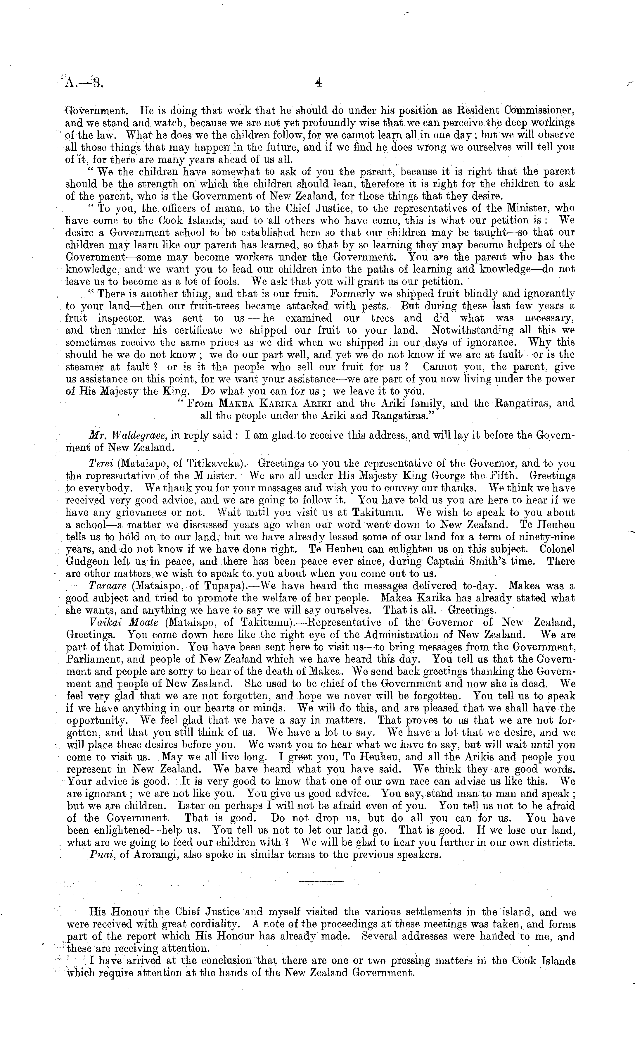 Government. He is doing that work that he should do under his position as Eesident Commissioner, and we stand and watch, because we are not yet profoundly wise that we can perceive the deep workings of the law. What he does we the children follow, for we cannot learn all in one day ; but we will observe all those things that may happen in the future, and if we find he does wrong we ourselves will tell you of it, for there are many years ahead of us all. " We the children have somewhat to ask of you the parent, because it is right that the parent should be the strength on which the children should lean, therefore it is right for the children to ask of the parent, who is the Government of New Zealand, for those things that they desire. " To you, the officers of mana, to the Chief Justice, to the representatives of the Minister, who have come to the Cook Islands, and to all others who have come, this is what our petition is : We desire a Government school to be established here so that our children may be taught —so that our children may learn like our parent has learned, so that by so learning they may become helpers of the Government —some may become workers under the Government. You are the parent who has the knowledge, and we want you to lead our children into the paths of learning and knowledge—do not leave us to become as a lot of fools. We ask that you will grant us our petition. '■' There is another thing, and that is our fruit. Formerly we shipped fruit blindly and ignorantly to your land —then our fruit-trees became attacked with pests. But during these last few years a fruit inspector was sent to us —he examined our trees and did what was necessary, and then under his certificate we shipped our fruit to your land. Notwithstanding all this we sometimes receive the same prices as we did when we shipped in our days of ignorance. Why this should be we do not know ; we do our part well, and yet we do not know if we are at fault —or is the steamer at fault ? or is it the people who sell our fruit for us ? Cannot you, the parent, give us assistance on this point, for we want your assistance —we are part of you now living under the power of His Majesty the King. Do what you can for us ; we leave it to you. "From Makea Karika Ariki and the Ariki family, and the Rangatiras, and all the people under the Ariki and Rangatiras." Mr. Waldegrave, in reply said : I am glad to receive this address, and will lay it before the Government of New Zealand. Terei (Mataiapo, of Titikaveka). —Greetings to you the representative of the Governor, and to you the representative of the M nister. We are all under His Majesty King George the Fifth. Greetings to everybody. We thank you for your messages and wish you to convey our thanks. We think we have received very good advice, and we are going to follow it. You have told us you are here to hear if we have any grievances or not. Wait until you visit us at Ta-kitumu. We wish to speak to you about a school —a matter we discussed years ago when our word went down to New Zealand. Te Heuheu tells us to hold on to our land, but we have already leased some of our land for a term of ninety-nine years, and do not know if we have done right. Te Heuheu can enlighten us on this subject. Colonel Gudgeon left us. in peace, and there has been peace ever since, during Captain Smith's time. There are other matters we wish to speak to you about when you come out to us. ■ Taraare (Mataiapo, of Tupapa). —We have heard the messages delivered to-day. Makea was a good subject and tried to promote the welfare of her people. Makea Karika has already stated what she wants, and anything we have to say we will say ourselves. That is all. Greetings. Vaikai Moate (Mataiapo, of Takitumu). —Representative of the Governor of New Zealand, Greetings. You come down here like the right eye of the Administration of New Zealand. We are part of that Dominion. You have been sent here to visit vs —to bring messages from the Government, Parliament, and people of New Zealand which we have heard this day. You tell us that the Government and people are sorry to hear of the death of Makea. We send back greetings thanking the Government and people of New Zealand. She used to be chief of the Government and now she is dead. We feel very glad that we are not forgotten, and hope we never will be forgotten. You tell us to speak if we have anything in our hearts or minds. We will do this, and are pleased that we shall have the opportunity. We feel glad that we have a say in matters. That proves to us that we are not forgotten, and that you still think of us. We have a lot to say. We have-a lot that we desire, and we will place these desires before you. We want you to hear what we have to say, but will wait until you come to visit us. May we all live long. I greet you, Te Heuheu, and all the Arikis and people you represent in New Zealand. We have heard what you have said. We think they are good words. Your advice is good. It is very good to know that one of our own race can advise us like this. We are ignorant; we are not like you. You give us good advice. You say, stand man to man and speak ; but we are children. Later on perhaps I will not be afraid even of you. You tell us not to be afraid of the Government. That is good. Do not drop us, but do all you can for us. You have been enlightened—help us. You tell us not to let our land go. That is good. If we lose our land, what are we going to feed our children with ? We will be glad to hear you further in our own districts. Puai, of Arorangi, also spoke in similar terms to the previous speakers. His Honour the Chief Justice and myself visited the various settlements in the island, and we were received with great cordiality. A note of the proceedings at these meetings was taken, and forms part of the report which His Honour has already made. Several addresses were handed to me, and these are receiving attention. I have arrived at the co