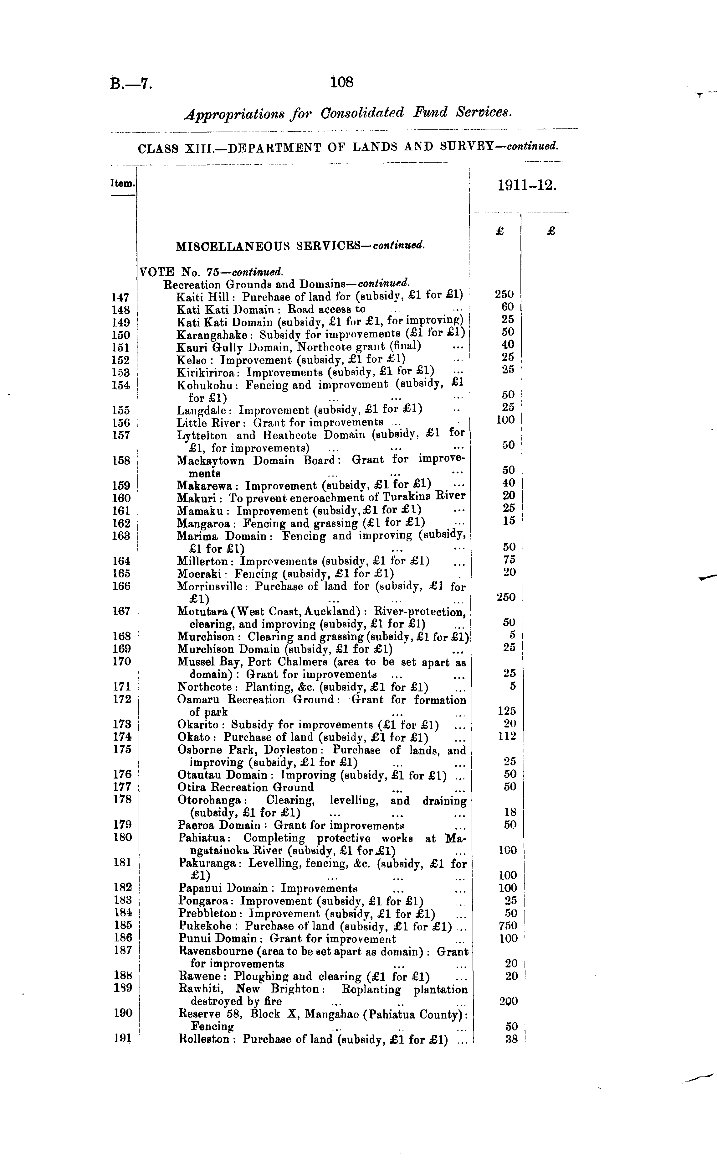 item. 1911-12. £ £ MISCELLANEOUS SERVICES— continued. 147 148 149 150 151 152 153 154 155 156 157 158 159 160 161 162 163 L64 165 166 167 168 169 170 VOTE No. 75— continued. Recreation Grounds and Domains— continued. Kaiti Hill: Purchase of land for (subsidy, £1 for £1) Kati Kati Domain : Road access to ... ■•• Kati Kati Domain (subsidy, £1 for £1, for improving) Karangahake : Subsidy for improvements (£1 for £1) j Kauri Gully Domain, Northcote grant (final) Kelso : Improvement (subsidy, £1 for £1) ••■ Kirikiriroa: Improvements (subsidy, £1 for £1) Kohukohu : Fencing and improvement (subsidy, £1 for£l) Laugdale: Improvement (subsidy, £1 for £1) Little River: Grant for improvements ... Lyttelton and Heathcote Domain (subsidy. £1 for £1, for improvements) Mackaytown Domain Board: Grant for improvements Makarewa : Improvement (subsidy, £1 for £1) ••■ Makuri: To prevent encroachment of Turakina River Mamaku : Improvement (subsidy, £1 for £1) Mangaroa: Fencing and grassing (£1 for £1) Marima Domain : Fencing and improving (subsidy, £lfor£l) Millerton : Improvements (subsidy, £1 for £1) Moeraki: Fencing (subsidy, £1 for £1) Morrinsville: Purchase of land for (subsidy, £1 for £1) Motutara (West Coast, Auckland) : River-protection, clearing, and improving (subsidy, £l for £1) Murchison : Clearing and grassing (subsidy, £1 for £1) Murchison Domain (subsidy, £1 for £1) Mussel Bay, Port Chalmers (area to be set apart as domain): Grant for improvements Northcote : Planting, &c. (subsidy, £1 for £1) Oamaru Recreation Ground : Grant for formation of park Okarito : Subsidy for improvements (£l for £1) Okato : Purchase of land (subsidy, £1 for £1) Osborne Park, Doyleston: Purchase of lands, and improving (subsidy, £1 for £1) Otautau Domain : Improving (subsidy, £1 for £1) ... Otira Recreation Ground Otorohauga: Clearing, levelling, and draining (subsidy, £1 for £1) Paeroa Domain : Grant for improvements Pahiatua: Completing protective works at Mangatainoka River (subsidy, £1 forjGl) Pakuranga: Levelling, fencing, &c. (subsidy, £1 for £1) Papanui Domain : Improvements Pongaroa: Improvement (subsidy, £1 for £1) Prebbleton : Improvement (subsidy, £1 for £1) Pukekohe : Purchase of land (subsidy, £1 for £1) ... Punui Domain : Grant for improvement Ravensbourne (area to be set apart as domain) : Grant for improvements Rawene : Ploughing and clearing (£1 for £1) Rawhiti, New Brighton: Replanting plantation destroyed by fire Reserve 58, Block X, Mangahao (Pahiatua County) : Fencing Rollesfcon : Purchase of land (subsidy, £1 for £1) ... i i 250 60 25 50 40 25 25 50 i 25 100 50 50 40 20 25 15 50 75 20 250 50 5 i 25 25 5 125 20 112 25 50 50 18 50 100 100 100 25 50 750 100 20 20 200 50 38 ! 171 172 173 174 175 176 177 178 179 180 181 182 183 184 185 186 187 188 1S9 190 191