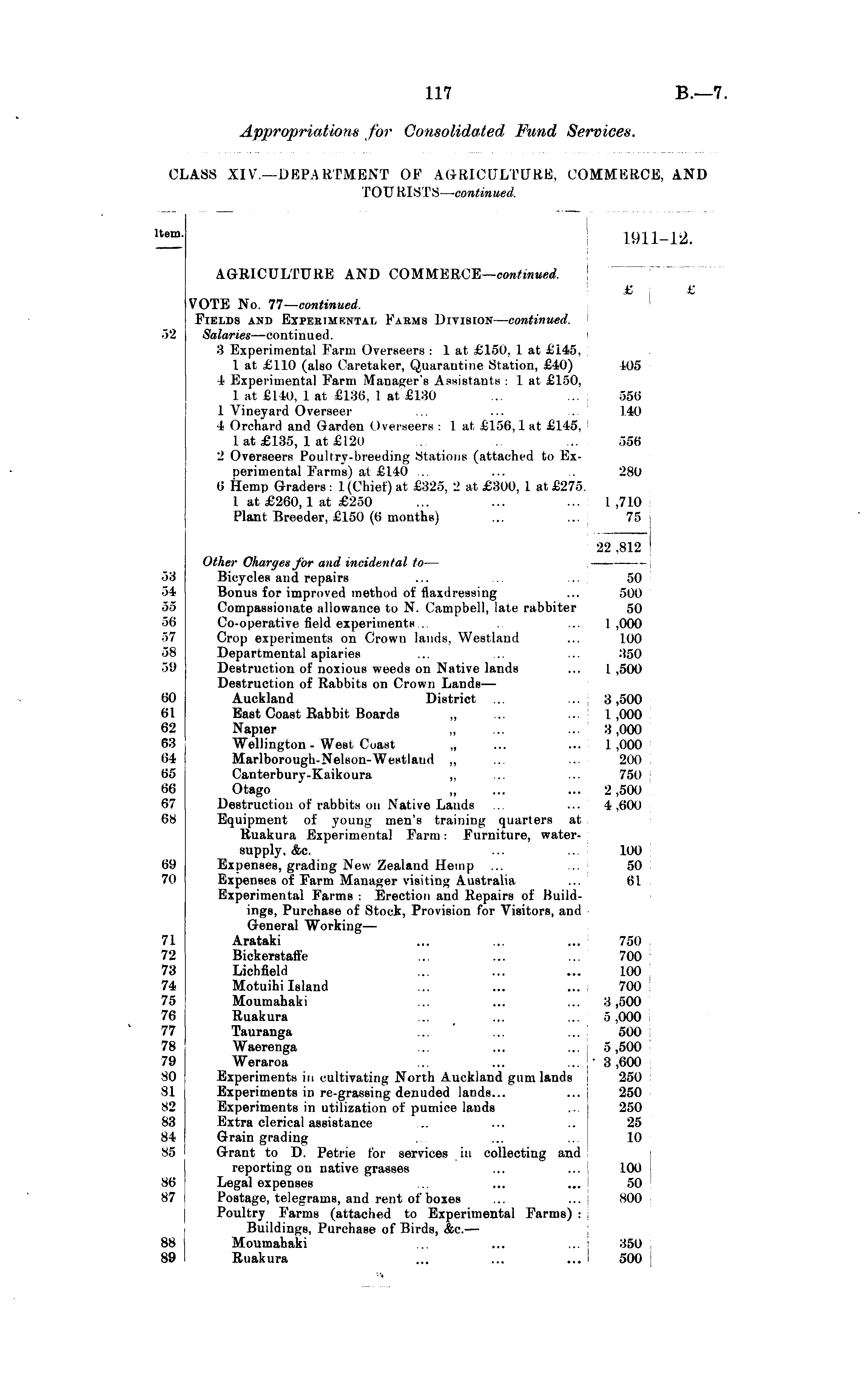 :tem.| 1911-12. AGRICULTURE AND COMMERCE— continued. 52 £ £ VOTE No. 77— continued. Fields and Experimental Farms Division — continued. Salaries —contin u ed. 3 Experimental Farm Overseers : 1 at £150, 1 at £i45. 1 at £110 (also Caretaker, Quarantine Station, £40) 405 4 Experimental Farm Manager's Assistants : 1 at £150, 1 at £140, 1 at £136, 1 at £130 ... ... 556 1 Vineyard Overseer ... ... ... 140 4 Orchard and Garden Overseers : 1 at £156,1 at £145. 1 at £135, 1 at £120 ... 556 2 Overseers Poultry-breeding Stations (attached to ExDerimental Farms) at £140 ... ... .. 280 6 Hemp Graders : 1 (Chief) at £325, 2 at £300, 1 at £275. 1 at £260,1 at £250 ... ... ... 1,710 Plant Breeder, £150 (6 months) ... ... 75 22 ,812 58 54 55 56 .-.7 58 59 60 01 62 63 64 66 66 67 68 09 70 Other Oharges for and incidental to — , Bicycles and repairs ... .. 50 Bonus for improved method of flaxdressing ... 500 Compassionate allowance to N. Campbell, late rabbiter 50 Co-operative field experiments... ... 1,000 Crop experiments on Crown lauds, Westland ... 100 Departmental apiaries ... ... ... 350 Destruction of noxious weeds on Native lands ... 1 ,500 Destruction of Rabbits on Crown Lands — Auckland District ... .. 3,500 East Coast Rabbit Boards „ ... ... 1,000 Napier „ ... ... 3,000 Wellington - West Coast ... 1,000 Marlborough-Nelson-Westlaud „ ... ... 200 Canterbury-Kaikoura ,, ... ... 750 Otago ... 2,500 Destruction of rabbits on Native Lands ... ... 4,600 Equipment of young men's training quarters at Ruakura Experimental Farm: Furniture, watersupply, &c. ... ... 100 Expenses, grading New Zealand Hemp ... ... 50 Expenses of Farm Manager visiting Australia ... 61 Experimental Farms : Erection and Repairs of Buildings, Purchase of Stock, Provision for Visitors, and General Working— Arataki ... ... ... 750 Bickerstaffe ...» ... ... 700 Lichfield ... ... ... 100 Motuihi Island ... ... ... 700 Moumahaki ... ... ... 3,500 Ruakura ... ... ... 5,000 Tauranga ... ... ... 500 Waerenga ... ... ... 5,500 Weraroa ... ... ... ' 3,600 Experiments in cultivating North Auckland gum lands 250 Experiments in re-grassing denuded lands... ... 250 Experiments in utilization of pumice lands . 250 Extra clerical assistance ... ... .. I 25 Grain grading ... ... 10 Grant to D. Petrie for services in collecting and reporting on native grasses ... ... 100 Legal expenses ... ... ...I 50 Postage, telegrams, and rent of boxes ... ... j 800 Poultry Farms (attached to Experimental Farms) : Buildings, Purchase of Birds, &c.— Moumahaki ... ... ... 350 Ruakura ... ... ... I 500 71 72 73 74 75 76 77 78 79 SO SI 82 S3 84 85 so 87 88 89