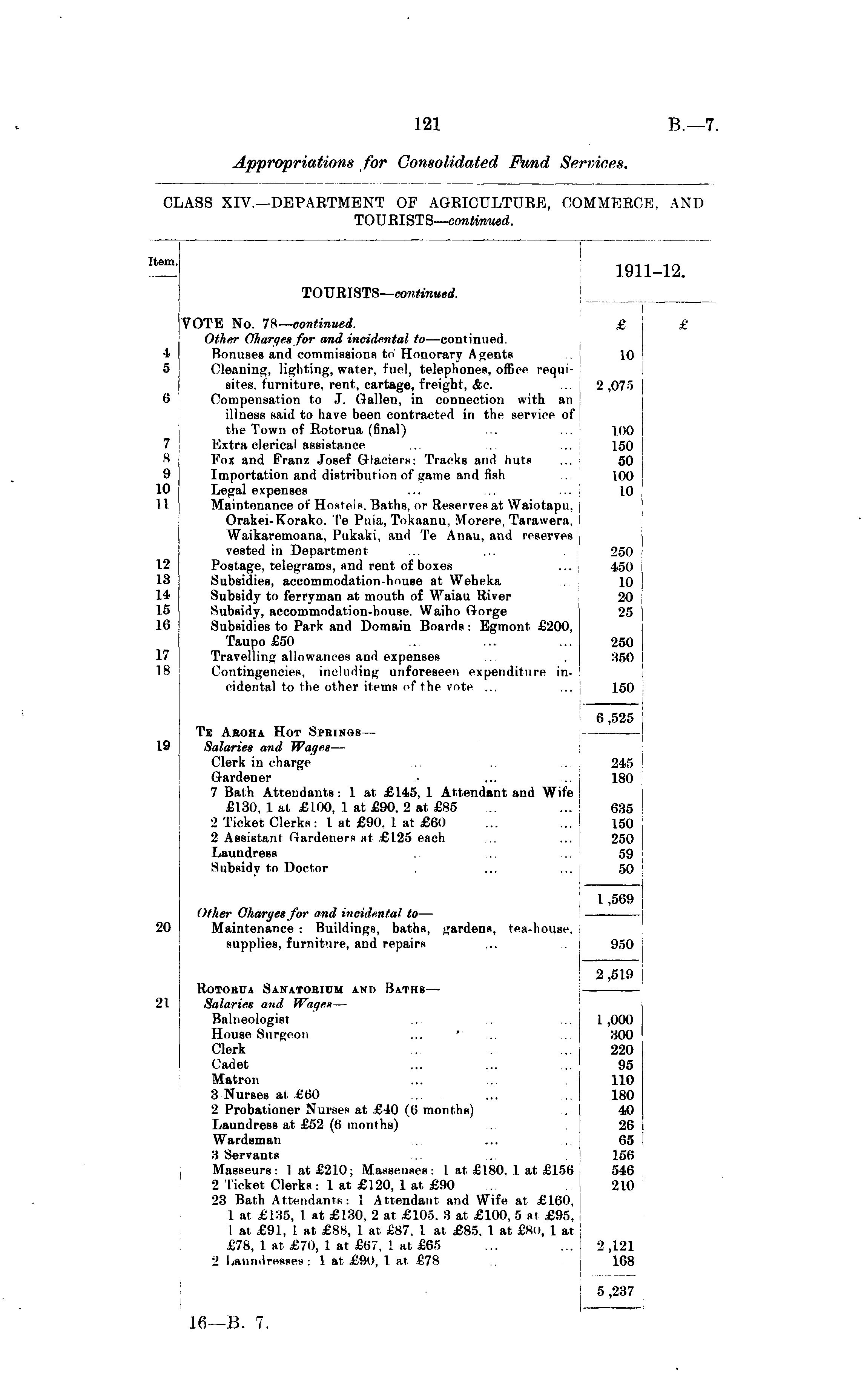 Item. 1911-12. TOURISTS— continued. 7 8 8 10 11 4 5 0 VOTE No. 78— continued. £ Other Charges for and incidental to —continued. Bonuses and commissions to Honorary Agents ... 10 Cleaning, lighting, water, fuel, telephones, office requisites, furniture, rent, cartage, freight, &e. ... 2 ,075 Compensation to J. Gallen, in connection with an illness said to have been contracted in the service of the Town of Rotorua (final) ... ... 100 Extra clerical assistance ... ... .. 150 Fox and Franz Josef Glaciers: Tracks and huts ... 50 Importation and distribution of game and fish 100 Legal expenses ... ... ... 10 Maintenance of Hostels. Baths, or Reserves at Waiotapti, Orakei-Korako. Te Pnia, Tokaanu, Morere, Tarawera, Waikaremoana, Pukaki, and Te Anau, and reserves vested in Department .. ... 250 Postage, telegrams, and rent of boxes ... 450 Subsidies, accommodation-house at Weheka . j 10 Subsidy to ferryman at mouth of Waiau River 20 Subsidy, accommodation-house. Waiho Gorge 25 Subsidies to Park and Domain Boards : Egmont £200, I Taupo £50 ... ..". ... 250 Travelling allowances and expenses ... 350 Contingencies, including unforeseen expenditure incidental to the other items of the vote ... ... 150 £ 12 13 14 15 16 17 is 6,525 19 Te Aroha Hot Sprinos— Salaries and Wages — Clerk in charge ... 245 Gardener ... ... 180 7 Bath Attendants: 1 at £145, 1 Attendant and Wife £130, 1 at £100, 1 at £90. 2 at £85 ... ... 635 2 Ticket Clerks : I at £90. 1 at £60 ... ... 150 2 Assistant Gardeners at £125 each ... ... 250 Laundress ... ... 59 Subsidy to Doctor ... ... 50 1,569 20 Other Charges for and incidental to — Maintenance : Buildings, baths, gardens, tea-house. supplies, furniture, and repairs ... 950 2,519 21 Rotorua Sanatorium and Baths — Salaries and Wages — Balneologist ... .. 1 ,000 House Surgeon ... ... ... | 300 Clerk ... ... ... j 220 Cadet ... ... ... ! 95 Matron ... ... 110 3 Nurses at £60 ... ... ... 180 2 Probationer Nurses at £40 (6 months) ... 40 Laundress at £52 (6 months) ... 26 Wardsman ... ... 65 3 Servants ... ... 156 Masseurs: 1 at £210; Masseuses: I at £180. 1 at £156 546 2 Ticket Clerks : 1 at £120, 1 at £90 210 23 Bath Attendants: 1 Attendant and Wife at £160. 1 at £135, 1 at £130, 2 at £105. 3 at £100, 5 at £95, 1 at £91, 1 at £88, 1 at £87. 1 at £85. 1 at £80, 1 at £78, 1 at £70, 1 at £67. 1 at £65 ... ... 2 ,121 2 Laundresses: 1 at £90, 1 at €78 168 5,237