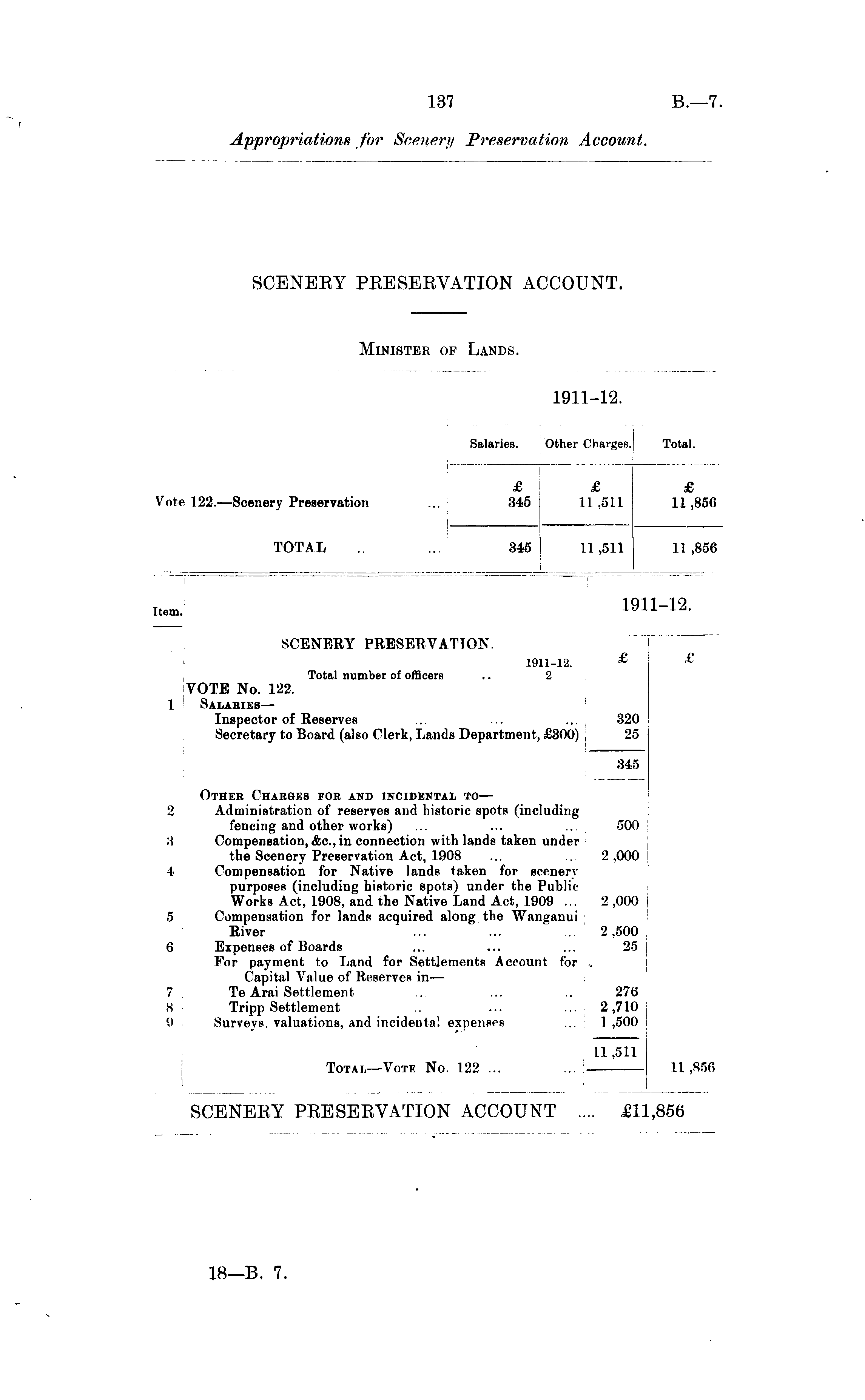 Minister of Lands. 1911-12. Salaries. Other Charges. Total. i £ Vote 122. —Scenery Preservation ... 345 £ 345 £ i 11 ,511 £ 11 ,511 £ 11,856 _, TOTAL .. ... 345 345 i 11,511 11,511 11 ,85i 11,856 I ! 191 11-12. tern. ] SCENERY PRESERVATION. 1911-12. £ Total number of officers .. 2 VOTE No. 122. 1 Salaries— Inspector of Reserves ... ... ... 320 Secretary to Board (also Clerk, Lands Department, £300) 25 £ 345 Other Charges for and incidental to — 2 i Administration of reserves and historic spots (including fencing and other works) ... ... ... 500 3 Compensation, Ac, in connection with lands taken under the Scenery Preservation Act, 1908 ... ... 2,000 I Compensation for Native lands taken for scenery purposes (including historic spots) under the Public Works Act, 1908, and the Native Land Act, 1909 ... 2 ,000 5 Compensation for lands acquired along the Wanganui River ... ... 2,500 6 Expenses of Boards ... ... ... 25 For payment to Land for Settlements Account for Capital Value of Reserves in— 7 Te Arai Settlement ... ... .. 276 8 Tripp Settlement ... ... 2,710 9 Surveys, valuations, and incidental expenses ... 1 ,500 11,511 Total—Vote No. 122 ... ... 11 ,856 SCENERY PRESERVATION ACCOUNT .... £11 ,856