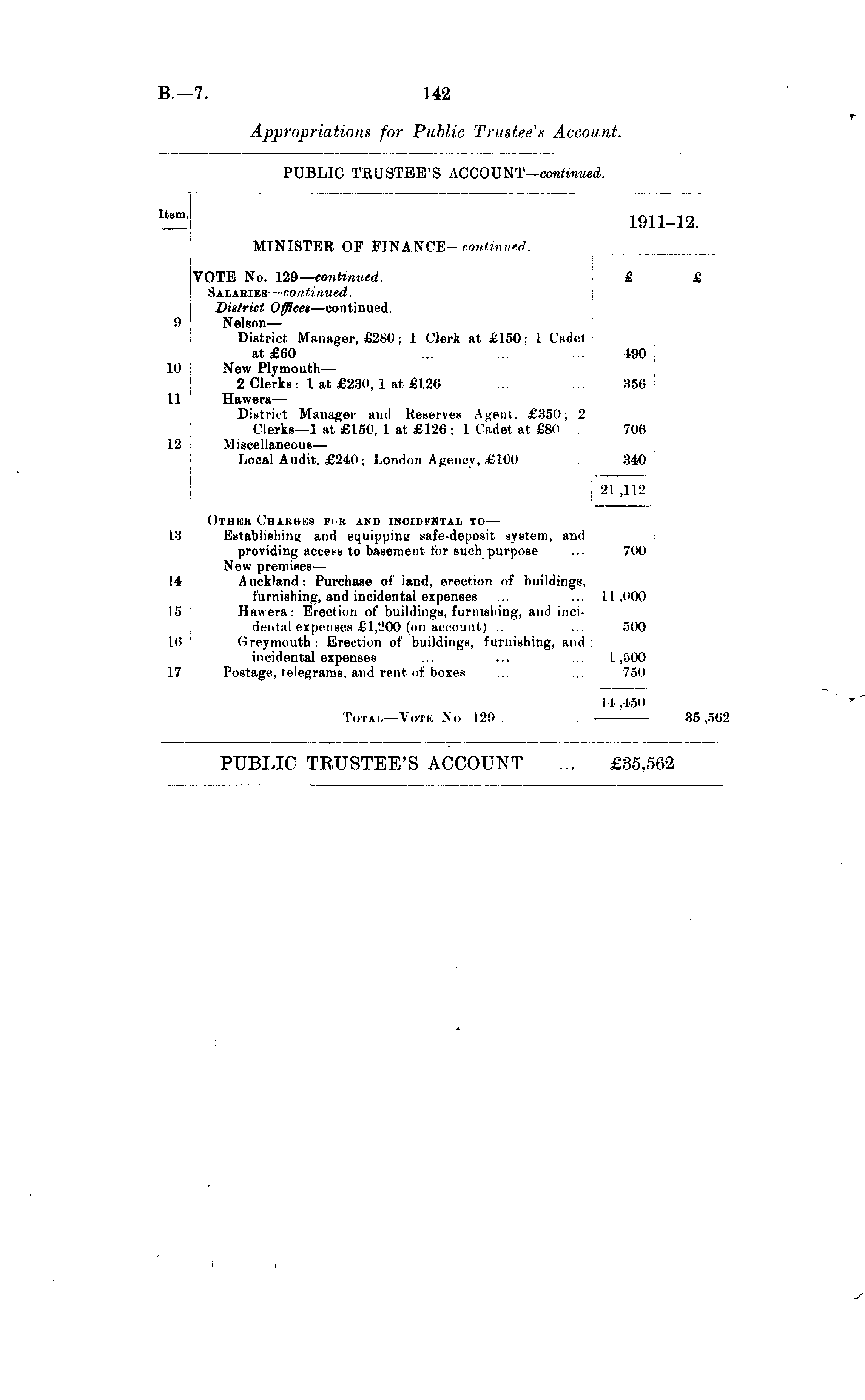 1911-12. MINISTER OF FINANCE— continued. VOTE No. 129— continued. £ £ Salaries — continued. District Offices —continued. 9 Nelson— District Manager, £280; 1 Clerk at £150; 1 Cadet at £60 ... ... ... 490 10 : New Plymouth— 2 Clerks: 1 at £230, 1 at £126 ... ... 356 11 Hawera — District Manager and Reserves Agent, £350; 2 Clerks—1 at £150, 1 at £126 ; 1 Cadet at £80 706 12 Miscellaneous— Local Audit. £240; London Agency, £100 340 I 21,112 Other Charges for and incidental to — 13 Establishing and equipping safe-deposit system, and providing access to basement for such purpose ... 700 New premises— 14 Auckland: Purchase of land, erection of buildings, furnishing, and incidental expenses ... ... 11,000 15 Hawera: Erection of buildings, furnishing, and incidental expenses £1,200 (on account) ... ... 500 16 Greymouth : Erection of buildings, furnishing, and incidental expenses ... ... ... 1,500 17 Postage, telegrams, and rent of boxes ... ... 750 14 ,450 Total—Vote No 129 . . — 35,502 I I 1 PUBLIC TRUSTEE'S ACCOUNT ... £35,562