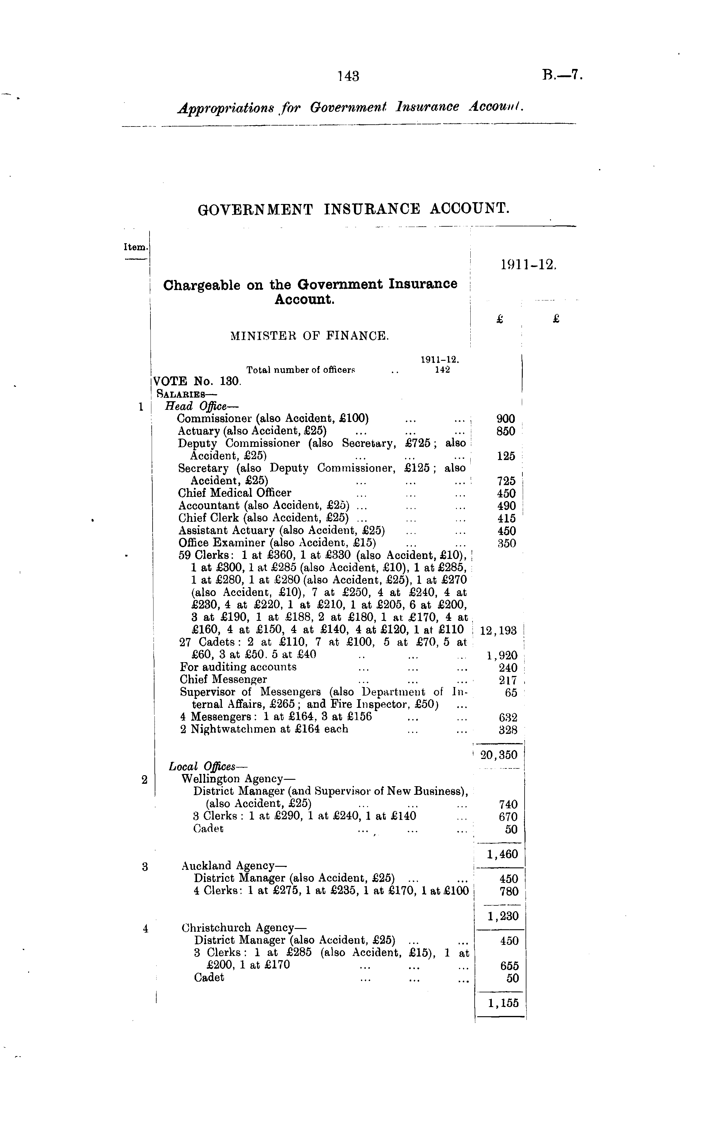 tern. n. 1911-12. Chargeable on the Government Insurance Account. £ £ MINISTER OF FINANCE. 1 1911-12. Total number of officers .. 142 VOTE No. 130. Salaries— Head Office — Commissioner (also Accident, £100) ... ... 900 Actuary (also Accident, £25) ... ... ... 850 Deputy Commissioner (also Secretary, £725; also Accident, £25) ... ... ... 125 Secretary (also Deputy Commissioner, £125; also Accident, £25) ... ... ... 725 Chief Medical Officer ... ... ... 450 Accountant (also Accident, £25) ... ... ... 490 Chief Clerk (also Accident, £25) ... ... ... 415 Assistant Actuary (also Accident, £25) ... ... 450 Office Examiner (also Accident, £15) ... ... 350 59 Clerks: 1 at £360, 1 at £330 (also Accident, £10), 1 at £300,1 at £285 (also Accident, £10), 1 at £285, 1 at £280, 1 at £280 (also Accident, £25), 1 at £270 (also Accident, £10), 7 at £250, 4 at £240, 4 at £230, 4 at £220, 1 at £210, 1 at £205, 6 at £200, 3 at £190, 1 at £188, 2 at £180, 1 at. £170, 4 at £160, 4 at £150, 4 at £140, 4 at £120, 1 at £110 : 12,193 27 Cadets: 2 at £110, 7 at £100, 5 at £70, 5 at £60, 3 at £50. 5 at £40 .. ... 1,920 For auditing accounts ... ... ... 240 Chief Messenger ... ... ... 217 Supervisor of Messengers (also Department of In- 65 ternal Affairs, £265; and Fire Inspector, £50) 4 Messengers : 1 at £164, 3 at £156 ... ... 632 2 Nightwatchmen at £164 each ... ... 328 1 20,350 2 Local Offices — Wellington Agency— District Manager (and Supervisor of New Business), (also Accident, £25) ... ... ... 740 3 Clerks : 1 at £290, 1 at £240, 1 at £140 ... 670 Cadet ... ... 50 1,460 3 Auckland Agency— District Manager (also Accident, £25) ... ... 450 4 Clerks: 1 at £275, 1 at £235, 1 at £170, 1 at £100 780 1,230 4 Christchurch Agency— District Manager (also Accident, £25) ... ... 450 3 Clerks: 1 at £285 (also Accident, £15), 1 at £200, lat £170 ... ... ... 655 Cadet ... ... ... 50 1,155