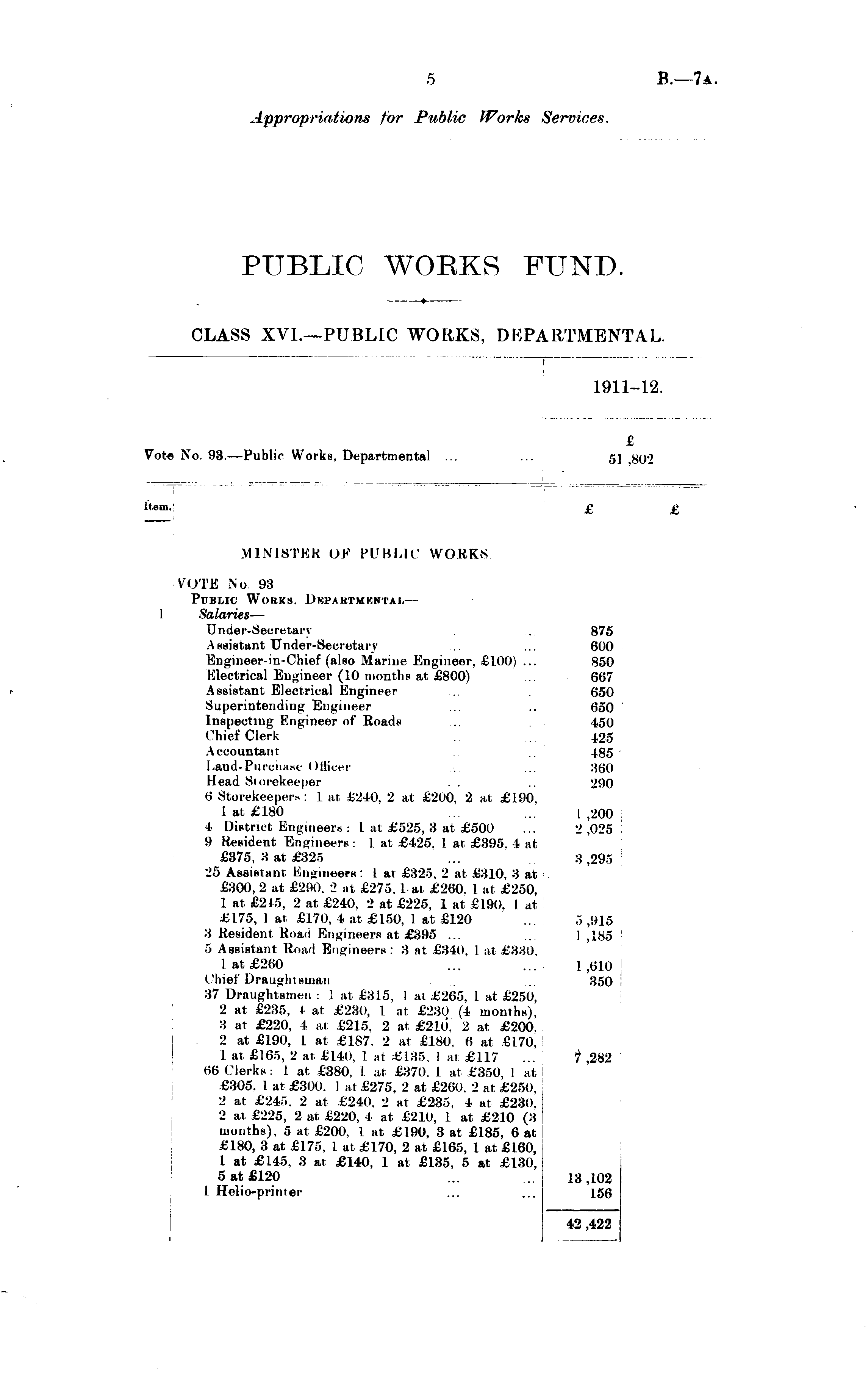 1911-12. £ Vote No. 93.—Public Works, Departmental ... ... 5j go -7 __ ; Item. £ a MINJ8TKK OF PUBLIC WORKS VOTE No 93 Public Works. Dkpaktmkntai.— 1 Salaries — Under-Secretarv . 875 Assistant Under-Secietarv ... ... 600 Bngineer-in-Chief (also Marine Engineer, £100) ... 850 Electrical Engineer (10 months at £800) ... 667 Assistant Electrical Engineer ... 650 Superintending Engineer ... .. 650 Inspecting Engineer of Roads ... 450 Chief Clerk . . 425 Accountant .. 485 Land-Purchase Officer .-.. ... 360 Head Storekeeper ... .. 290 6 Storekeepers : 1 at £240, 2 at £200, 2 at £190, 1 at £180 ... ... 1,200 1 District Engineers: L at £525, 3 at £500 ... 2,025 9 Resident Engineers : 1 at £425. 1 at £395. 4 at £375, 3 at £32.1 ... 3 ,29r. ■-'5 Assistant Bngroeere: 1 at £325. 2 at £310, 3 at £300,2 at £290. 2 at £275. I al £260. Let £250, 1 at £215, 2 at £240. 2 at £225, 1 at £190. I ,it £175, 1 at £170, 4 at £150, 1 at £120 ... 5 ,915 3 Resident Roa<» Engineers at £395 ... 1 ,185 5 Assistant Road Engineers: 3 at: £340, 1 at £330. 1 at £260 ... ... 1,610 Chief Draughtsman . .. 350 37 Draughtsmen : 1 at £315, L at £265, L at £250, 2 at £235, I at £230, 1 at £230 (4 months), 3 at £220, 4 at £215, 2 at £210, 2 at £200. 2 at £190, 1 at £187. 2 at £180, 6 at £170, 1 at £165, 2 at £140, 1 at £135, 1 at £117 ... i ,282 66 Clerks : I at £380, 1 at £370. 1 at £350, 1 at £305. 1 at £300. 1 at £275, 2 at £260. 2 at £250. 2 at £245. 2 at £240. 2 at £235, 4 at £230. 2 at £225, 2 at £220, 4 at £210, 1 at £210 (3 months), 5 at £200, 1 at £190, 3 at £185, 6 at £180, 3 at £175, 1 at £170, 2 at £165, 1 at £160, 1 at £145, 3 at £140, I at £135, 5 at £130, 5 at £120 ... ... 13,102 L Helio-prinier ... ... 156 13,102 156 42 ,422