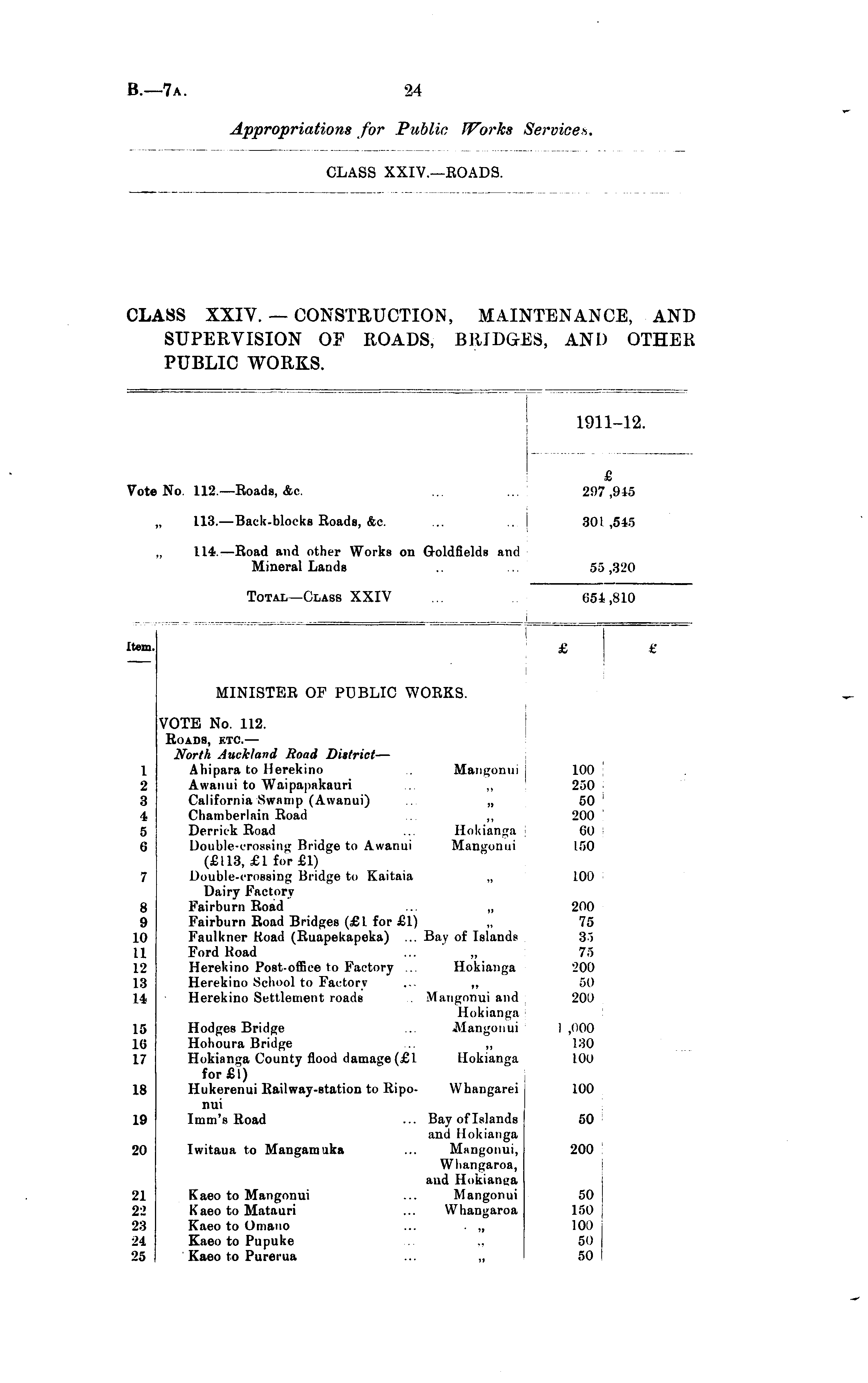 iLASS XXIV. — CONSTRUCTION, MAINTENANCE, AND SUPERVISION OF ROADS, BRIDGES, AND OTHER PUBLIC WORKS. 1911-12. ote No. 112— Roads, Ac. £ 297 ,945 113.—Back-blocks Roads, &c. 301 ,545 „ 114. —Road and other Works on Goldfields and Mineral Lands 55 ,320 Total—Class XXIV 654 ,810 654 ,810 .tern. £ £ MINISTEE OF PUBLIC WOEKS. L 2 8 5 U 7 8 9 10 11 12 18 14 VOTE No. 112. Roads, etc. — North Auckland Road District — Ahipara to Herekino . Mangonui Awaiuii to Waipa|>akauri ... „ California Swiinip (Awanui) ... „ Chamberlain Eoad ... ,, Derrick Eoad ... Hokianga Double-crossing Bridge to Awanui Mangunui (£113, £1 for £1) Double-crossing Bridge to Kaitaia „ Dairy Factory Fairburn Eoad ... „ Fairbiirn Eoad Bridges (£1 for £1) „ Faulkner Road (Euapekapeka) ... Bay of Islands Ford Road ... ,, Herekino Post-office to Factory ... Hokianga Herekino School to Factory ... ,, Herekino Settlement roade . Mangonui and Hokianga Hodges Bridge ... Mangonui Hohoura Bridge ... ,, Hokianga County flood damage (£1 Hokianga for£l) Hukerenui Railway-station to Ripo- Whangarei nui Imm's Road ... Bay of Islands and Hokianga Iwitaua to Mangamuka ... Mangonui, Wliangaroa, and Hokianga Kaeo to Mangonui ... Mangonui Kaeo to Matauri ... Wliangaroa Kaeo to Omano ... • „ Kaeo to Pupuke . ,, Kaeo to Purerua ... „ 100 250 50 ; 200 60 150 100 200 75 35 75 200 50 200 1 ,000 130 100 100 50 200 50 150 100 50 50 15 10 17 18 19 20 21 22 28 24 25