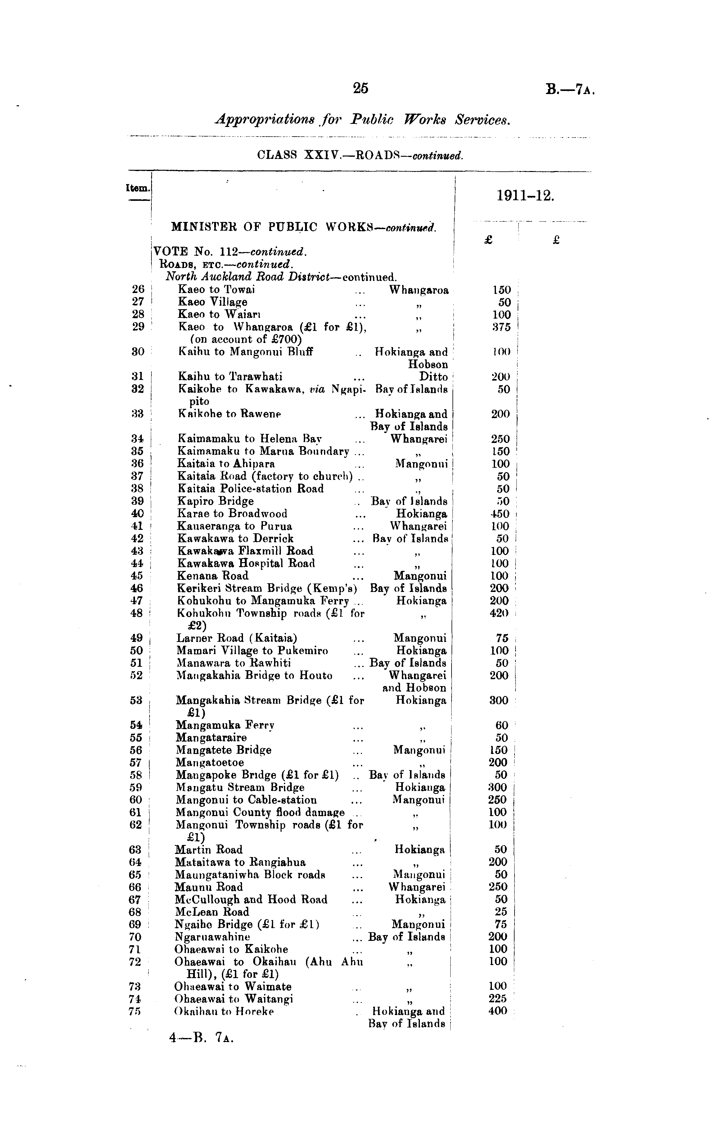Item. [tern. 26 27 28 29 30 31 32 38 84 35 86 37 ! 38 ! 39 40 41 42 43 44 , 45 46 47 48 : 49 50 51 i 52 53 54 55 56 57 58 59 60 61 02 63 64 65 66 67 68 69 70 71 72 73 74 75 t MINISTER OF PUBLIC WORKS— continued. VOTE No. 112— continued. Roads, etc. — continutd. North Auckland Road District —continued. Kaeo to Towai ... Whangaroa Eaeo Village ... „ Kaeo to Waiari ... „ Kaeo to Whangaroa (£1 for £1). (on account of £700) Kaihu to Mangonui Bluff . Hokianga and Hobson Kailui to Tnrawhati ... Ditto Kaikdht" to Kawakawa, via Ngapi- Bay of Tslanrls pito Kaikohe to Rawene ... Hokiangaand Bay of Islands I Kaimamaku to Helena Bay ... Whangarei Kairaamaku to Mama Boundary ... „ Kaitaia to Ahipara ... Mangonui Kaitaia Road (factory to church) .. ,, Kaitaia Police-station Road ... ;, Kapiro Bridge .. Bay of Islands Karae to Broad wood ... Hokianga Kauaerariga to Purua ... Whangarei \ Kawakawa to Derrick ... Bay of Islands Kawakiwra Flaxmill Road ... ,, Kawakawa Hospital Road ... „ Kenana Road ... Mangonui Kerikeri Stream Bridge (Kemp's) Bay of Islands Kohukohu to Mangatuuka Ferry ... Hokianga Kohukohu Township roads (£l for ,. £2) Larner Road (Kaitaia) ... Mangonui Mamari Village to Puketniro ... Hokianga Manawara to Rawhiti ... Bay of Islands Mangakahia Bridge to Houto ... Whangarei and Hobson ! Mangakahia Stream Bridge (£1 for Hokianga i £1) Mangamuka Ferry ... ,, Man gataraire ... ., Mangatete Bridge ... Mangonui Mangatoetoe ... ,, Mangapoke Bridge (£1 for£l) .. Bay of Islands Mangatu Stream Bridge ... Hokianga Mangonui to Cable-station ... Mangonui Mangonui County flood damage . Mangonui Township roads (£1 for „ £1) Martin Road ... Hokiangn Mutaitawa to Rangiahua ... „ Maungataniwha Block roads ... Mangonui Maunu Road ... Whangarei McCullough and Hood Road ... Hokianga McLean Road ... ,, Ngaiho Bridge (£1 for £1) ... Mangonui Ngaruawahine ... Bay of Islands Ohaeawai to Kaikohe ... „ Ohaeawai to Okaihau (Ahu Ahu „ Hill), (£lfor£l) Ohaeawai to Waimate ... „ Ohaeawai to Waitangi ... „ Okaihau to Horeke . Hokianga and Bay of Islands 1911-12. £ £ 150 ; 50 100 375 100 200 50 200 250 I 150 100 50 50 r>0 450 100 50 I 100 loo ! 100 200 200 420 75 100 50 200 i 300 60 50 150 200 50 300 250 100 100 50 200 50 250 50 ' 25 75 200 100 100 100 225 400