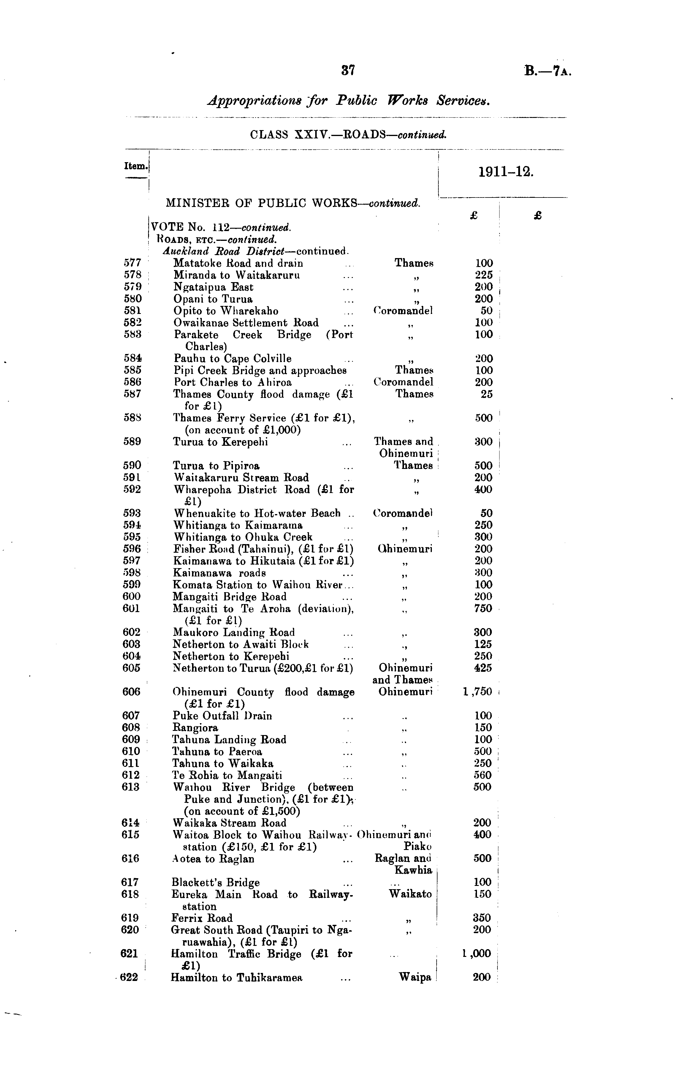 I Item. I 1911-12. MINISTER OF PUBLIC WORKS— continued. VOTE No. 112— continued. Koads, etc. — continued. Auckland Boad District —continued. 577 Matatoke Road and drain ... Thames 578 Miranda to Waitakaruru ... „ 579 Ngataipua East ... ,, 580 Opani to Turua ... „ 581 Opito to Wliarekaho ... Coromandel 582 Owaikanae Settlement Koad ... „ 583 Parakete Creek Bridge (Port Charles) 584 Pauhu to Cape Colville :.. „ 585 Pipi Creek Bridge and approaches Thames 586 Port Charles to Ahiroa ... Ooromandel 587 Thames County flood damage (£1 Thames for£l) 58S Thames Ferry Service (£1 for £1), (on account of £1,000) 589 Turua to Kerepehi ... Thames and Ohinemuri 590 Turua to Pipiroa ... Thames 591 Waitakaruru Stream Road . „ 592 Wharepoha District Road (£1 for £1) 593 Whenuakite to Hot-water Beach .. Ooromandel 594 Whitianga to Kaimaratna .. „ 595 Wliitianga to Oliuka Creek ... „ 596 Fisher Bond (Tahainui), (£l fur £l) Qhinemuri 597 Kaimanawa to Hikutaia (£lfor£l) 598 Kaimanawa roads ... „ 509 Komata Station to Waihou River... „ 600 Mangaiti Bridge Road ... „ 601 Mangaiti to Te Aroha (deviation), „ (£1 for £1) 602 Maukoro Landing Road ... ,. 603 Netherton to Awaiti Block .. ., 604 Netherton to Kerepehi ... „ 605 Nethertou to Turua (£200,£l for £1) Ohinemuri and Thames 606 Ohinemuri County flood damage Ohinemuri (£1 for £1) 607 Puke Outfall Drain 608 Rangiora 609 Tahuna Landing Road 610 Tahuna to Paeroa ... „ 611 Tahuna to Waikaka 612 Te Rohia to Mangaiti 613 Waihou River Bridge (between Puke and Junction), (£1 for £1>, (on account of £1,500) 614 Waikaka Stream Road 615 Waitoa Block to Waihou Railway- Ohinemuri and station (£150, £1 for £1) Piako 616 Aotea to Raglan ... Raglan an<i Kawhia 617 Blackett's Bridge 618 Eureka Main Road to Railway- Waikato station 619 Ferrix Road 620 Great South Road (Taupiri to Ngaruawahia), (£1 for £L) 621 Hamilton Traffic Bridge (£1 for £1) 622 Hamilton to Tuhikararaea ... Waipa £ £ 100 225 200 ; 200 50 100 100 200 100 200 25 500 300 500 200 400 50 250 300 200 200 300 100 200 750 300 125 250 425 1,750 i 100 150 100 500 250 560 500 200 400 500 100 150 350 200 1,000 200