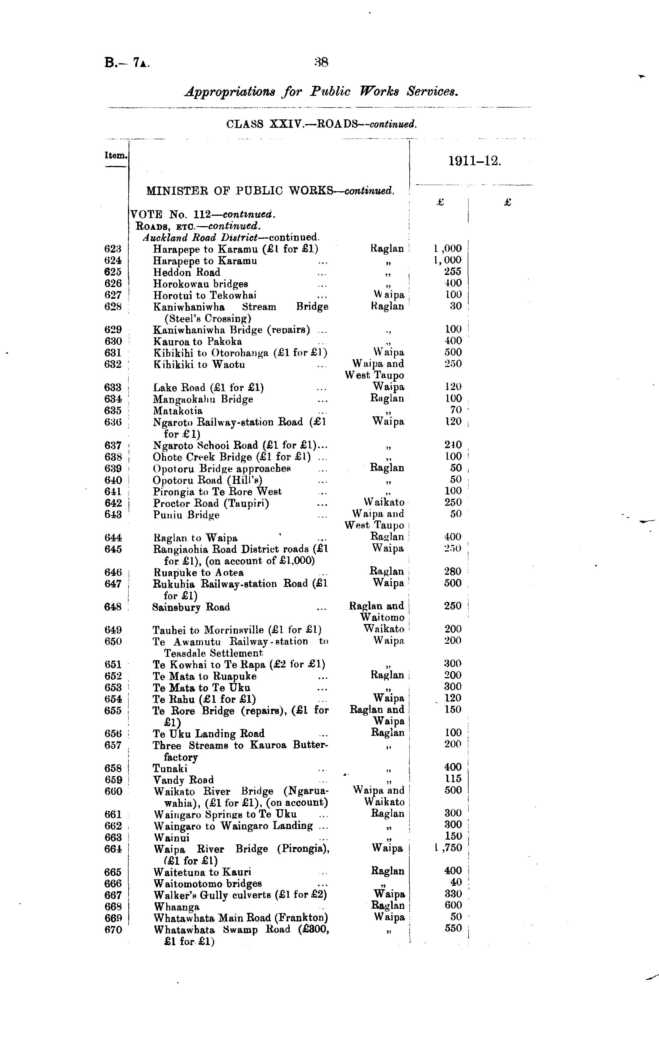 Item. Item. 1911-12. MINISTEE OP PUBLIC WORKS— continued. 523 524 S25 326 827 328 829 880 831 332 333 534 535 33(i 337 838 S89 840 841 642 i 543 344 845 846 847 - 348 849 650 851 852 853 854 855 856 357 658 i 659 860 861 662 863 S64 865 366 ■ 367 ' 668 J 669 ! R70 £ VOTE No. 112— continued. Roads, etc. — continued. Auckland Road District —continued. Harapepe to Karamu (£l for £1) Raglan 1 ,000 Harapepe to Karamu ... „ 1,000 Heddon Koad ... „ 255 Horokowau bridges ... „ J00 Horotui to Tekowhai ... Waipa 100 Kaniwhaniwha Stream Bridge Raglan 30 (Steel's Crossing) Kaniwhaniwha Bridge (repairs) ... .. 100 Kauroa to Pakoka .. ., 400 Kihikihi to Otorohanga (£lfor£l) Wai pa 500 Kihikiki 1o Waotu .. Waipaand 250 West Taupo Lake Eoad (£1 for £1) ... Waipa 120 Mangaokaliu Bridge ... Raglan 100 Matakotia .. „ 70 Ngaroto Eailway-station Eoad (£1 Waipa 120 | for£l) Ngaroto School Eoad (£1 for £1)... „ 240 Ohote Creek Bridge (£1 for £l) ... „ 100 Opotoru Bridge approaches ... Eaglan 50 , Opotoru Eoad (Hill's) ... „ 50 Pirongia to Te Eote West ... ,. 100 Proctor Eoad (Taupiri) ... VVaikato 250 Puniu Bridge ... Waipaand 50 West Taupo I Raglan to Waipa ... Raglan 400 Rangiaohia Eoad District roads (£1 Waipa 250 for £1), (on account of £1,000) Ruapuke to Aotea ... Eaglan 280 Eukuhia Eailway-station Eoad (£1 Waipa 500 for £1) Sainsbury Koad ... Raglan and 250 Waitomo Tauhei to Morrinsville (£1 for £1) Waikato ' 200 Te Awamutu Eailway-station to Waipa 200 Teasdale Settlement Te Kowhai to Te Kapa (£2 for £1) „ 300 Te Mata to Ruapuke ... Raglan 200 Te Mata to Te Uku ... „ 300 Te Rahu (£1 for £1) ... Waipa 120 Te Eore Bridge (repairs), (£1 for Raglan and 150 £1) Waipa Te Uku Landing Road ... Raglan 100 Three Streams to Kauroa Butter- „ 200 factory Tunaki ... „ 400 Vandy Road ... „ 115 Waikato River Bridge (Ngarua- Waipa and 500 wahia), (£1 for £1), (on account) Waikato Waingaro Springs to Te Uku ... Raglan 300 Waingaro to Waingaro Landing ... „ 300 Wainui ... ,, 150 Waipa River Bridge (Pirongia), Waipa j 1 ,750 (£1 for £1) Waitetuna to Kauri ... Raglan 400 Waitomotomo bridges ... „ 40 WalkerV Gully culverts (£1 for £2) Waipa 330 Whaanga .. Raglan 600 Whatawhata Main Eoad (Frankton) Waipa 50 Whatawhata Swamp Road (£300, „ 550 £lfor£l) £