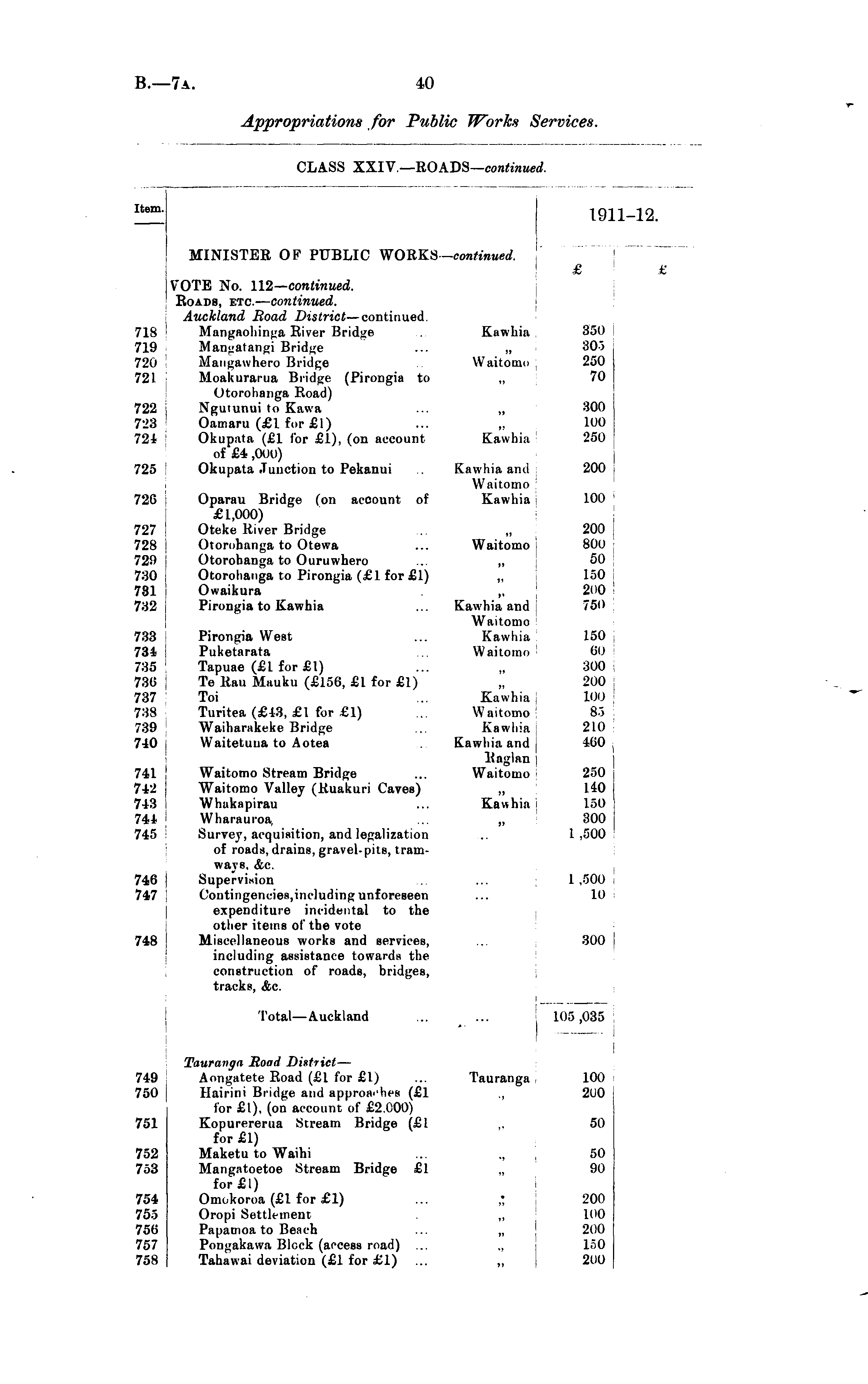 item. 1911-12. MINISTER OF PUBLIC WORKS -continued. £ £ 718 719 720 721 722 723 724 725 726 727 728 729 730 731 732 733 734 735 736 737 738 739 740 VOTE No. 112— continued. Roads, etc. — continued. Auckland Road District —continued. Mangaohinga River Bridge . Kawhia 350 Manyatangi Bridge ... „ 303 Mangawhero Bridge .. Waitotno , 250 Moakurarua Bridge (Pirongia to „ 70 Otorohanga Road) Ngutunui to Kawa ... „ 300 Oamaru (£1 for£l) ... „ 100 Okupata (£1 for £1), (on account Kawhia 250 of £4 ,001)) Okupata Junction to Pekanui .. Kawhia and 200 Waitomo Oparau Bridge (on account of Kawhia 100 £1,000) Oteke River Bridge ... „ 200 Otorobanga to Otewa ... Waitomo 80U Otorohanga to Ouruwhero ... „ 50 Otorohatiga to Pirongia (£1 for £1) „ 150 Owaikura „ 200 Pirongia to Kawhia ... Kawhia and 750 Waitomo Pirongia West ... Kawhia 150 Puketarata ... Waitomo 60 Tapuae (£1 for £1) ... „ 300 Te Rau Mauku (£156, £l for £1) „ 200 Toi ... Kawhia 100 Turitea (£43, £1 for £1) ... Waitomo 83 Waiharakeke Bridge ... Kawhia 210 Waitetuua to Aotea . Kawliia and 460 : Raglan Waitomo Stream Bridge ... Waitomo 250 Waitomo Valley (Ruakuri Caves) „ 140 Whakapirau ... Kawhia 150 Wharauroa, ... „ 300 Survey, acquisition, and legalization .. 1,500 of roads, drains, gravel-pits, tramways, &c. Supervinion ... ... 1 ,500 Contingencies.including unforeseen ... 10 expenditure incidental to the other items of the vote Miscellaneous works and services, ... 300 including assistance towards the construction of roads, bridges, tracks, <fcc. 741 742 743 744 745 746 747 '48 Total—Auckland ... ... 105,035 749 750 751 752 753 Tauranqa Road District — Anngatete Road (£L for £l) ... Tauranga 100 Hairini Bridge and approaches (£l ., 2U0 for £1), (on account of £2.000) Kopurererua Stream Bridge (£1 ,, 50 for £1) Maketu to Waihi ... ., 50 Mangatoetoe Stream Bridge £1 „ 90 for£l) Omokoroa (£1 for £1) ... • 200 Oropi Settlement . „ 100 Papamoa to Beach ... „ 200 Pongakavva Block (access road) ... „ 150 Tahawai deviation (£1 for £1) ... „ 2U0 754 755 750 757 758