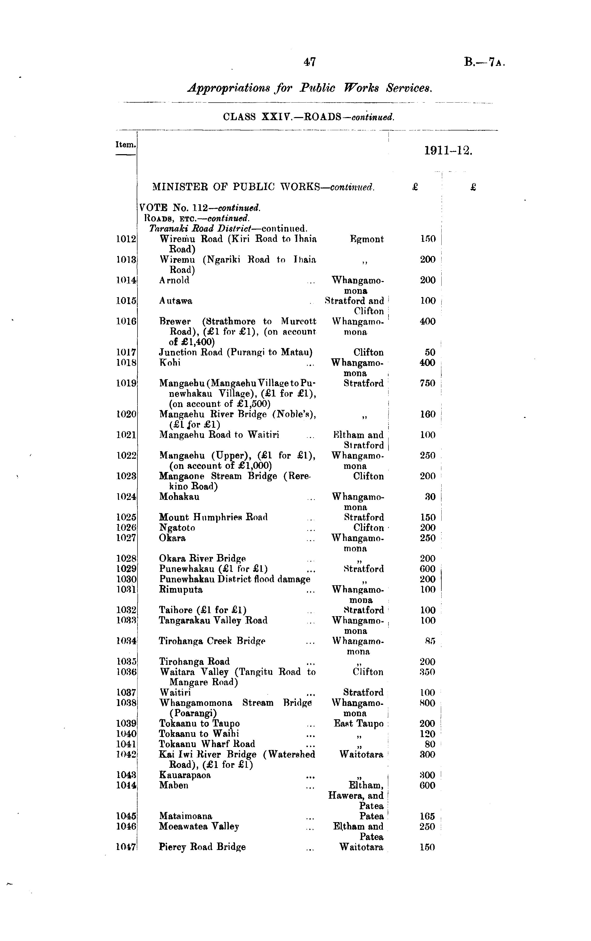 Item. 1911-12. MINISTER OF PUBLIC WORKS— continued. £ : £ 1012 1013 1014 1015 1016 1017 1018 1019 VOTE No. 112— continued. Roads, etc. — continued. Taranaki Road District —continued. Wiremu Road (Kiri Road to Ihaia Egmont Road) Wiremu (Ngariki Road to Ihaia ,, Road) Arnold ... Whangamomona Autawa . Stratford and Clifton Brewer (Strathmore to Muroott WhangamoRoad), (£1 for £1), (on account mona of £1,400) Junction Road (Purangi to Matau) Clifton Kohi ... Whangamomona Mangaehu (Mangaehu Village to Pu- Stratford newhakau Village), (£1 for £1), (on account of £1,500) Mangaehu River Bridge (Noble's), „ (£ljor£l) Mangaehu Road to Waitiri ... Elthain and Stratford Mangaehu (Upper), (£1 for £1), Whangamo(on account of £1,000) mona Mangaone Stream Bridge (Rere- Clifton kino Road) Mohakau ... Whangamomona Mount Humphries Road ... Stratford Ngatoto ... Clifton Okara ... Whangamomona 150 200 200 100 400 50 400 750 160 ; 100 250 200 80 150 200 250 1020 1021 1022 1023 1024 1025 1026 1027 1028 1029 1030 1031 Okara River Bridge ... „ Punewhakau (£1 for £1) ... Stratford Punewhakau District flood damage ,, Rimnputa ... Whangamomona Taihore (£1 for £1) ... Stratford Tangarakau Valley Road .. Whangamo-, mona Tirohanga Creek Bridge ... Whangamomona 200 G00 200 100 100 100 85 1032 1033 1034 1035 1036! Tirohanga Road ... ,, Waitara Valley (Tangitu Road to Clifton Mangare Road) Waitiri ... Stratford Whangamomona Stream Bridge , Whangamo(Poarangi) mona Tokaanu to Taupo ... East Taupo Tokaanu to Waihi ... „ Tokaanu Wharf Road ... „ Kai Iwi River Bridge (Watershed Waitotara Road), (£1 for £1) Eauarapaoa ... „ Maben ... Eltham, Hawera, and Patea Mataimoana ... Patea ' Moeawatea Valley ... EUham and Patea Piercy Road Bridge ... Waitotara 200 350 L00 800 200 120 80 300 300 GOO 165 250 150 1037 1038 1039 1040 1041 1042 1043 1044 045 .046 017