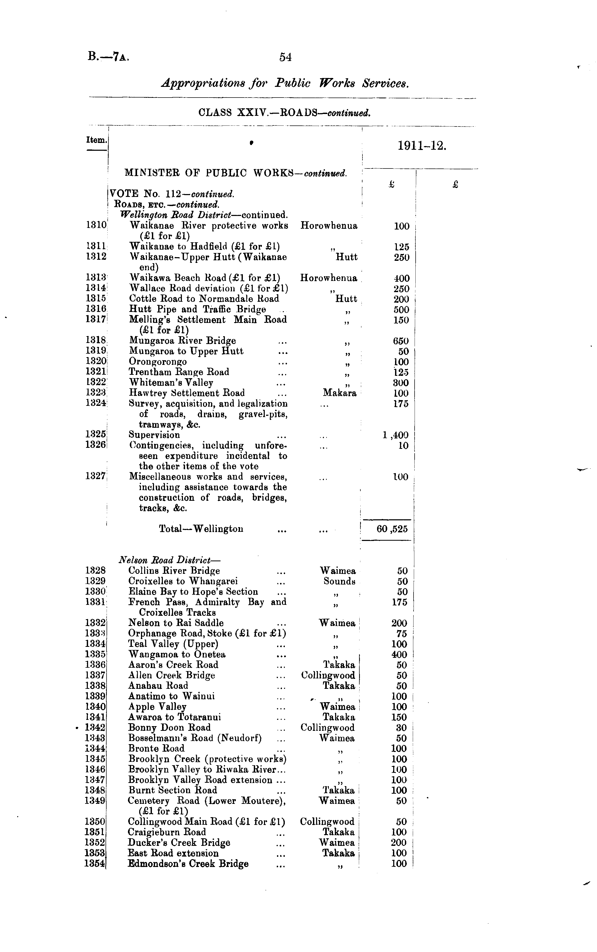 Item. Item. 1911-12. MINISTER OP PUBLIC WORKS-continued. 1310 1311 1312 1313 1314 1315 1316 1317 1318 1319 1320 1321 1322 1323 1324 1325 1326 1327 £ VOTE No. 112— continued. Roads, etc. — continued. Wellington Road District —continued. Waikanae River protective works Horowhenua 100 (£1 for £1) Waikanae to Hadfieki (£1 for £L) „ 125 Waikanae-Upper Hutt (Waikanae Hutt 250 end) Waikawa Beach Road (£1 for £1) Horowhenua 400 Wallace Road deviation (£l for £ I) „ 250 Cottle Road to Normandale Road Hutt 200 Hutt Pipe and Traffic Bridge . „ 500 Mailing's Settlement Main Road „ 150 (£1 for £1) Mungaroa River Bridge ... ,, 650 Mungaroa to Upper Hutt ... „ 50 Orongorongo ... „ 100 Trentham Range Road ... „ 125 Whiteman's Valley ... „ 300 Hawtrey Settlement Road ... Makara 100 Survey, acquisition, and legalization ... 175 of roads, drains, gravel-pits, tramways, &c. Supervision ... ... 1 ,400 Contingencies, including unfore- ... 10 seen expenditure incidental to the other items of the vote Miscellaneous works and services, ... 100 including assistance towards the construction of roads, bridges, tracks, &c. £ Total—Wellington ... ... 60,525 1328 1329 1330 1331 1332 133* 1334 1335 1336 1337 1338 1339 1340 1341 1342 1343 1344 1345 1346 1347 1348 1349 1350 1351 1352 1353 1354 Nelson Road District — Collins River Bridge ... Waimea 50 Croixelles to Whangarei ... Sounds 50 Elaine Bay to Hope's Section ... „ 50 French Pass, Admiralty Bay and „ 175 Croixelles Tracks Nelson to Rai Saddle ... Waimea 200 Orphanage Road, Stoke (£1 for £1) „ 75 Teal Valley (Upper) ... „ 100 Wangamoa to Onetea ... „ 400 Aaron's Creek Road ... Takaka 50 Allen Creek Bridge ... Colliugwood 50 Anahau Road ... Takaka 50 Anatimo to Waiuui ... „ 100 Apple Valley ... Waimea 100 Awaroa to Totaranui ... Takaka 150 Bonny Doon Road ... Collingwood 30 Bosselmann's Road (Neudorf) ... Waimea 50 Bronte Road ... „ 100 Brooklyn Creek (protective works) ,. 100 Brooklyn Valley to Riwaka River... ,, 100 Brooklyn Valley Road extension ... ,, 100 Burnt Section Road ... Takaka 100 Cemetery Road (Lower Moutere), Waimea 50 (£1 for £1) Collingwood Main Road (£1 for £1) Collingwood 50 Craigieburn Road ... Takaka ; 100 Ducker's Creek Bridge ... Waimea 200 East Road extension ... Takaka 100 Edmondson's Creek Bridge ... „ 100