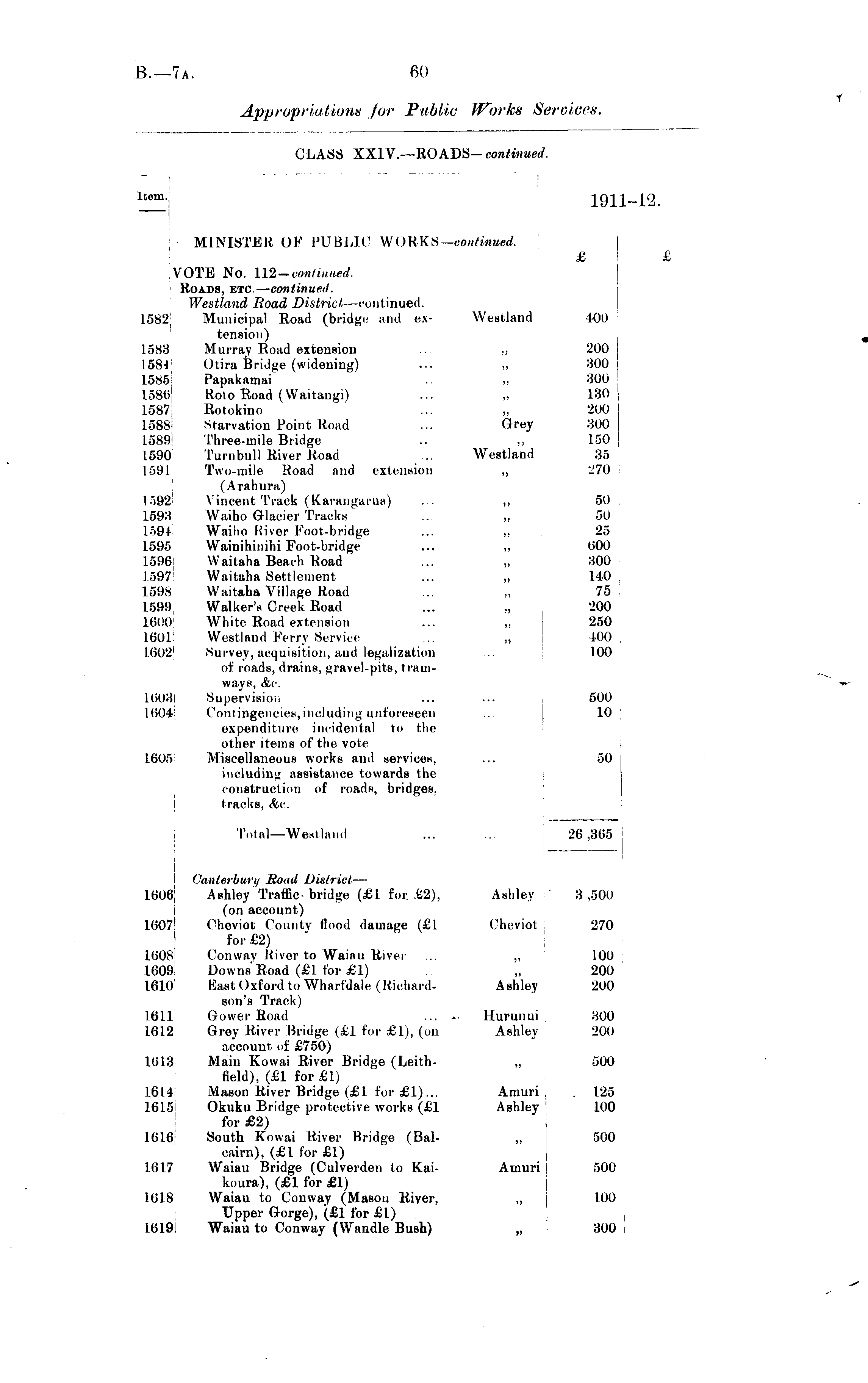 Uem, 1911-12. tern. MINISTER OF PUBLIC WORKS— oontinued. £ VOTE No. 112— continued. Roads, etc. — continued. Westland Road District —continued. 1582J Municipal Road (bridge ami ex- Westland 400 tension) 1583 Murray Boad extension .. ,, 200 1584 Otira Bridge (widening) ... „ 300 1585 Papakamai .. „ 300 1580! Roto Road (Waitangi) ... „ 130 1587 Rotokino ... „ ->W 1588 ; Starvation Point Road ... Grey 300 L688 Three-mile Bridge .. „ 150 1590 Turnbull River Hoad ... Westland 35 1591 Two-mile Road and extension ,, -70 (A rahura) l.)92 Vincent Track (Karangarua) ... „ 50 1593 Waiho Glacier Tracks ... „ 50 1594 Waiiio River Foot-bridge ... ,. 25 ' 1595 Wainihinihi Foot-bridge ... „ 000 1596 Waitaha Beach Road ... „ 300 1597 Waitaha Settlement ... „ 140 1598 Waitaha Village Road ... „ 75 1599 Walker's Creek Road ... ., 200 1600 White Road extension ... „ 250 1001 Westland Ferry Service ... „ 400 L602 Survey, acquisition, and legalization .. 100 of roads, drains, gravel-pits, tramways, &c. L608 Supervisioii ... ... 500 l()04 Contingenciee,including unforeseen ... 10 expenditure incidental to the other items of the vole 1605 Miscellaneous works and services, ... 50 including assistance towards the construction of roads, bridges. tracks, &c. Total —WesUand ... ... 26,365 Canterbury Jtoad District — 1606 Ashley Traffic- bridge (£1 for .62), Ashley 3,500 (on account) KI07 1 Cheviot County flood damage (£1 Cheviot 270 for £2) 1608! Oonway River to Waiau River ... „ 100 1609i Downs' Road (£1 for £1) . „ 200 1610 Bast Oxford to Wharfdale (Richard- Ashley 200 son's Track) 1611 Gower Road ... - Hurunui 300 1612 Grey River Bridge (£1 for £1), (on Ashley 200 account of £750) 1013 Main Kowai River Bridge (Leith- „ 500 field), (£1 for £1) 1614 Mason River Bridge (£1 for £1)... Amuri . 125 1618 Okuku Bridge protective works (£1 Ashley 100 for £2) 1016 South Kowai River Bridge (Bal- „ 500 cairn), (£1 for £1) 1617 Waiau Bridge (Culverden to Kai- Amuri 500 koura), (£1 for £1) 1618 Waiau to Conway (Mason River, „ 100 Upper Gorge), (£1 for £l) 1619: Waiau to Conway (Wandle Bush) „ 300