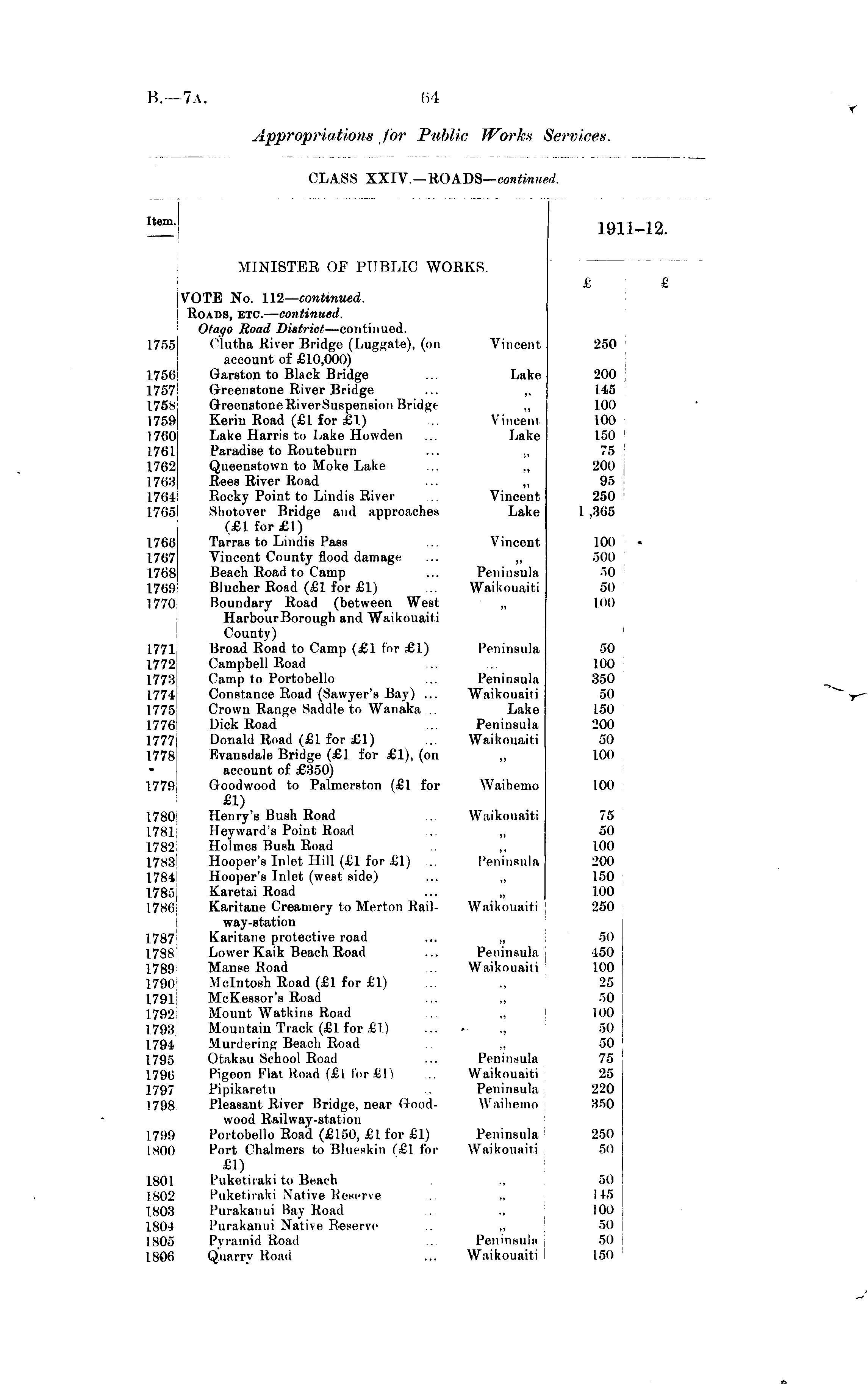tern. item. 1911-12. MINISTER OF PUBLIC WORKS. £ £ 1755 1756 1757 1758; 17591 1760 1761 1762 1763! 1764 1765 1766J 17671 1768! 1769 1770 1755 1756 1757 175s 1759] 1760 1761 1762 1768! 1764 1765 1766' 17671 1768! 1769 1770 1771 1772 L778 17741 1775 1776 ! 1777: 177S 177!) 1780 1781 1782 17«3 1784 1785 1786; 1787 1788 1789 1790 1791 1792 1793! 1794 1795 1796 1797 1798 1799 1S00 1801 1802 1803 180 J ISO") ISOli :l [j VOTE No. 112— continued. Roads, etc. — continued. Otago Road District —continued. Clutha River Bridge (Luggate), (on Vincent account of £10,000) Garston to Black Bridge ... Lake Greenstone River Bridge ... „ Greenstone RiverSuspension Bridge ,, Kerin Road (£1 for £1) ... Vincent Lake Harris to Lake Howden ... Lake Paradise to Routeburn ... ., Queenstown to Moke Lake ... „ Rees River Road ... ,, Rocky Point to Lindis River ... Vincent Shotover Bridge and approaches Lake (£1 for£l) Tarras to Lindis Pass ... Vincent Vincent County flood damage ... n Beach Road to Camp ... Peninsula Blucher Road (£1 for £1) ... Waikouaiti Boundary Road (between West „ HarbourBorough and Waikouaiti County) Broad Road to Camp (£1 for £1) Peninsula Campbell Road Camp to Portobello ... Peninsula Constance Road (Sawyer's Bay) ... Waikouaiti Crown Range Saddle to Wanaka ... Lake Dick Road .. Peninsula Donald Road (£1 for £1) ... Waikouaiti Rvansdale Bridge (£] for £1), (on account of £350) Goodwood to Palmerston (£1 for Waihemo £1) Henry's Bush Road ... Waikouaiti Hey ward's Point Road .. ,, Holmes Bush Road .. ,, Hooper's Inlet Hill (£1 for £1) ... Peninsula Hooper's Inlet (west side) ... „ Karetai Road ... „ Karitane Creamery to Merton Rail- Waikouaiti way-station Karitane protective road ... „ Lower Kaik Beach Road ... Peninsula Manse Road . Waikouaiti Mclntosh Road (£1 for £1) McKessor's Road ... ,, Mount Watkins Road Mountain Track (£1 for £1) ... ■ Murdering Beach Road Otakau School Road ... Peninsula Pigeon Flat Koad (£ I for £1) ... Waikouaiti Pipikaretu . Peninsula Pleasant River Bridge, near (rood- Waihemo wood Railway-station Portobello Road (£150, £1 for £1) Peninsula : Port Chalmers to Blueskin (£l for Waikouaiti £1) Puketiraki to Beafh Puketiraki Native Reserve Purakaiiui Bay Road Purakanui Native Reserve . „ Pyramid Koad ... Peninsula Quarrv Road ... Waikouaiti 250 200 J 145 100 100 150 75 200 95 250 1 ,31)5 100 • 500 50 50 100 50 100 350 50 150 200 50 100 100 75 50 100 200 150 100 250 50 450 100 25 50 100 .ID 50 75 25 220 350 250 50 r>0 I 15 100 50 50 150