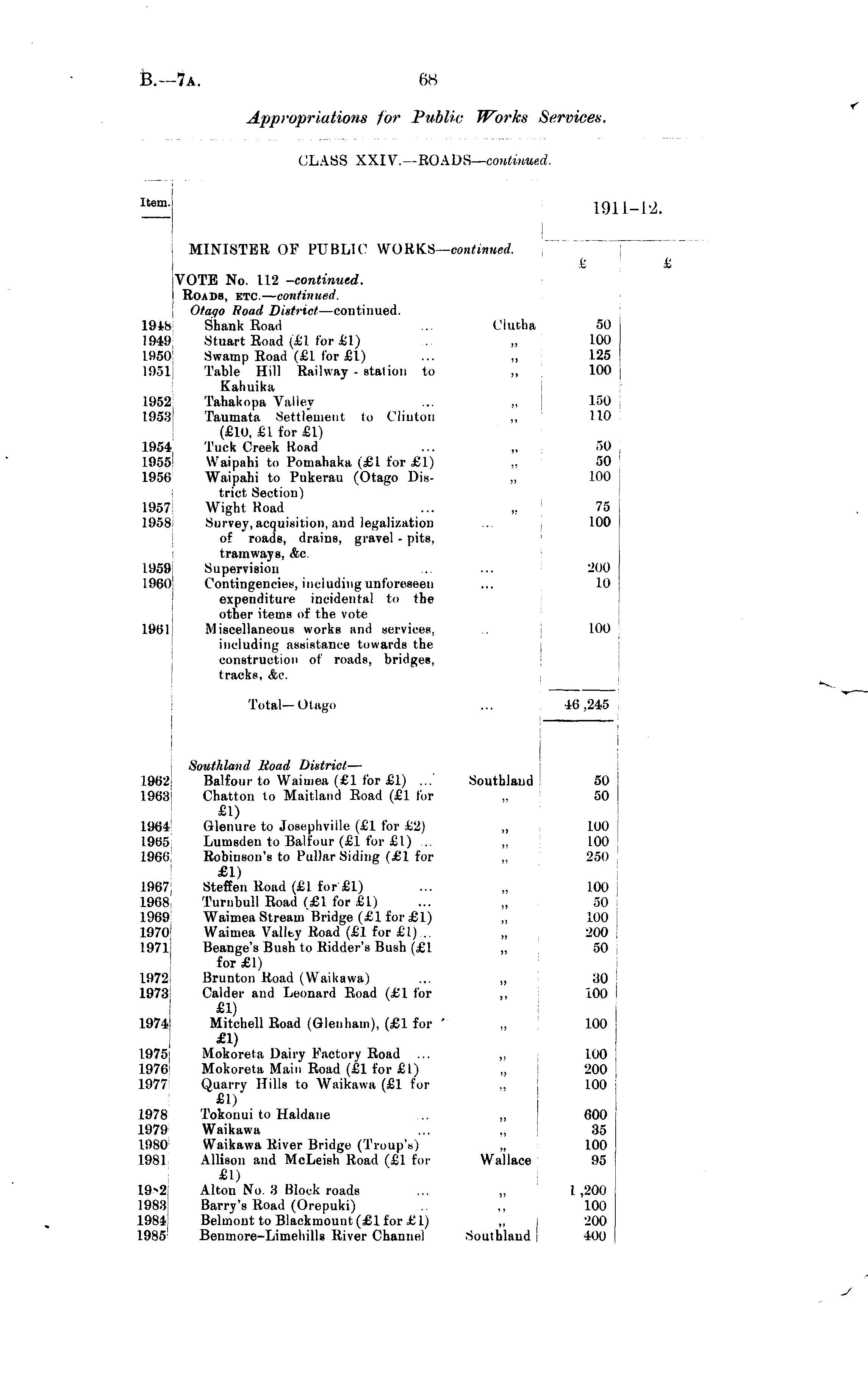 Item. Item. 1911-1-2. MINISTER OP PUBLIC WORKS— continued. £ £ 1948 1949 1950 1951 1952 1953 1954 1955 1956 1957 1958 1959 1960 1961 1948 1949 1950 1951 1952 1953 1954 1955 1956 VOTE No. 112 -continued. Roads, etc. — continued. Otaqo Jioad District —continued. i Shank Road ... Clutha 50 I Stuart Road (£ I for £1) . „ 100 > Swamp Road (£1 for £1) ... „ 125 I Table Hill Railway - station to „ 100 Kahuikii ! Tahakopa Valley ... ,, 150 I Taumata Settlement to Clinton ,, 110 (£10, £1 for £1) Tuck Creek Road ... „ 50 i Waipahi to Pomahaka (£1 for £1) „ 50 i Waipahi to Pukerau (Otago Dis- „ 100 trict Section) Wight Road ... „ 75 ! Survey, acquisition, and legalization ... 100 of roads, drains, gravel - pits, tramways, &c. •! Supervision ... ... 200 l| Contingencies, including unforeseen ... 10 expenditure incidental to the other items of the vote Miscellaneous works and services, .. 100 including assistance towards the construction of roads, bridges, tracks, &c. 1957 1958 1959 1960 1961 1 Total—Otago ... 46,245 1962 1963: 1964 1965 1966 1967 1968 1969 1970 : 1971 1972 1973: 1974 1975' 1976 1977 1978 1979 1980 1981 19-2 1983 1984 1985 ! Southland Road District — Balfour to Waimea (£1 for £1) ... Southland 50 Chatton to Maitland Road (£1 for „ 50 £1) GUenure to Joeephville (£1 for £2) ,, 100 Lumsdeu to Balfour (£1 for £ I) ... „ 100 Robinson's to Pullar Siding (£1 for „ 250 £1) Steffen Road (£1 for £1) ... „ 100 Turnbull Road (£1 for £1) ... „ 50 Waimea Stream'Bridge (£1 for £1) „ 100 Waimea Valley Road (£1 for £1) .. „ 200 Beange's Bush to Ridder's Bush (£1 „ 50 for£l) Brunton Road (Waikavva) ... „ 30 Calder and Leonard Road (£1 for ,, 100 £1) Mitchell Road (Glenhain), (£1 for ' „ 100 £1) Mokoreta Dairy Factory Road ... ,, 100 Mokoreta Main Road (£1 for £1) „ 200 Quarry Hills to Waikawa (£1 for ., 100 £1) Tokonui to Haldane ... „ 600 Waikawa ... „ 35 Waikawa River Bridge (Troup's) „ 100 Allison and McLeieh Road (£1 for Wallace 95 £1) Alton No. 3 Block roads ... „ 1 ,200 Barry's Road (Orepuki) ,, 100 Belm'out to Blackinount(£lfor Jt'lj „ 200 Benmore-Limeliills River Channel Southland 400