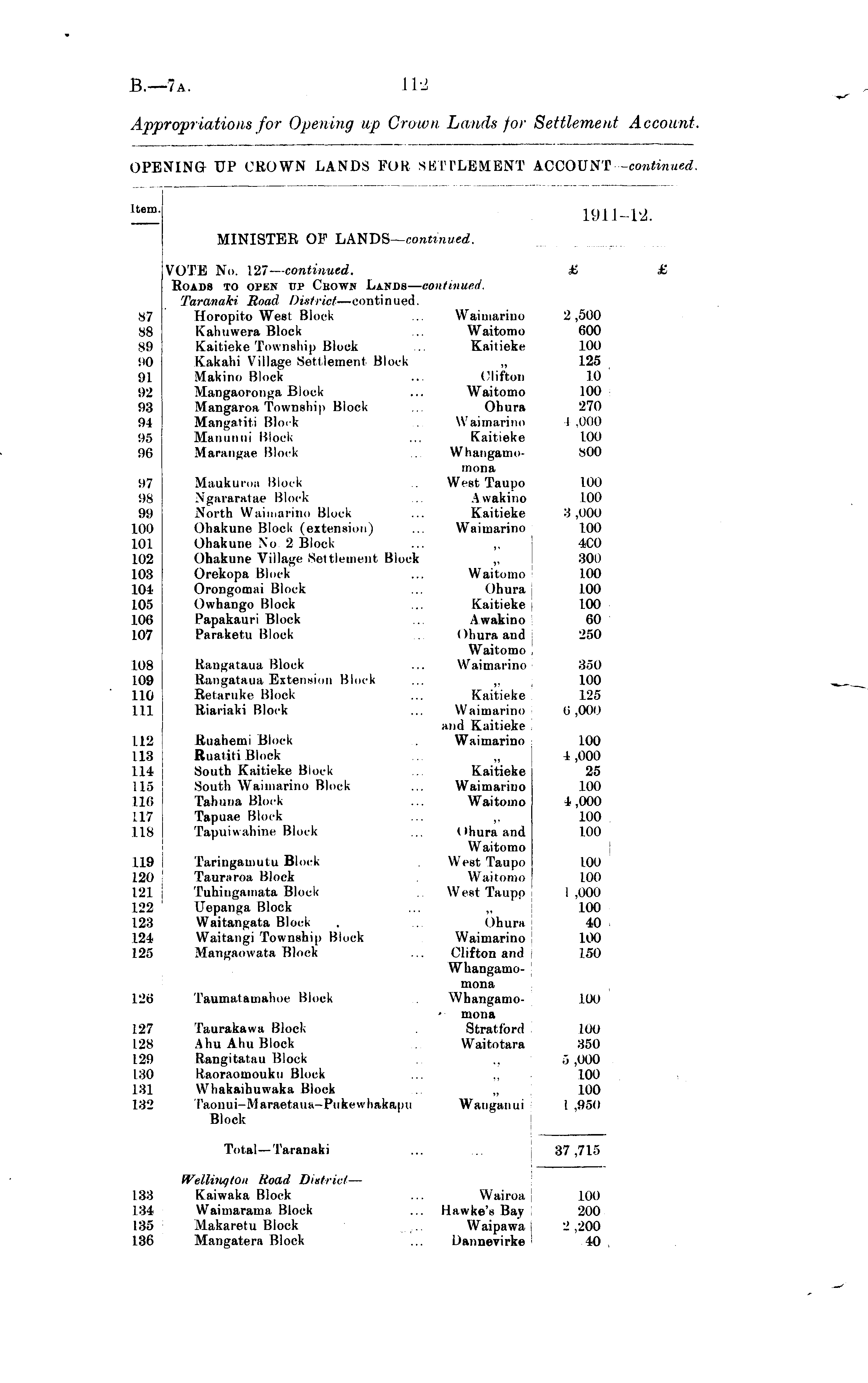 item. tern. 1911-12. MINISTER OF LANDS— continued. , i - 87 88 89 90 91 92 93 94 95 96 97 98 99 100 101 102 103 104 105 106 107 108 109 110 111 1.12 113 i 114 j 115 I 116 i 117 118 119 i 120 121 J 122 123 124 125 126 127 128 129 130 181 132 VOTE No. 127— continued. £ Roads to open up Chown Lands — continued. Taranaki Road District —continued. Horopito Weel Block ... Waimariuo 2,500 Kahuwera Block ... Waitomo 600 Kaitieke Township Block ... Kaitieke 100 Kakahi Village Settlement Block „ 125 Makino Block ... Clifton 10 ' Mangaoronga Block ... Waitomo 100 Mangaroa Township Block ... Ohurn 270 Mangatiti Block . Waimarino I .000 Mamiiiui Block ... Kaitieke 100 Marangae Block . Whangamo- 800 tnona Maukuroa Block . West Taupo 100 Ngararatae Block ... Avvakino 100 North Waimarino Block ... Kaitieke 3,000 Ohakune Block (extension) ... Waimarino 100 Ohakune No 2 Block ... „ 4C0 Ohakune Village Settlement Block ,. 300 Orekopa Block ... Waitomo 100 Orongomni Block ... Ohura 100 Owhango Block ... Kaitieke i 100 Papakauri Block ... Awakino 60 Paraketu Block . Ohura and 250 Waitomo Rangataua Block ... Waimarino 350 Rangataua Extension Block ... ,, 100 Retariike Block ... Kaitieke 125 Riariaki Block ... Waimarino 0,000 and Kaitieke Riiahemi Block . Waimarino 100 Ruatiti Block . „ 1,000 South Kaitieke Block ... Kaitieke 25 South Waimarino Block ... Waimarino 100 Tahuua Block ... Waitomo 4,000 Tapuae Block ... ,. 100 Tapuiwahine Block ... (>hura and 100 Waitomo Taringamutu Block . West Taupo 100 Tauriiroa Block . Waitomo 100 Tuhingainata Block . West Taupo 1.000 llepanga Block ... „ 100 Waitan<;ata Block . .. Ohura 40 Waitangi Township Block Waimarino 100 Mangaowata Block ... Clifton and 150 Whangamomona Taumat amalioe Block . Whangamo- 100 mona Taurakawa Block . Stratford 100 AhuAhu Block ... Waitotara 350 Rangitatau Block ... .. .",.000 Raoraomouku Block ... ,, 100 Whakaihuwaka Block ... „ 100 Taonui-Maraetaua-Piikewhakapu Wanganui 1 ,950 Block £ Total—Taranaki ... ..., 37,715 188 184 135 136 Wellington Road District — Kaiwaka Block ... Wairoa 100 Waimarama Block ... Hawke's Bay 200 Makaretu Block . Waipawa j 2,200 Mangatera Block ... Dannevirke ; 40 .