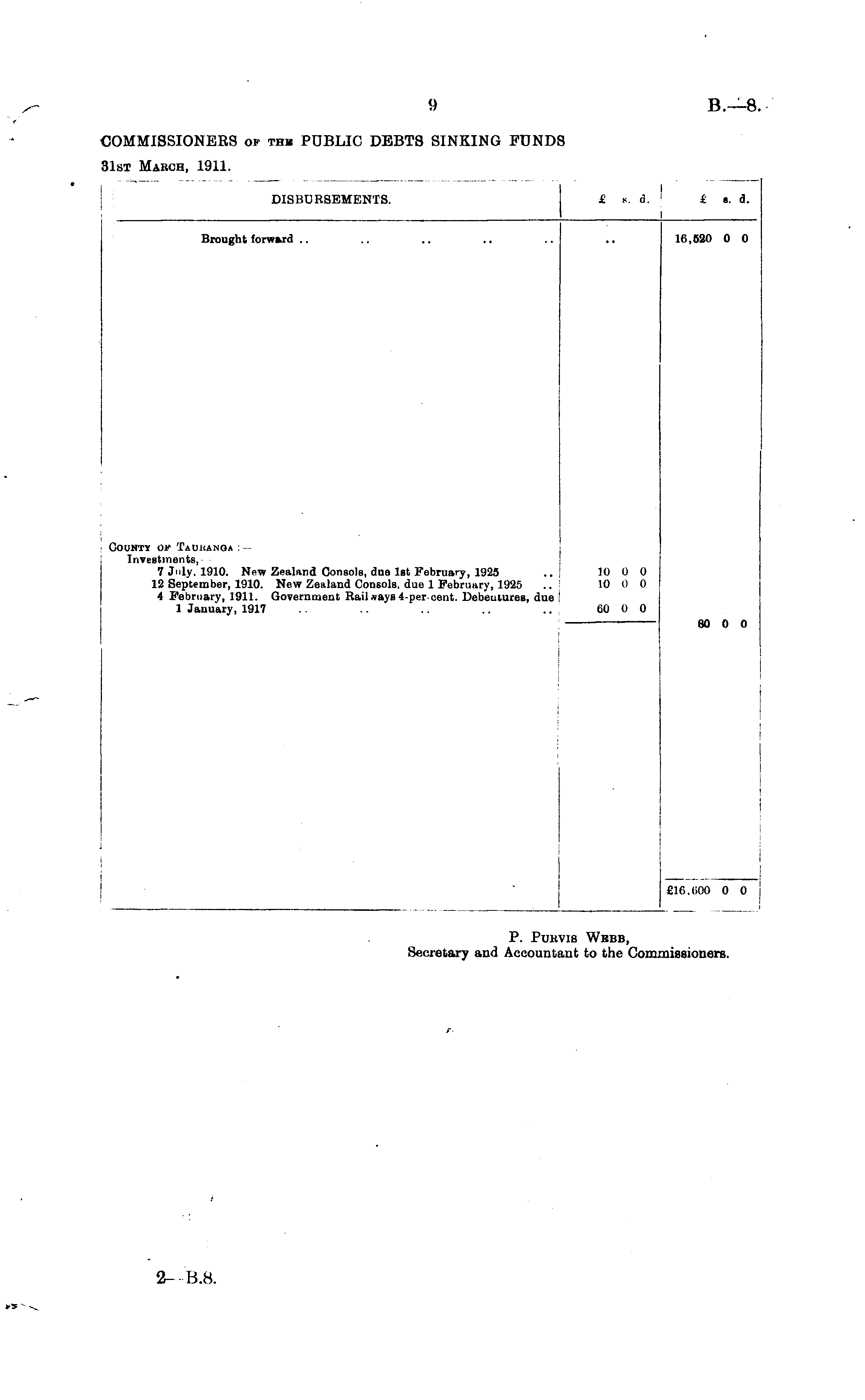 DISBURSEMENTS. i. s. d. £ s. d. Brought forward Hi, 620 0 0 County ok Taukanqa Investments, 7 July. 1910. Npw Zealand Console, due 1st February, 1925 12 September, 1910. New Zealand Consols, due 1 February, 1925 4 February, 1911. Government Rail *ays4-per cent. Debentures, due 1 January, 1917 10 0 0 10 0 0 (iO 0 0 HO 0 0 £16.000 0 0 P. PUKVI8 WbBB, and Accountant to the Commissioners. Secret;