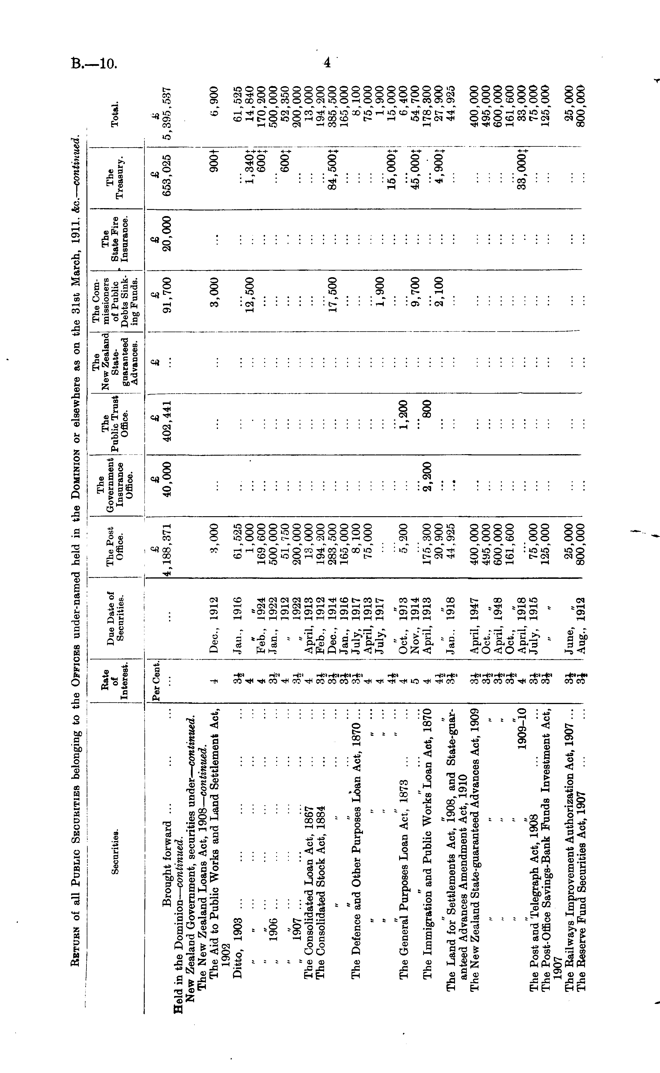 Securities. Rate of Interest. Due Date of Securities. The The Post Government Office. Insurance Office. r The The New Zealand Public Trust StateOffice, guaranteed Advances. The Commissioners of Public Debts Sinking Funds. The State Fire Insurance. The Treasury. The freasury. Total. Per Cent. £ £ 4,188,371 40,000 £ 40,000 £ 402,441 & £ 91,700 £ 20,000 £ 653,025 £ 5,395,537 Brought forward ... eld in the Dominion — continued. New Zealand Government, securities under — continued. The New Zealand Loans Act, 1908— continued. The Aid to Public Works and Land Settlement Act, 1902 Ditto, 1903 ... 1 Dec, 1912 >ec, 1912 3,000 3,000 900+ 6,900 34 4 4 34 34 4 34 34 34 34 4 4 44 4 5 4 44 34 Jan., 1916 an., 1916 '/ tt eb., 1924 an., 1922 „ 1912 „ 1922 pril, 1913 eb., 1912 »ec, 1914 an., 1916 uly, 1917 pril, 1913 61,525 1,000 ... • 169,600 500,000 51,750 200,000 13.000 194,200 283,500 165,000 8,100 75,000 12,500 1,340 I 600| 600: 84,5001 15,000: 45,000J 4,900| 61,525 14,840 170,200 500,000 52,350 200,000 13,000 194,200 385,500 165,000 8,100 75,000 1,900 15,000 6,400 54,700 178,300 27,900 44,925 " 1906 ... „ 1907 ... The Consolidated Loan Act, 1867 The Consolidated Stock Act, 1884 Feb., 1924 Jan., 1922 „ 1912 „ 1922 April, 1913 Feb., 1912 Dec, 1914 Jan., 1916 July, 1917 April, 1913 July, 1917 17,500 tt f , • ■ • tt tr „ ■ ■ ■ • • • The Defence and Other Purposes Loan Act, 1870 ... tt a tt 1,900 uly, 1917 tt a ir The General Purposes Loan Act, 1873 ... Oct., 1913 Nov., 1914 April, 1913 ■eb., 19)3 5,200 1,200 9,700 f , ,, ... The Immigration and Public Works Loan Act, 1870 ov., 1914 pril, 1913 an., 1918 175,300 2,200 20,900 44.925 2,200 "800 2,100 it tt n The Land for Settlements Act, 1908, and State-guar-anteed Advances Amendment Act, 1910 The New Zealand State-guaranteed Advances Act, 1909 Jan.. 1918 . •• 34 34 34 34 34 34 April, 1947 Oct., April, 1948 Oct., , April, 1918 July, 1915 pril, 1947 'ct., pril, 1948 ict., „ — .1 mio 400,000 495,000 600,000 161,600 33,'000J 400,000 495,000 600,000 161,600 33,000 75,000 125,000 ".. "„ 1909-10 The Post and Telegraph Act, 1908 The Post-Office Savings-Bank Funds Investment Act, 1907 The Railways Improvement Authorization Act, 1907 ... The Reserve Fund Securities Act, 1907 it n pril, 1918 uly, 1915 75,000 125,000 34 34 June, „ Aug., 1912 une, ug., 1912 25,000 800,000 25,000 800,000