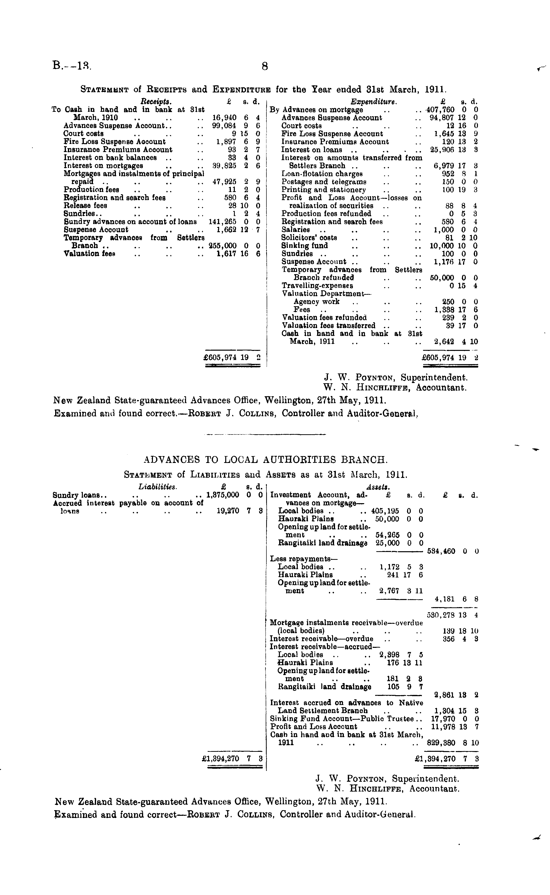 ADVANCES TO LOCAL AUTHORITIES BRANCH. Statement of Liabilities and Assets as at 31st March, 1911. Liabilities. £ s. d. Assets. Sundry loans.. .. .. .. 1,375,000 0 0 Investment Acoount, ad- £ s. d. £ g. d. Accrued interest payable on acoount of vanoes on mortgage— loins .. .. .. .. 19,270 7 8 Local bodies .. .. 405,195 0 0 Hauraki Plains .. 50,000 0 0 Opening up land for settlement .. .. 54,265 0 0 Rangitaiki land drainage 25,000 0 0 534,460 0 0 Less repayments— Local bodies .. .. 1,172 5 8 Hauraki Plains .. 241 17 6 Opening up land for settlement .. .. 2,767 311 4,181 6 8 580,278 13 4 Mortgage instalments reoeivable—overdue (local bodies) .. .. .. 139 18 10 Interest receivable—overdue .. .. 356 4 3 Interest receivable—accrued— Local bodies .. .. 2,898 7 5 Hauraki Plains .. 176 13 11 Opening up land for settlement .. .. 181 2 8 Hangitaiki land drainage 105 9 7 2,861 18 '2 Interest accrued on advances to Native Land Settlement Branch .. .. 1,304 15 8 Sinking Fund Account—Public Trustee .. 17,970 0 0 Profit and Lots Account .. .. 11,978 13 7 Cash in hand and in bank at 31st March, 1911 .. .. .. .. 829,380 8 10 £1,394,270 7 3 £1,394,270 7 3 J. W. Poynton, Superintendent. W. N. Hinchliffe, Accountant. New Zealand State-guaranteed Advances Office, Wellington, 27th May, 1911. Examined and found correct —Robeet J. Collins, Controller and Auditor-General.