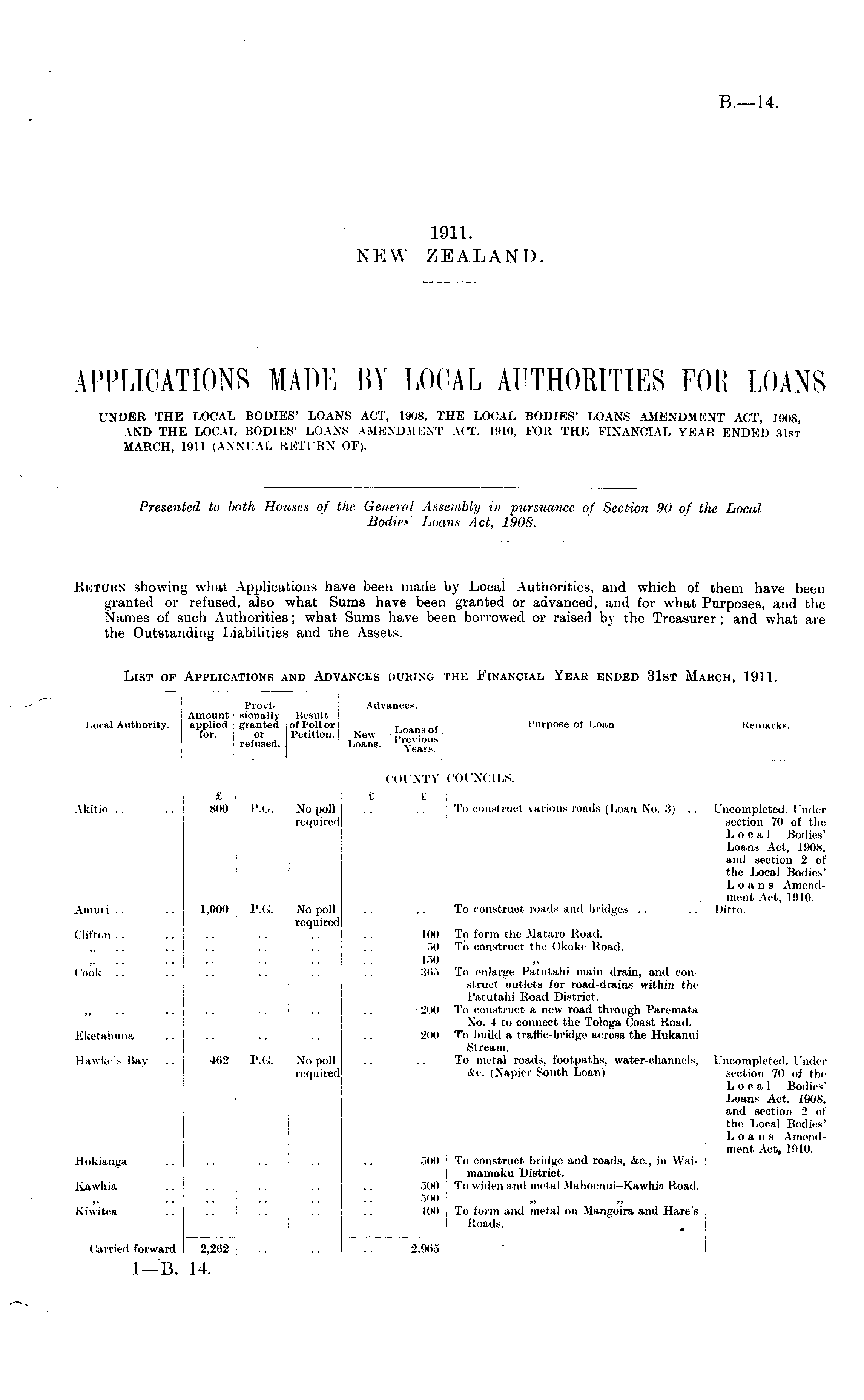 APPLICATIONS MADE BY LOCAL AUTHORITIES FOR LOANS UNDER THE LOCAL BODIES' LOANS ACT, 1908, THE LOCAL BODIES' LOANS AMENDMENT ACT, 1908, AND THE LOCAL BODIES' LOANS AMENDMENT ACT, 1910, FOR THE FINANCIAL YEAR ENDED 31st MARCH, 1911 (ANNUAL RETURN OF).