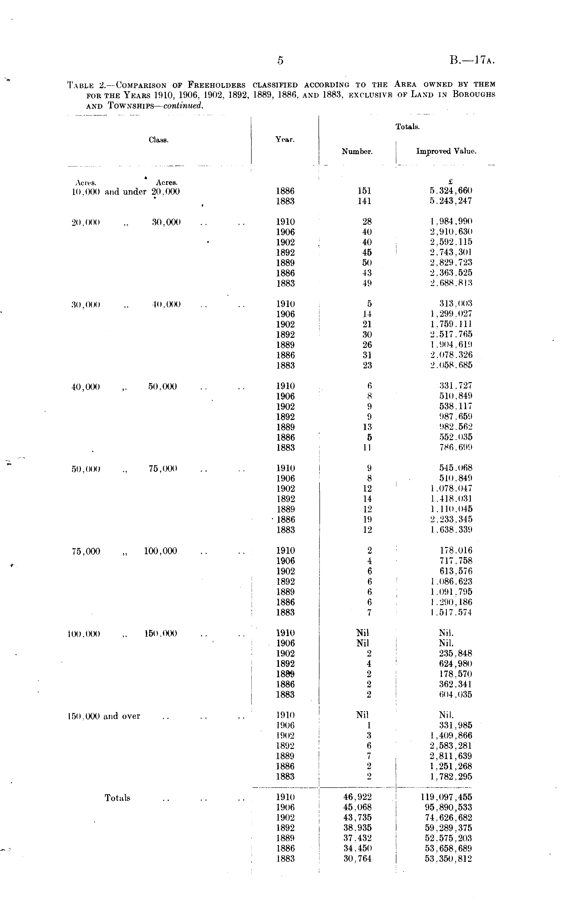 Table 2.—Comparison of Freeholders classified according to the Area owned by them for the Years 1910, 1906, 1902, 1892, 1889, 1886, and 1883, exclusive of Land in Boroughs and Townships— continued.