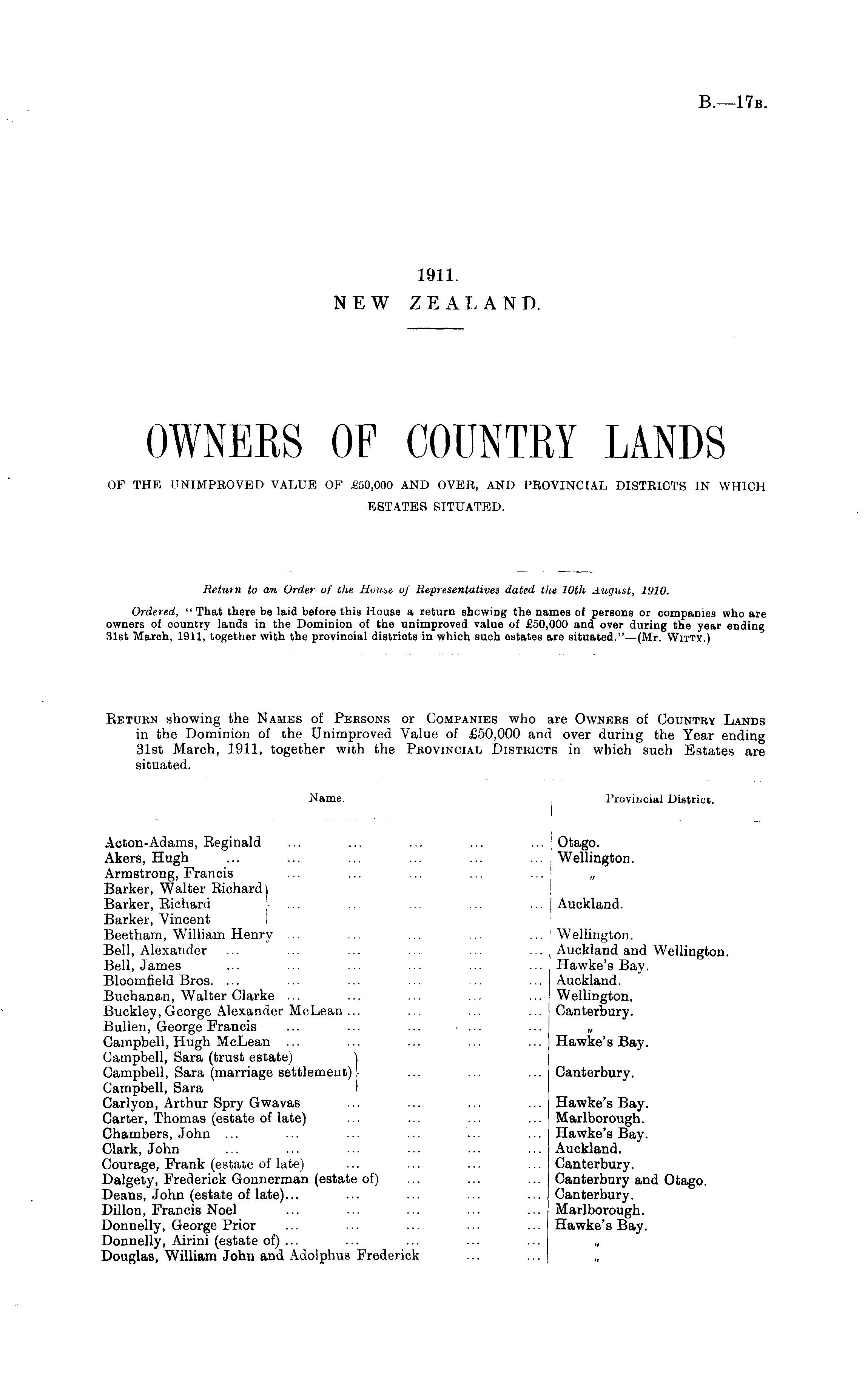 Return to an Order of the Soute oj Representatives dated the 10th August, 1910. Ordered, " That there be laid before thia House a return shewing the names of persons or companies who are owners of country lands in the Dominion of the unimproved value of £50,000 and over during the year ending 31st Maroh, 1911, together with the provincial distriots in which such estates are situated."—(Mr. Witty.)