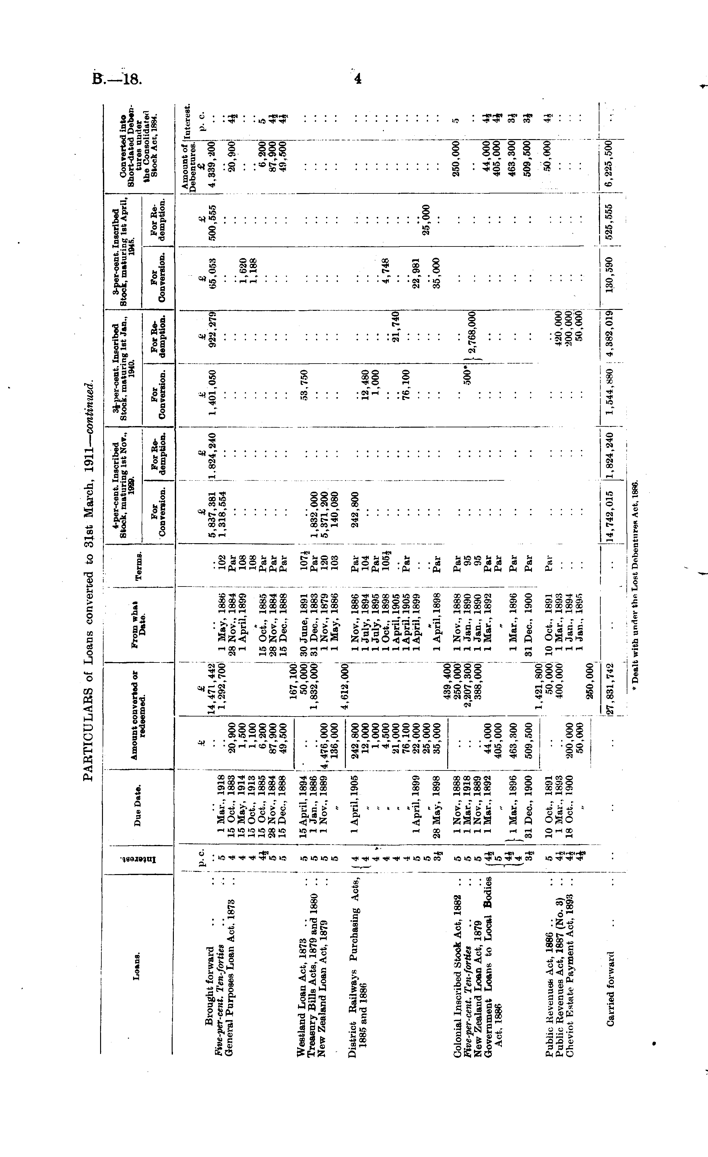 a 4-per-cent. Inscribed Stock, maturing 1st Nov., 1929. 3$-per-cent. Inscribed Stock, maturing 1st Jan., 1940. 3-per-cent. Inscribed Stock, maturing 1st April, 1MB. Converted into Short-dated Debentures under the Consolidated Stock Act, 1884. Loans. Dm- Date. Amount converted or redeemed. From what Date. For Conversion. For Kβdemption. For Conversion. For Redemption. For Conversion. For Bedemption. 1 p. e. Brought forward Fivc-per-cent. Ten-forties .. .. 5 General Purposes' Loan Act. 1873 .. 4 4 4 5 Westland Loan Act, 1873 .. .. 5 Treasury Bills Acts, 1879 and 1880 .. 5 New Zealand Loan Act. 1879 .. j 5 5 t 14,471,442 1,292,700 1 May, 1886 28 Nov., 1884 1 April. 180'J 15 Oct., 1885 28 Nov., 1884 15 Dec. 1888 167,100 50,000| 30 June, 1891 1,832,000 31 Dec, 1883 1 Nov., 1879 ; 1 May, 1886 4,612,000 1 1 Nov., 1886 1 July, 1894 1 July, 1895 1 Oct., 1898 1 April, 1905 1 April. 1905 1 April, 1899 1 April, 1898 439,400 250,000 1 Nov., 188S 2,207, 300| 1 Jan., 1890 388,000 1 Jan.. 1890 1 Mar., 189-2 102 Par 108 108 Par Par Par 107J Par" 120 : 103 Par i 104 Par 105J i Par : Par I Par 95 95 Par Par 5,837,381 1.824,240 1,318,554 1, .'. 5,371,200 140,080 242,800 .. 1,401,050 922.279 65.053 £ 500,555 ! Amount of Iuterest . Debentures. £ p. c. j 4,339,200 1 Mar., 1918 15 Oct., 1883 15 May, 1914 15 Oct., 1913 15 Oct., 1885 28 Nov., 1884 15 Dec, 1888 20,900 1,500 1,100 6,200 87,900 49,500 .. I .. 1,188 • 80,900l 4$ 6,200 5 87,900 4J 49,500 4J •• 15 April. 1894 1 Jan., 1886 1 Nov., 1889 I 53.750 ■ I I 4,476! 000 136,000 ■■ ! District Railways Purchasing Acts ( 4 1885 and 1886 " (4 4 • 4 5 5 34 1 April, 1905 242,800 12,000 1,000 4,500 21,000 76,100 22,000 25,000 35,000 12,480 1,000 .. 2i,740i 4,748 1 April. 1899 76,100 22 1981 25 i000 28 May, 1898 35,000 Colonial Inscribed Stock Act. 1882 .. 5 Five-per-cent. Ten-forties .. .. 5 New Zealand Loan Act, 1879 .. 5 Government Loans to Local Bodies (4£ Act, 1886 J 5 1 Nov., 1888 1 Mar., 1918 1 Nov., 1889 1 Mar.. 1892 ■• 250,000! 5 500* I 2,768,000 405,000 - 44,000 H 405,000 4J 463,300 3J 509,500 3J •■ [ 1 Mar., 1896 31 Dec, 1900 463,300 1 Mar., 1890 ! 31 Dec, 1900 1,421,800 50,000 10 Oct.. 1891 400.000 1 Mar., 1893 1 Jan., 1894 1 Jan., 18'.r> Par Par Par .. 509,500 •■ ! Public Revenue* Act, 1880 .. .. 5 Public Bevenues Act, 1887 (No. 3) .. 4J Cheviot Estate Payment Act, 1893 .. 4J 10 Oct., 1891 1 Mar., 1893 18 Oct., 1900 420,000 ■200,000 50,000 r>0.000 U 200 ', 000 50,000 .. : .. 250,000 Carried forward i27,831,742 .. .. ;14,742,015 1,824,240 j 1,644,880 4.382,019 * Dealt with under ttifi Lost. Dobentures Act. X8R0. 6,225,500| 130,590 525,555