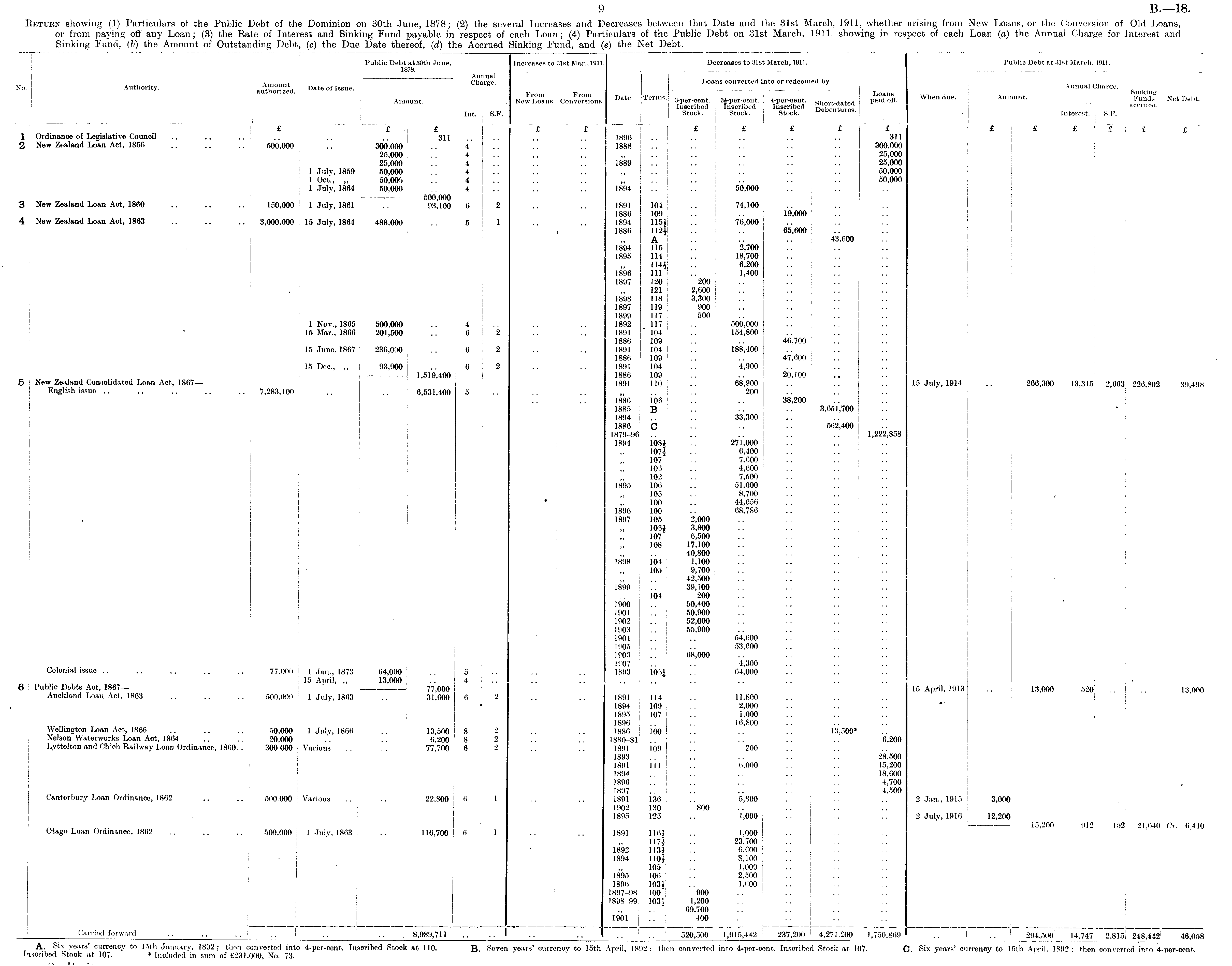 Return showing (1) Particulars of the Public Debt of the Dominion on 30th June, 1878; (2) the several Increases and Decreases between that Date and the 31st March, 1911, whether arising from New Loans, or the Conversion of Old Loans, or from paying off any Loan; (3) the Rate of Interest and Sinking Fund payable in respect of each Loan; (4) Particulars of the Public Debt on 31st March, 1911, showing in respect of each Loan (a) the Annual Charge for Interest and Sinking Fund, (b) the Amount of Outstanding Debt, (c) the Due Date thereof, (d) the Accrued Sinking Fund, and (e) the Net Debt.