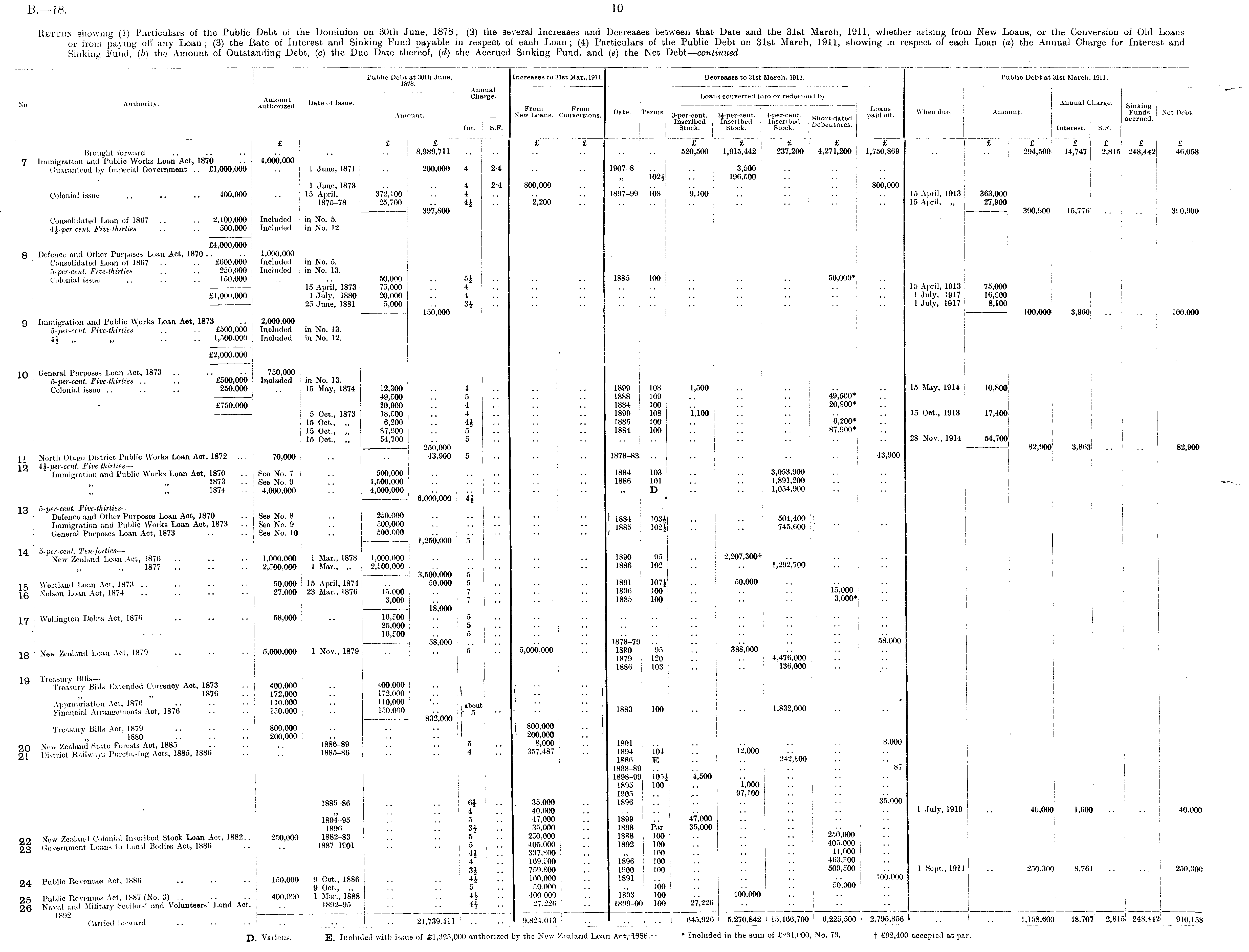 Return showing (1) Particulars of the Public Debt of the Dominion on 30th June, 1878; (2) the several Increases and Decreases between that Date and the 31st March, 1911, whether arising from New Loans, or the Conversion of Old Loans or from paying off any Loan; (3) the Rate of Interest and Sinking Fund payable in respect of each Loan; (4) Particulars of the Public Debt on 31st March, 1911, showing in respect of each Loan (a) the Annual Charge for Interest and Sinking Fund, (b) the Amount of Outstanding Debt, (c) the Due Date thereof, (d) the Accrued Sinking Fund, and (e) the Net Debt — continued.