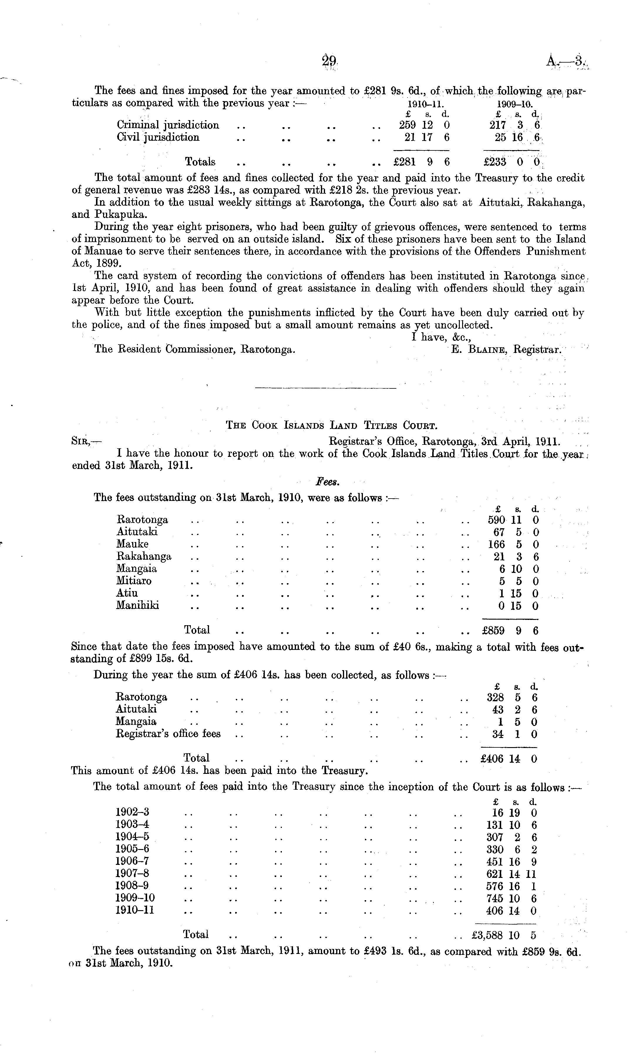 The Cook Islands Land Titles Court. Sir, — Registrar's Office, Rarotonga, 3rd April, 1911. I have the honour to report on the work of the Cook Islands Land Titles Court for the.year. ended 31st March, 1911. Fees. The fees outstanding on 31st March, 1910, were as follows : — £ s. d. Rarotonga .. .. .. .. .. .. 590 11 0 Aitufcaki .. .. .. .. .. .. .. 67 5 0 Mauke .. .. .. .. .. .. 166 5 0 Rakahanga .. .. .. .. .. .. .. 21 3 6 Mangaia .. .. ~ .. .. .. .. 6 10 0 Mitiaro .. .. .. .. .. .. .. 550 Atiu .. .. .. .. .. .. .. 1 15 0 Manihiki .. .. .. .. .. .. .. 0 15 0 Total .. .. .. .. .. .. £859 9 6 Since that date the fees imposed have amounted to the sum of £40 65., making a total with fees outstanding of £899 15s. 6d. During the year the sum of £406 14s. has been collected, as follows :—- -£ s. d. Rarotonga ..... .. .. .. .. .. 328 5 6 Aitutaki .. ...... .. .. .. .. 43 2 6 Mangaia .. .. .. .. .. .. .. 15 0 Registrar's office fees .. .. .. .. .. .. 34 1 0 Total .. .. .. .. .. .. £406 14 0 This amount of £406 14s. has been paid into the Treasury. The total amount of fees paid into the Treasury since the inception of the Court is as follows :—■ £ s. d. 1902-3 .. .. .. .. .. .. .. 16 19 0 1903-4 131 10 6 1904-5 .. .. .. .. .. .. .. 307 2 6 1905-6 .. .. .. .. .. 330 6 2 1906-7 .. .. .. .. .. .. .. 451 16 9 1907-8 .. .. .. .. .. .. .. 621 14 11 1908-9 .. .. .. .. .. .. .. 576 16 1 1909-10 .. .. .. .. .. ..... 745 10 6 1910-11 .. .. .. .. .. .. .. 406 14 0 Total .. .. .. .. .. .. £3,588 10 5 The fees outstanding on 31st March, 1911, amount to £493 Is. 6d., as compared with £859 9s. 6d. on 31st March, 1910.
