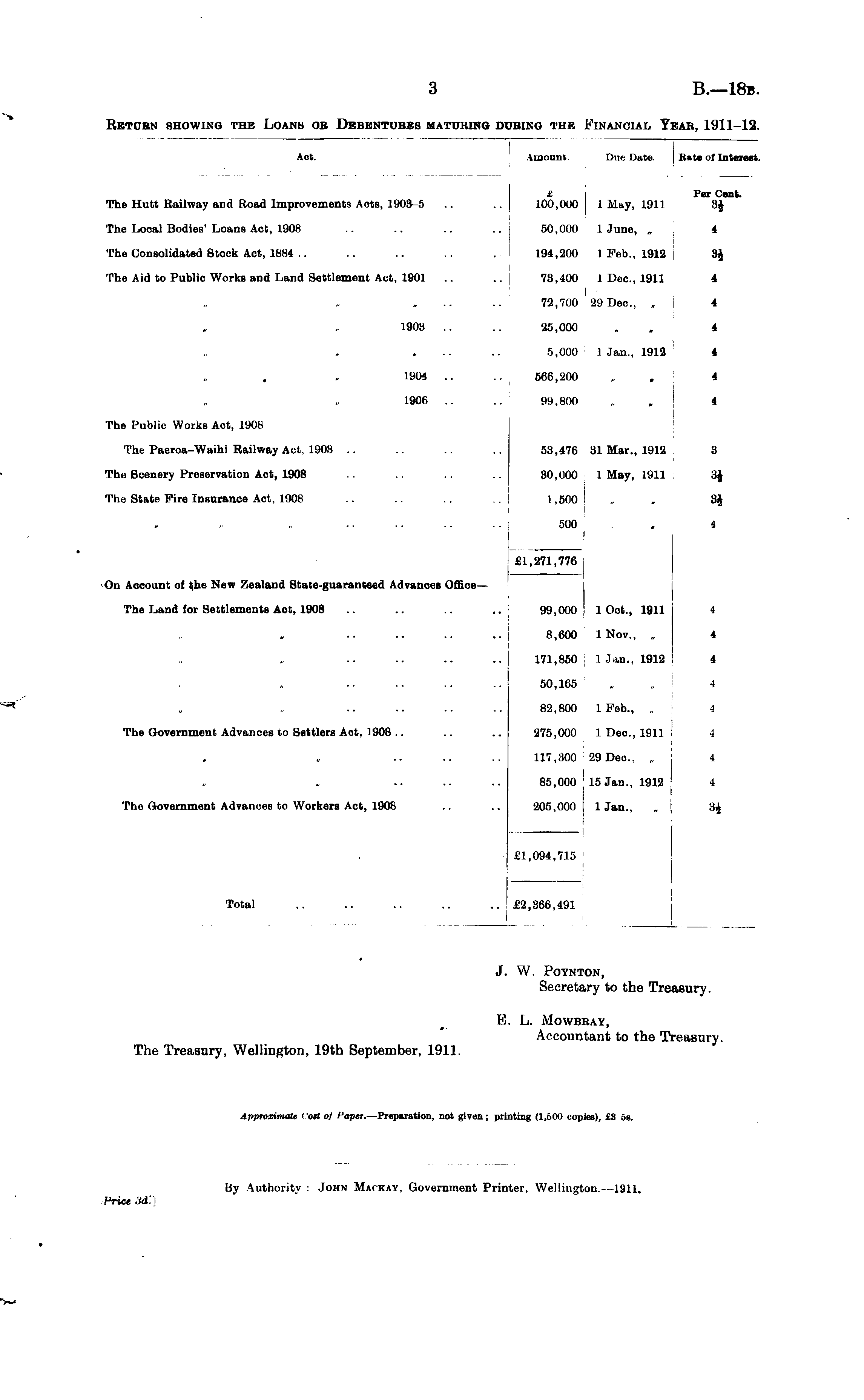 J. W. POYNTON, Secretary to the Treasury. B. L. MowBKAY, Accountant to the Treasury. The Treasury, Wellington, 19th September, 1911.