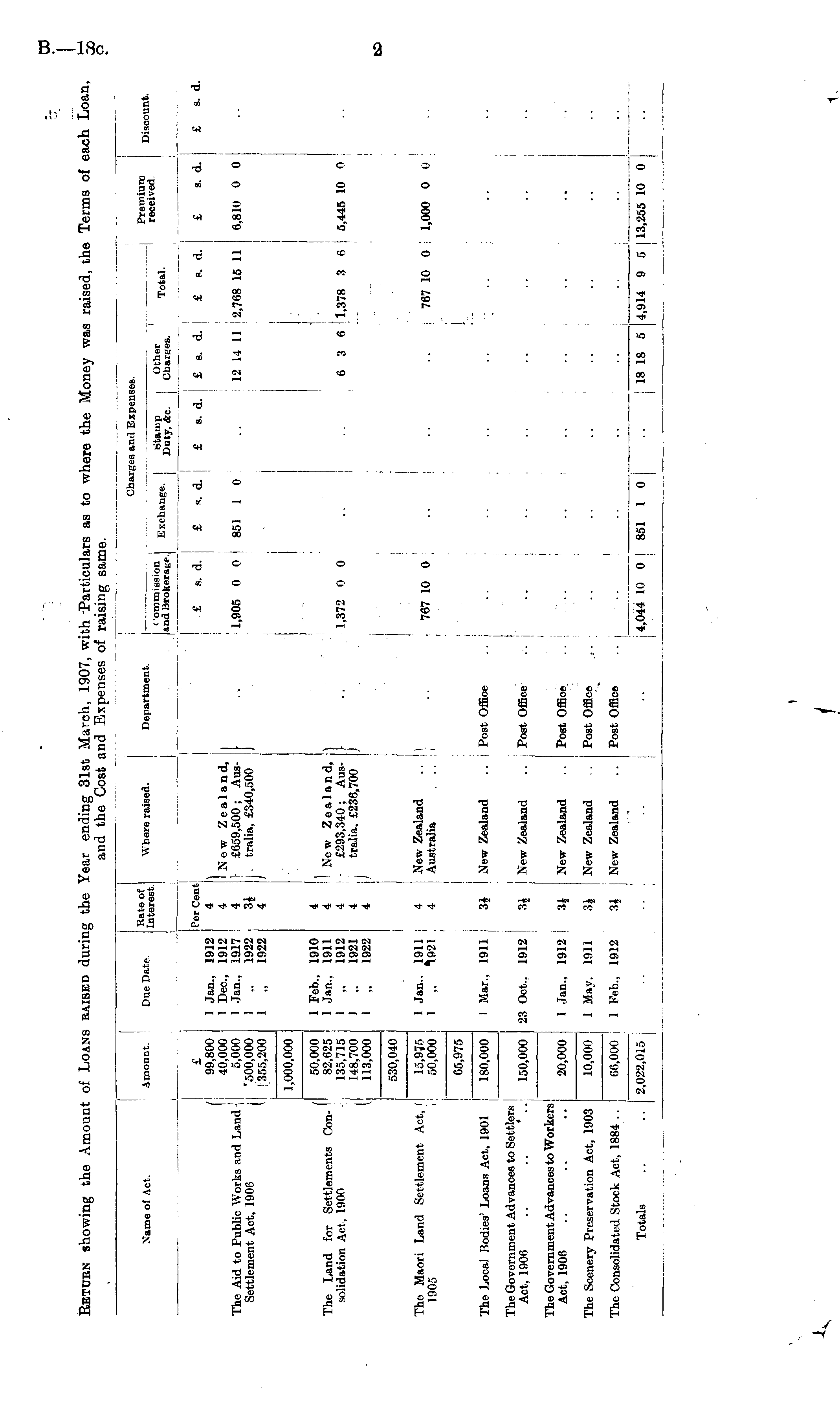 Name of Act. Amount. Due Date. »££ Where raised. _L Department. Charges and Expenses. • ■ommission p vn i, o , 1<T< , I Stamp Other and Brokeras*. "-xebauge. | Duty, <fcc. j Cuarses. Premium received Discount. Total. I I / 99,800 I 40,000 The Aid to Public Works and Landj 5,000 Settlement Act, 1906 '500,000 \ 1355,200 Per Cent 1 Jan., 1912 4 1 Dec, 1912 4 1 Jan., 1917 4 1 ,. 1922 3| 1 „ 1922 4 llJew Zealand, I- £659,500; AusI tralia, £340,500 I £ s. d. £ 1,905 0 0 851 1,372 0 0 1 s. d. 1 0 £ i s. d. £ e. d. £ s. d. £ s. d. 12 14 11 2,768 15 11 6,810 0 0 6 3 6 1,378 S 6 j 5,445 10 0 ' £ 8. d. 1,000,000 / 50,000 The Land for Settlements Con- 82,625 solidation Act, 190(1 135,715 148,700 I 113,000 1 Feb., 1910 4 I Jan.. 1911 4 1 „ 1912 4 1 .. 1921 4 1 „ 1922 4 ' Ne w Zealand, £293,340 ; Australia, £236,700 530,040 The Maori Land Settlement Act, ( 15,9J5 1906 50,000 New Zealand Australia . .. 767 10 0 : 767 10 0 1,000 0 0 1 Jan.. 1911 4 1 ,. 11921 4 The Local Bodies' Loans Act, 1901 180,000 65,975 New Zealand 180,000 I Mar.. 1911 3£ Post Office Post Office Post Office Post Office Post Office •■ , u [_ 1 The Government Advances to Settlers Act, 1906 .. .. ' . . 150,000 23 Oct.. 1912 3£ New Zealand 150,000 The Government Advances to Workers Act, 1906 .. .. .. 20,000 i 20,000 1 Jan., 1912 i 3± New Zealand The Scenery Preservation Act, 1903 10,000 10,000 66,000 1 May. 1911 - 3£ New Zealand The Consolidated Stock Act, 1884 . . 66,000 1 Feb., 1912 3J New Zealand I Totals .. .. 2,022,015 . 2,022,015 4,044 10 0 1 851 I 1 0 ; 18 18 5 4,914 9 5 j 13,255 10 0 18 18 5 4,914 9 5 j 13,255 10 0