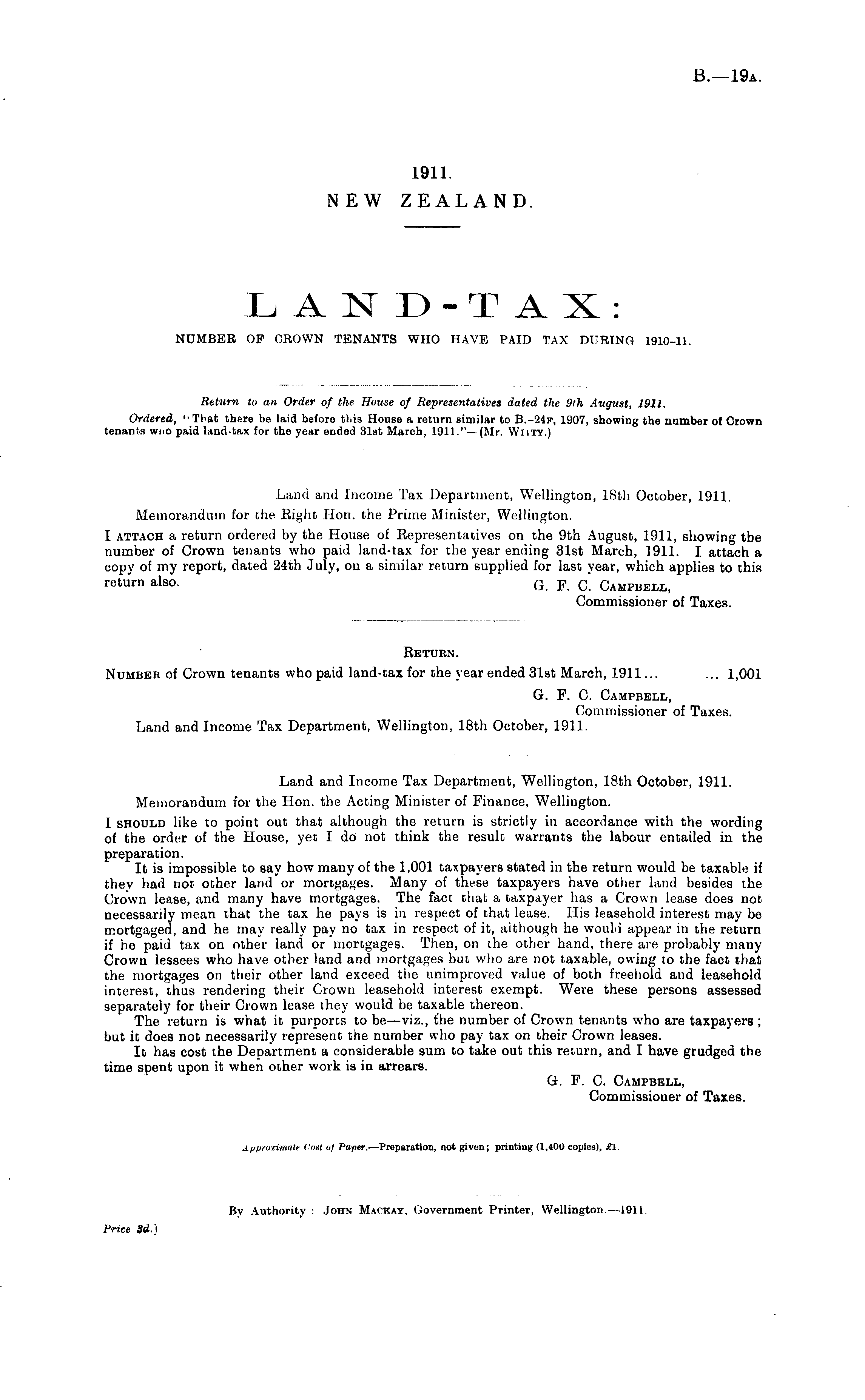Return. Number of Crown tenants who paid land-tax for the year ended 31st March, 1911... ... 1,001 G. P. C. Campbell, Commissioner of Taxes. Land and Income Tax Department, Wellington, 18th October, 1911.