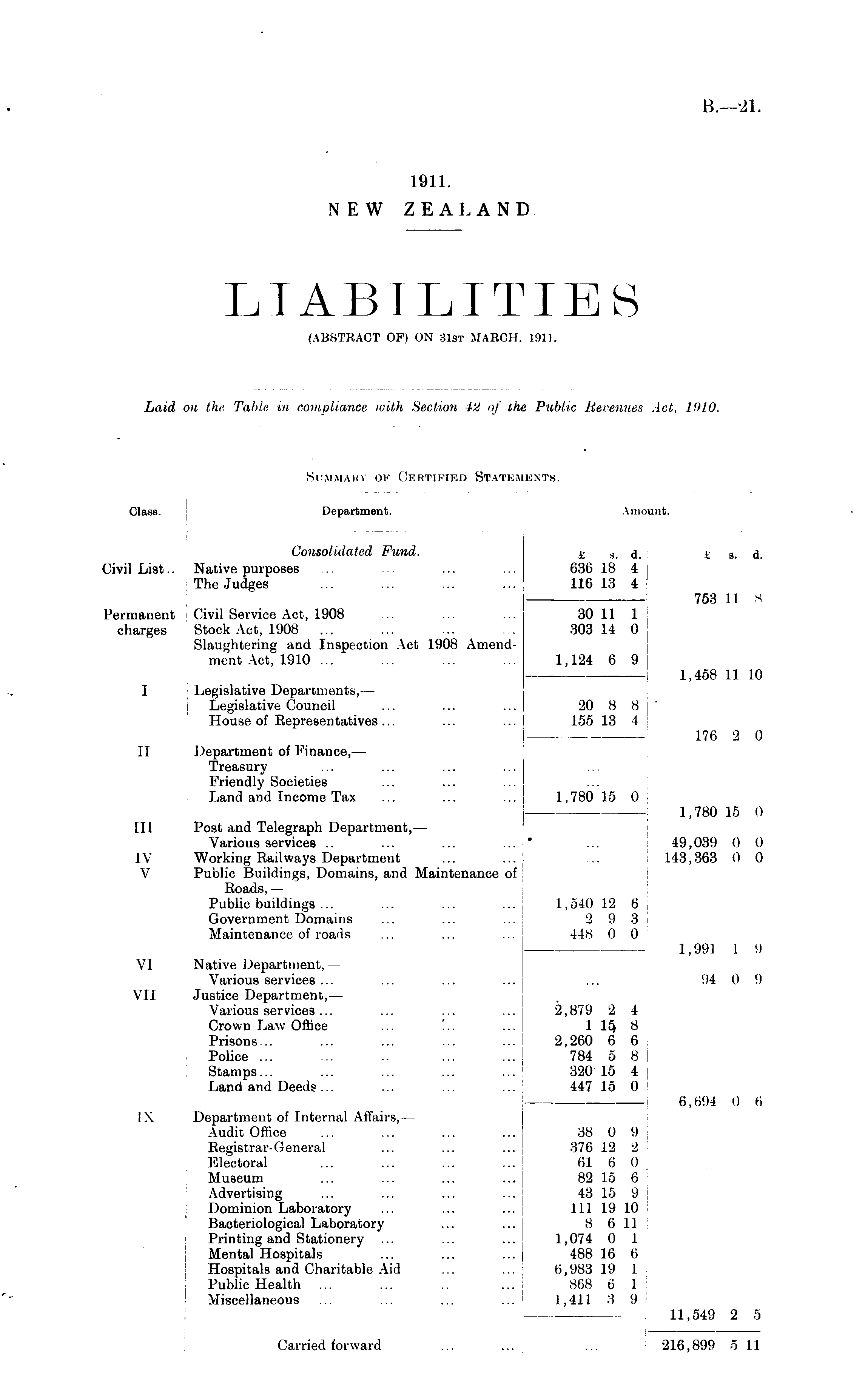 Class. Department. Amount. I t s. d. 636 18 4 116 13 4 30 11 1 303 14 0 1,124 6 9 t s. d. 753 11 H 1,458 11 10 Consolidated Fund. Civil List.. Native purposes The Judges Permanent ■ Civil Service Act, 1908 charges Stock Act, 1908 ... Slaughtering and Inspection Act 1908 Amendment Act, 1910 ... I Legislative Departments,— Legislative Council House of Representatives ... 20 8 8 • 155 13 4 II Department of Finance, — Treasury Friendly Societies Land and Income Tax 1,780 15 0 III Post and Telegraph Department,— Various services .. IV Working Eailways Department V Public Buildings, Domains, and Maintenance of Eoads, — Public buildings ... Government Domains Maintenance of roads 1,780 15 0 • 49,039 0 143,363 0 0 0 1,540 12 2 9 I IS 0 6 3 0 VI Native Department,-— Various services ... VII Justice Department,— Various services ... Crown Law Office Prisons... Police ... Stamps... Land and Deeds ... 2,879 2 1 1 15, 8 2,260 6 6 784 5 8 320 15 4 447 15 0 ± , iJV 1 94 0 ;/ 9 1 X Department of Internal Affairs, — Audit Office Registrar-G eneral Electoral Museum Advertising Dominion Laboratory Bacteriological Laboratory Printing and Stationery Mental Hospitals Hospitals and Charitable Aid Public Health ... Miscellaneous 6,694 0 6 38 0 it 376 12 2 61 6 0 82 15 6 43 15 9 111 19 10 8 6 11 1,074 0 1 488 16 6 6,983 19 1 868 6 1 1,411 3 9 1 11,549 2 5 Carried forward 216,899 5 11