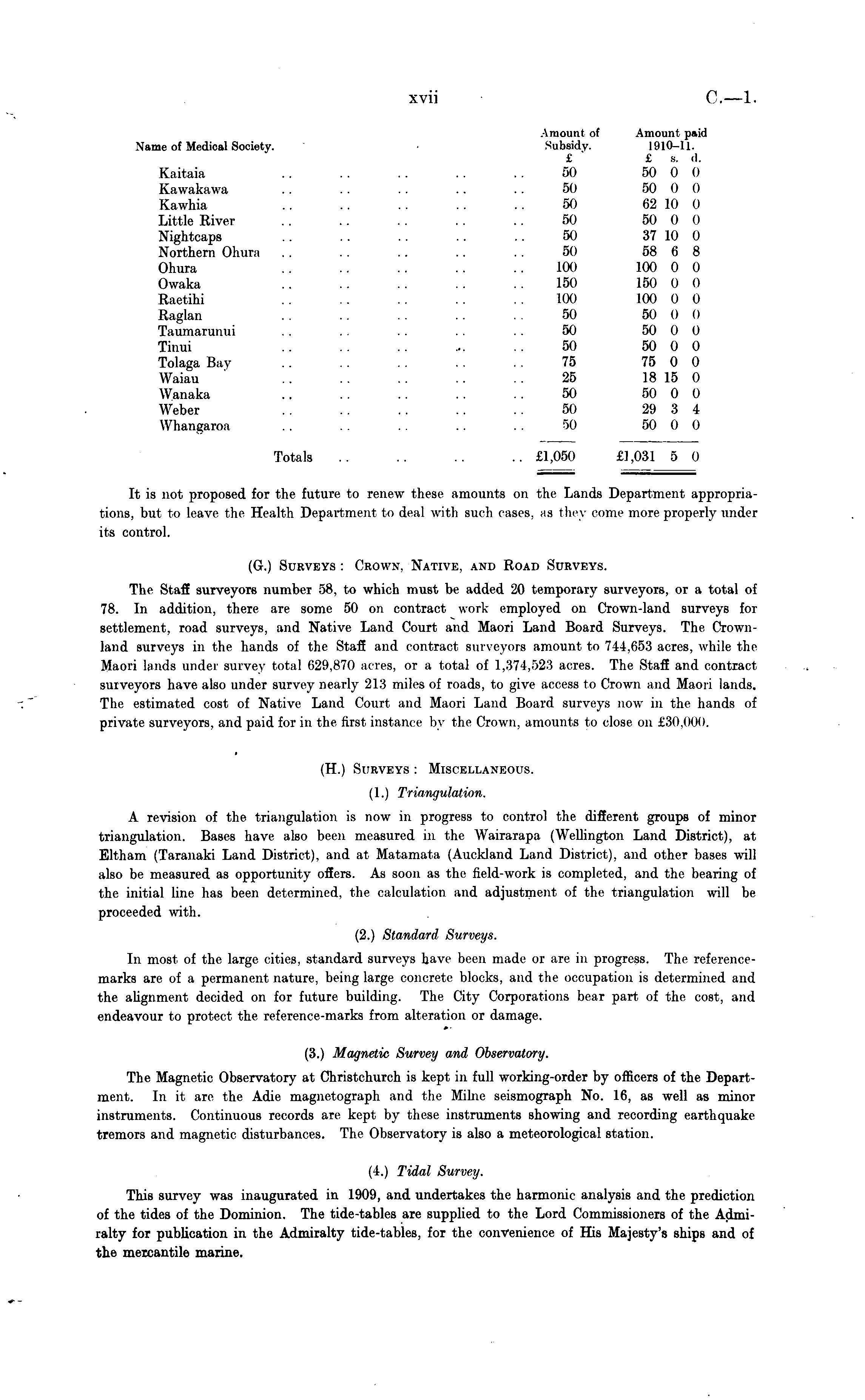 Amount of Amount paid Name of Medical Society. Subsidy. 1910-11. £ £ s. d. Kaitaia .. .. .. .. .. BO 50 0 n Kawakawa .. .. .. .. .. BO 50 0 0 Kawhia .. .. .. .. .. 50 62 10 0 Little River . . .. . . . . . . 50 50 0 0 Nightcaps .. .. .. .. .. 50 37 10 0 Northern Ohura . . . . .. .. . . 50 58 6 8 Ohuia .. .. .. .. .. 100 100 0 0 Owaka .. .. .. .. .. 150 150 0 O Raetihi .. .. .. .. . . 100 100 0 0 Raglan .. .. .. .. .. 50 50 0 0 Taumaruimi .. .. .. .. .. 50 50 0 0 Timii .. .. .. ... .. 50 50 0 0 Tolaga Bay .. .. .. .. .. 75 75 0 0 W'aiau . . .. . . . . .. 25 18 15 0 Wanaka 50 50 0 0 Weber .. .. .. .. .. 50 29 3 4 Whangama .. . . . . . . . . 50 50 0 0 Totals .. .. .. .. £1,050 £1,031 5 0 It is not proposed for the future to renew these amounts on the Lands Department appropriations, but to leave the Health Department to deal with such cases, as they come more properly under its control. (G.) Surveys : Crown, Native, and Road Surveys. The Staff surveyors number 08. to which must be added 20 temporary surveyors, or a total of 78. In addition, there are some 60 on contract work employed on Crown-land surveys for settlement, road surveys, and Native Land Court and Maori Land Board Surveys. The Crownland surveys in the hands of the Staff and contract surveyors amount to 744.653 acres, while the Maori lands under survey total 629,870 acres, or a total of 1,374,523 acres. The Staff and contract smveyors have also under survey nearly 213 miles of roads, to give access to Crown and Maori lands. The estimated cost of Native Land Court and Maori Land Board surveys now in the hands of private surveyors, and paid for in the first instance by the Crown, amounts to close on £30,(101). (H.) Subveys : Miscellaneous. (1.) Triangulation. A revision of the triangulation is now in progress to control the different groups of minor triangulation. Bases have also been measured in the Wairarapa (Wellington Land District), at Eltham (Taranaki Land District), and at Matamata (Auckland Land District), and other bases will also be measured as opportunity offers. As soon as the field-work is completed, and the bearing of the initial line has been determined, the calculation and adjustment of the triangulation will be proceeded with. (2.) Standard Surveys. In most of the large cities, standard surveys have been made or are in progress. The referencemarks are of a permanent nature, being large concrete blocks, and the occupation is determined and the alignment decided on for future building. The City Corporations bear part of the cost, and endeavour to protect the reference-marks from alteration or damage. (3.) Magnetic Survey and Observatory, The Magnetic Observatory at Christchurch is kept in full working-order by officers of the Department. In it are the Adie magnetograph and the Milne seismograph No. 16, as well as minor instruments. Continuous records are kept by these instruments showing and recording earthquake tremors and magnetic disturbances. The Observatory is also a meteorological station. (I.) Tidal Survey. This survey was inaugurated in 1909, and undertakes the harmonic analysis and the prediction of the tides of the Dominion. The tide-tables are supplied to the Lord Commissioners of the Admiralty for publication in the Admiralty tide-tables, for the convenience of His Majesty's ships and of the mercantile marine.