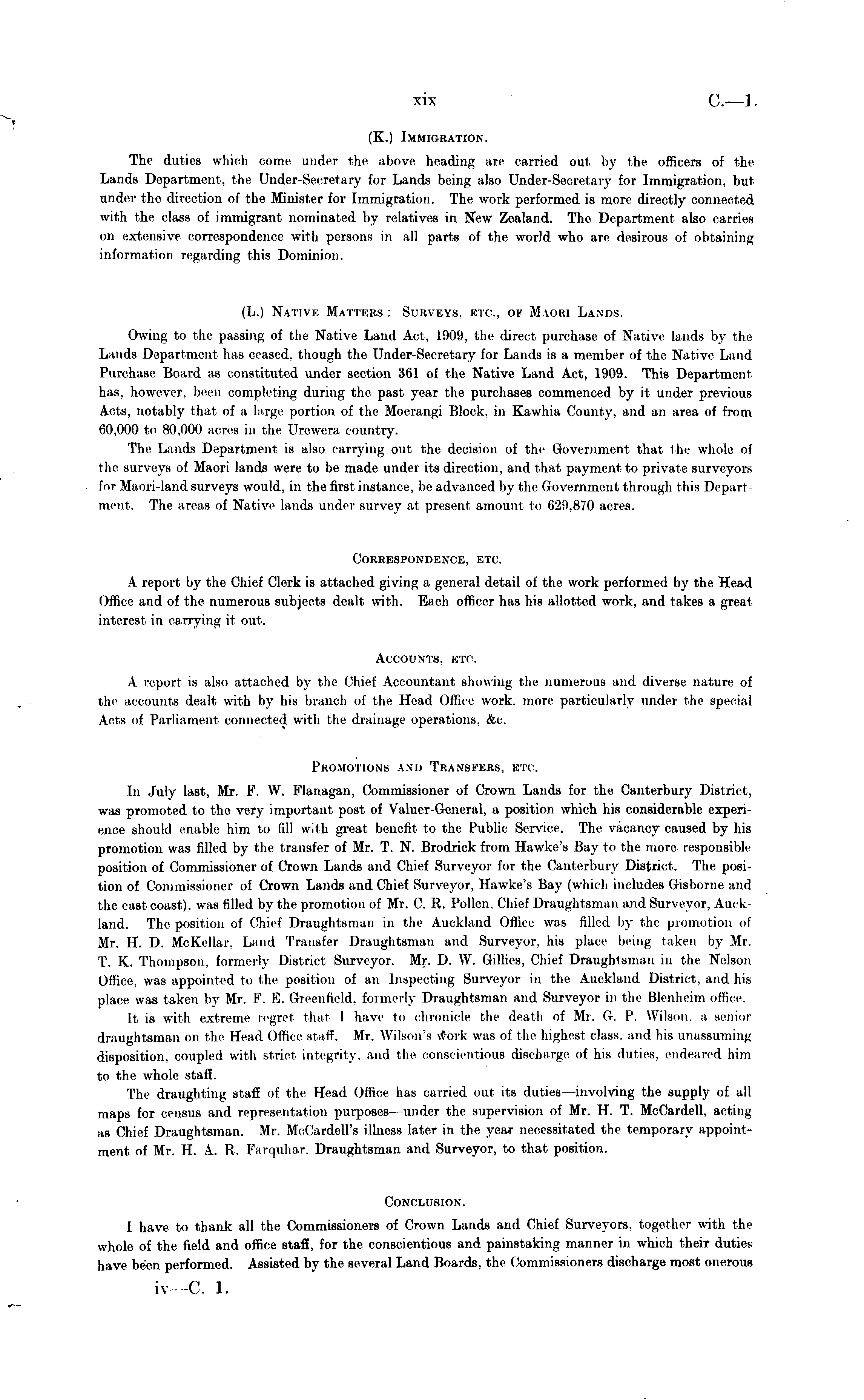 (K.) Immigration. The duties which come, under the above heading are carried out by the officers of the Lands Department, the Under-Secretary lor Lands being also Under-Secretary for Immigration, but under the direction of the Minister for Immigration. The work performed is more directly connected with the class of immigrant nominated by relatives in New Zealand. The Department also carries on extensive correspondence with persons in all parts of the world who are desirous of obtaining information regarding this Dominion. (L.) Native Hatters : Surveys, etc., ok Maori Lands. Owing to the passing of bhe Native Land Act, 1909, the direct purchase of Native hinds by the Lands Department Las oeased, though the Under-Secretary for Lands is a member of the Native Land Purchase Board as constituted under section 361 of the Native Land Act, 1909. This Department has, however, been completing during the past year the purchases commenced by it under previous Acts, notably that of a large portion of the Moerangi Block, in Kawhia County, and an area of from 60,000 to 80.000 acres in the Urewera country. The Lands Department is also carrying out the decision of the- Government that the whole of ibe surveys of Maori lands were to be made under its direction, and that payment to private surveyors for Maori-land surveys would, in the first instance, be advanced by the Government through this Depart ment. The areas of Native lands under survey at present amount to 629,870 acres. Corresponded ■)■;. etc. A report by the Chief Clerk is attached giving a general detail of the work performed by the Head Office and of the numerous subjects dealt with, E&ofc officer has his allotted work, and takes a great interest in carrying it out. Accounts, etc. A report is also attached by the Chief Accountant showing the numerous and diverse nature of the accounts dealt with by his branch of the Head Office work, more particularly under the special Aits of Parliament connected with the drainage operations. &c. Promotions ami Transfers, etc. In July last, Mr. F. W. Flanagan, Commissioner of Crown Lands for the Canterbury District, was promoted to the very important post of Valuer-General, a position which his considerable experience should enable him to fill with great benefit to the Public Service. The vacancy caused by his promotion was filled by the transfer of Mr. T. N. Brodrick from Hawke's Bay to the more responsible position of Commissioner of Crown Lands and Chief Surveyor for the Canterbury District. The position of Commissioner of Crown Lands and Chief Surveyor, Hawke's Bay (which includes Gisborne and the cast coast), was filled by the promotion of Mr. C. R. Pollen. Chief Draughtsman and Surveyor, Auckland. The position of Chief Draughtsman in the Auckland Office was filled by the promotion of Mr. H. D. McKellar. Land Transfer Draughtsman ami .Surveyor, his place being taken by Mr. T. K. Thompson, formerly District Surveyor. Mr. I). W. Gillies. Chief Draughtsman in the Nelson Office, was appointed to the position of an Inspecting Surveyor in tin , Auckland District, and his place was taken by Mr. B\ E. Greenfield, formerly Draughtsman and Surveyor in the Blenheim office. It is with extreme regret thai I have to chronicle the death of Mr. G. P. Wilson, a. senior draughtsman on the Head Office staff. Mr. Wilson's work was of the highest class, and his unassuming disposition, coupled with strict integrity, and the conscientious discharge of Ins duties, endeared him to the whole staff. The draughting staff of the Head Office has carried out its duties —involving the supply of all maps for census and representation put poses —under the supervision of Mr. H. T. McCardell. acting as Chief Draughtsman. Mr. McCardell's illness later in the yea* necessitated the temporary appointment of Mr. H. A. R. Farquhar, Draughtsman and Surveyor, to that position. Conclusion. I have to thank all the Commissioners of Crown Lands and Chief Surveyors, together with the whole of the field and office staff, for the conscientious and painstaking manner in which their duties have been performed. Assisted by the several Land Boards, the ( onunissioners discharge most onerous iv C. 1.