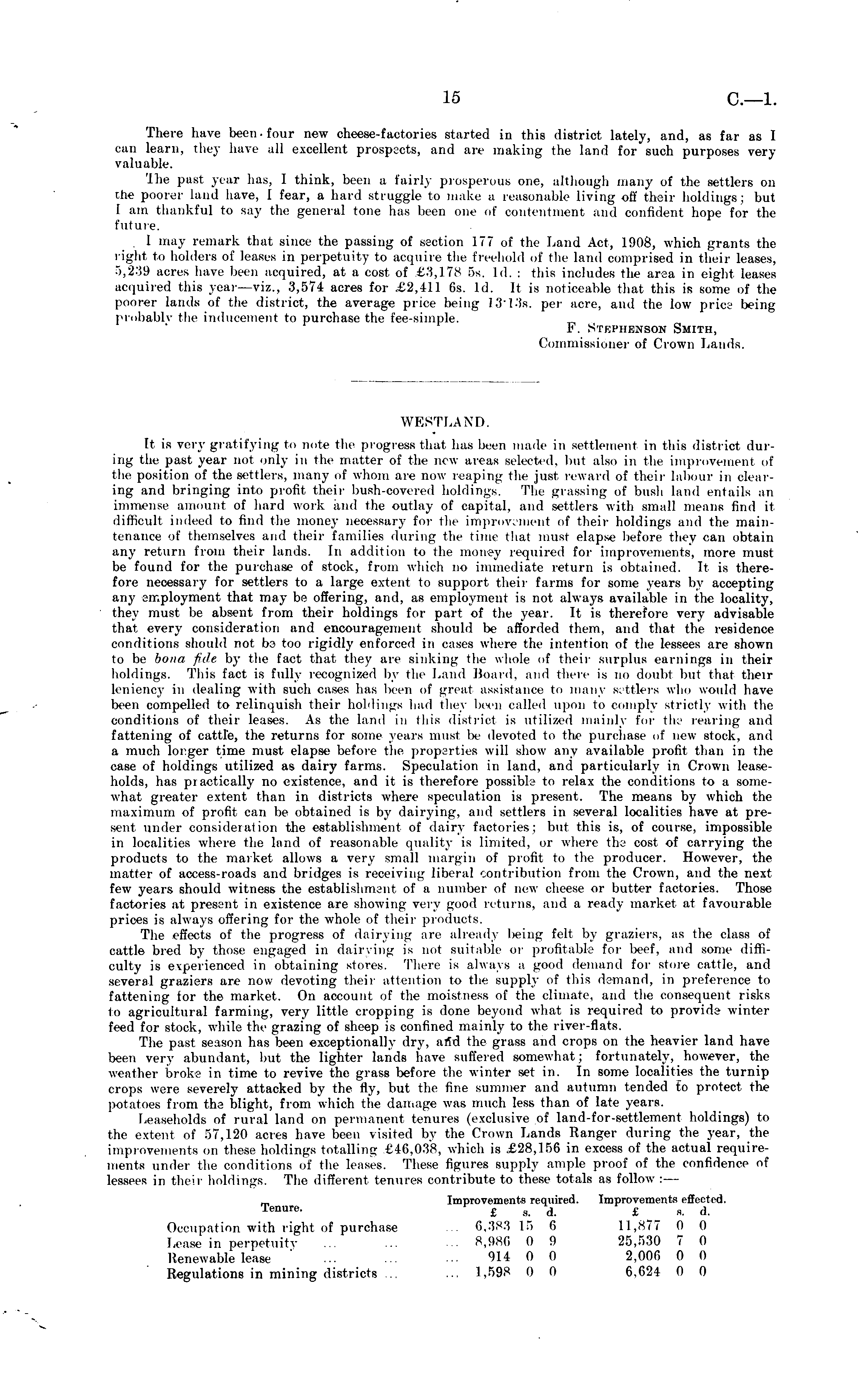 WESTLAND. It is very gratifying to note the progress that lias been made in settlement in this district during the. past year not only in the mutter of the new areas selected, but also in the improvement of the position of the settlers, many of whom are now reaping the just reward of their labour in clearing and bringing into profit their bush-OOVered holdings. The grassing of bush land entails an immense amount of hard work and the outlay of capital, and settlers with small means find it difficult indeed to find the money necessary I'm , the improvement of their holdings and the maintenance of themselves and their families during the time that must elapse before they can obtain any return from their lands. In addition to the money required for improvements, more must be found for the purchase of stock, from which no immediate return is obtained. It is therefore necessaiy for settlers to a large extent to support their farms for souk , years by accepting any employment that may be offering, and, as employment is not always available in the locality, they must be absent from their holdings for part of the year. It is therefore very advisable that every consideration and encouragement should lie afforded them, and that the residence conditions should not be too rigidly enforced in cases where the intention of the lessees are shown to be bona file by the fact that they are sinking the whole of their surplus earnings in their holdings. This fact is fully recognized by the hand Hoard, and there is no doubt but that their leniency in dealing with such cases has been of great assistance to many s. ttlers who would have been compelled to relinquish their holdings had they been called upon to comply strictly with the conditions of their leases. As the land in this district is utilized mainly for the rearing and fattening of cattle, the returns for some years must be devoted to the purchase of new stock, and a much longer time must elapse before the proparties will show any available profit than in the case of holdings utilized as dairy farms. Speculation in land, and particularly in Crown leaseholds, has practically no existence, and it is therefore possible to relax the conditions to a somewhat greater extent than in districts where speculation is present. The means by which the maximum of profit can be obtained is by dairying, and settlers in several localities have at present under consideration the establishment of dairy factories; but this is, of course, impossible in localities where the land of reasonable quality is limited, or where the cost of carrying the products to the market allows a very small margin of profit to the producer. However, the matter of access-roads and bridges is receiving liberal tribution from the Crown, and the next few j'ears should witness the establishment of a number of new cheese or butter factories. Those factories at present in existence are showing very good returns, and a ready market at favourable prices is always offering for the whole of their products. The effects of the progress of dairying are already living felt by graziers, as the class of cattle bred by those engaged in dairying is not suitable or profitable for beef, and some difficulty is experienced in obtaining stores. There is always a good demand for store cattle, and several graziers are now devoting their attention to the supply of this demand, in preference to fattening for the market. On account of the moistness of the climate, and the consequent risks to agricultural farming, very little cropping is done beyond what is required to provide winter feed for stock, while the grazing of sheep is confined mainly to the river-fiats. The past season has been exceptionally dry, and the grass and crops on the heavier land have been very abundant, but the lighter lands have suffered somewhat; fortunately, however, the weather broke in time to revive the grass before the winter set in. In some localities the turnip crops were severely attacked by the fly, but the line summer and autumn tended to protect the potatoes from the blight, from which the damage was much less than of late years. Leaseholds of rural land on permanent tenures (exclusive of land-for-settlement holdings) to the extent of r>7.120 acres have been visited by the Crown Lands Hanger during the year, the improvements on these holdings totalling 1 16,038, which is £28,156 in excess of the actual requirements under the conditions of the leases. These figures supply ample proof of the confidence of lessees in their holdings. The different tenures contribute to these totals as follow : — „ Improvements required. Improvements effected. Tenure - £ s. d. £ s. ,1. Occupation with right of purchase -. 6,383 15 (5 11,877 0 0 Lease in perpetuity ... ... ... 8,986 0 0 25,530 7 0 Renewable leas,. ... ... ... 914 0 0 2,00fi 0 0 Regulations in mining districts ... ... 1,598 0 0 6,624 0 0
