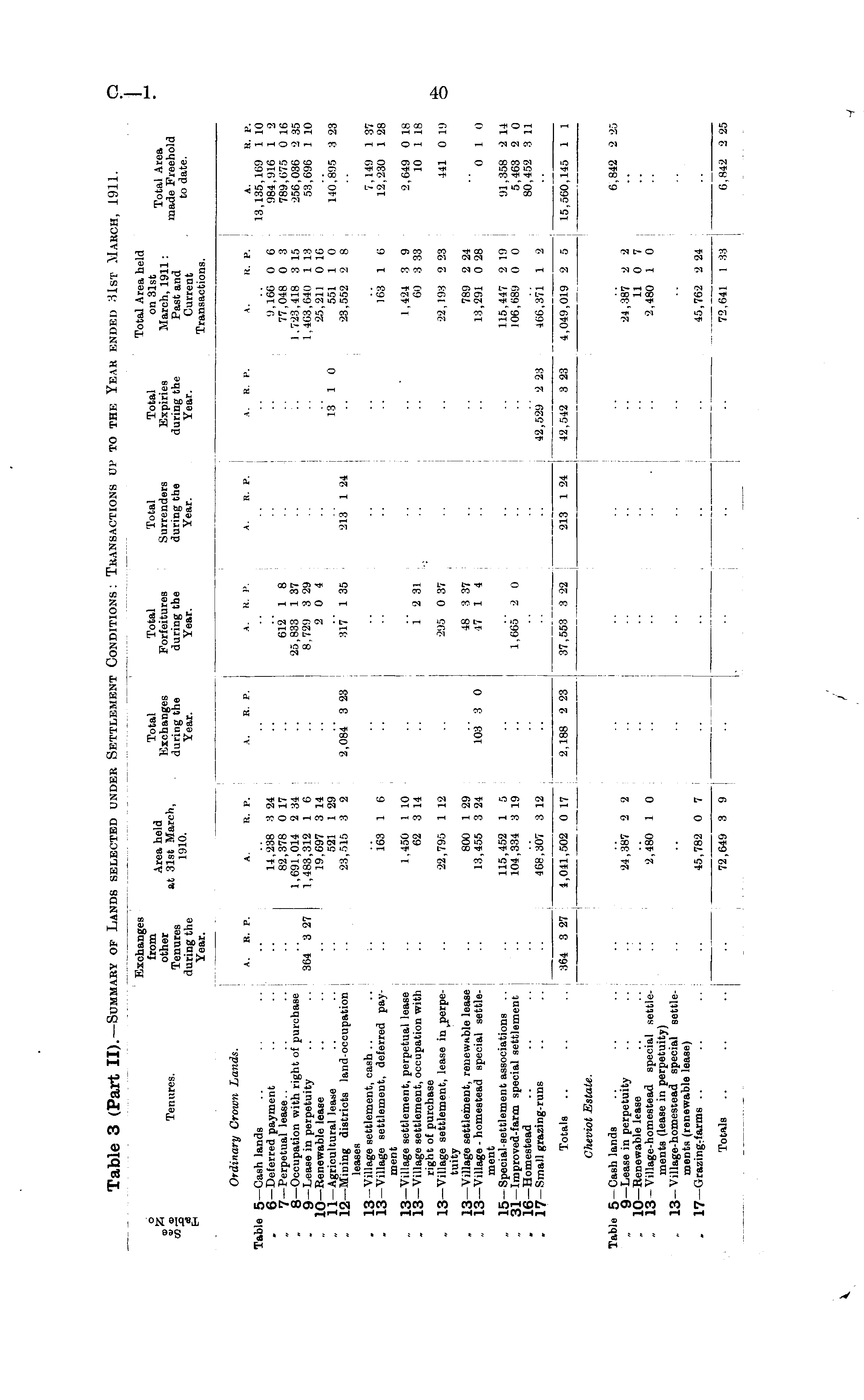 Table 3 (Part II). —Summary of Lands selected under Settlement Conditions: Transactions up to the Year ended 31st March, 1911.