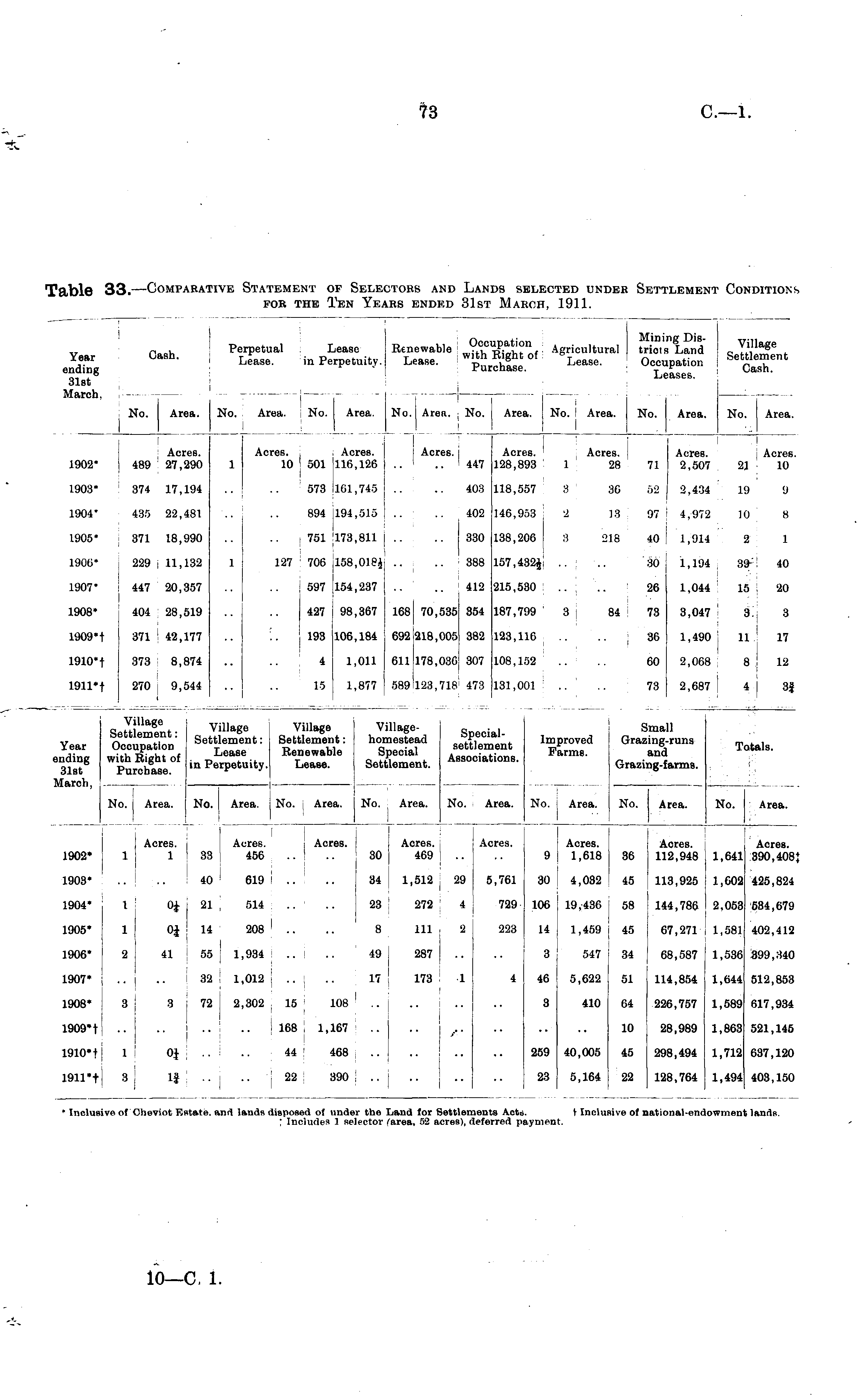Table 33. —Comparative Statement of Selectors and Lands selected under Settlement Conditions for the Ten Years ended 31st March, 1911.