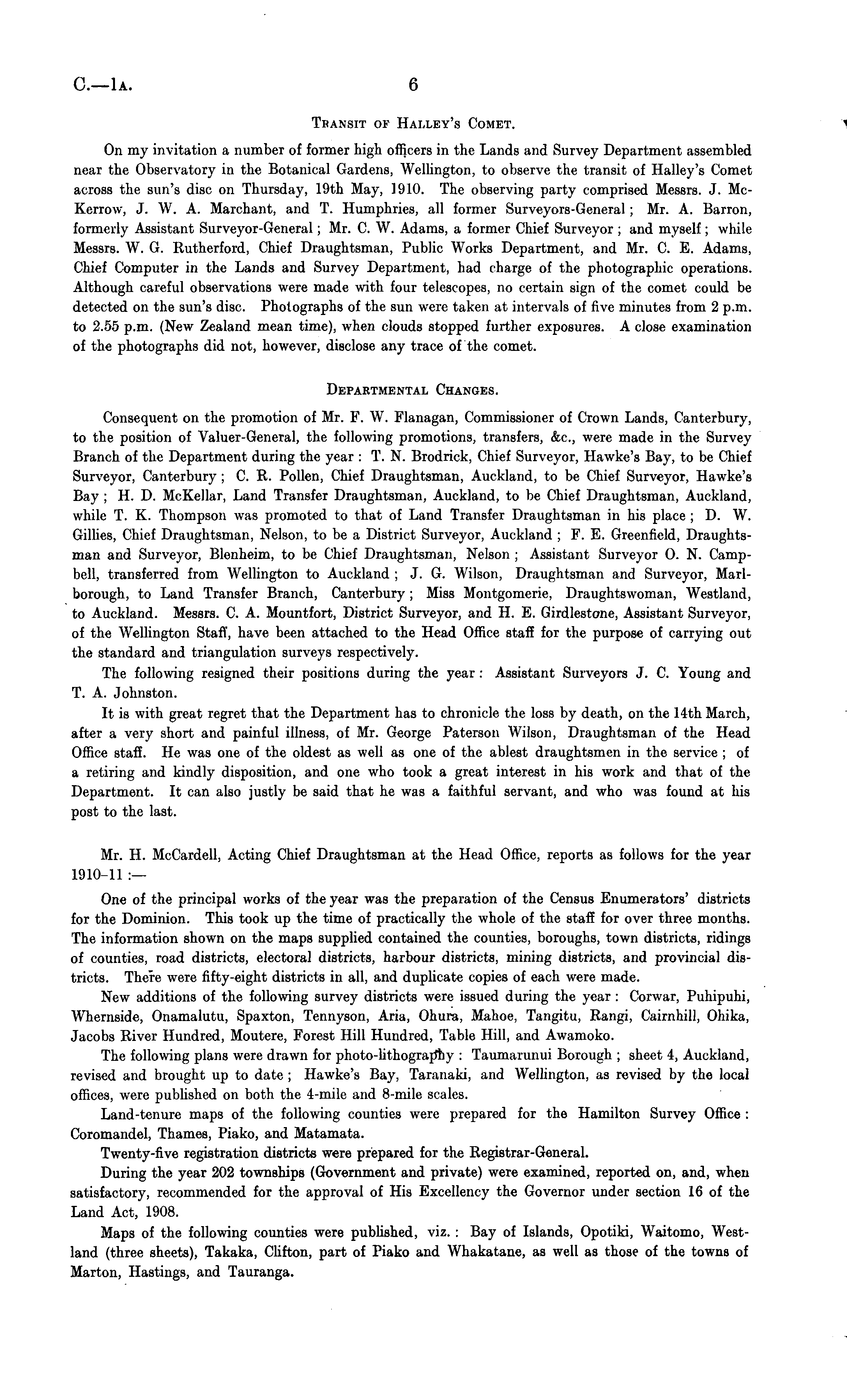 Transit of Halley's Comet. On my invitation a number of former high officers in the Lands and Survey Department assembled near the Observatory in the Botanical Gardens, Wellington, to observe the transit of Halley's Comet across the sun's disc on Thursday, 19th May, 1910. The observing party comprised Messrs. J. McKerrow, J. W. A. Marchant, and T. Humphries, all former Surveyors-General ; Mr. A. Barren, formerly Assistant Surveyor-General; Mr. C. W. Adams, a former Chief Surveyor ; and myself; while Messrs. W. G. Rutherford, Chief Draughtsman, Public Works Department, and Mr. C. E. Adams, Chief Computer in the Lands and Survey Department, had charge of the photographic operations. Although careful observations were made with four telescopes, no certain sign of the comet could be detected on the sun's disc. Photographs of the sun were taken at intervals of five minutes from 2 p.m. to 2.55 p.m. (New Zealand mean time), when clouds stopped further exposures. A close examination of the photographs did not, however, disclose any trace of the comet. Departmental Changes. Consequent on the promotion of Mr. F. W. Flanagan, Commissioner of Crown Lands, Canterbury, to the position of Valuer-General, the following promotions, transfers, &c, were made in the Survey Branch of the Department during the year : T. N. Brodrick, Chief Surveyor, Hawke's Bay, to be Chief Surveyor, Canterbury ; C. E. Pollen, Chief Draughtsman, Auckland, to be Chief Surveyor, Hawke's Bay ; H. D. McKellar, Land Transfer Draughtsman, Auckland, to be Chief Draughtsman, Auckland, while T. K. Thompson was promoted to that of Land Transfer Draughtsman in his place ; D. W. Gillies, Chief Draughtsman, Nelson, to be a District Surveyor, Auckland ; F. E. Greenfield, Draughtsman and Surveyor, Blenheim, to be Chief Draughtsman, Nelson ; Assistant Surveyor 0. N. Campbell, transferred from Wellington to Auckland ; J. G. Wilson, Draughtsman and Surveyor, Marlborough, to Land Transfer Branch, Canterbury; Miss Montgomerie, Draughtswoman, Westland, to Auckland. Messrs. C. A. Mountfort, District Surveyor, and H. E. Girdlestone, Assistant Surveyor, of the Wellington Staff, have been attached to the Head Office staff for the purpose of carrying out the standard and triangulation surveys respectively. The following resigned their positions during the year : Assistant Surveyors J. C. Young and T. A. Johnston. It is with great regret that the Department has to chronicle the loss by death, on the 14th March, after a very short and painful illness, of Mr. George Paterson Wilson, Draughtsman of the Head Office staff. He was one of the oldest as well as one of the ablest draughtsmen in the service ;of a retiring and kindly disposition, and one who took a great interest in his work and that of the Department. It can also justly be said that he was a faithful servant, and who was found at his post to the last. Mr. H. McCardell, Acting Chief Draughtsman at the Head Office, reports as follows for the year 1910-11 :— One of the principal works of the year was the preparation of the Census Enumerators' districts for the Dominion. This took up the time of practically the whole of the staff for over three months. The information shown on the maps supplied contained the counties, boroughs, town districts, ridings of counties, road districts, electoral districts, harbour districts, mining districts, and provincial districts. There were fifty-eight districts in all, and duplicate copies of each were made. New additions of the following survey districts were issued during the year : Corwar, Puhipuhi, Whernside, Onamalutu, Spaxton, Tennyson, Aria, Ohura, Mahoe, Tangitu, Rangi, Cairnhill, Ohika, Jacobs River Hundred, Moutere, Forest Hill Hundred, Table Hill, and Awamoko. The following plans were drawn for photo-lithograpliy : Taumarunui Borough ; sheet 4, Auckland, revised and brought up to date ; Hawke's Bay, Taranaki, and Wellington, as revised by the local offices, were published on both the 4-mile and 8-mile scales. Land-tenure maps of the following counties were prepared for the Hamilton Survey Office : Coromandel, Thames, Piako, and Matamata. Twenty-five registration districts were prepared for the Registrar-General. During the year 202 townships (Government and private) were examined, reported on, and, when satisfactory, recommended for the approval of His Excellency the Governor under section 16 of the Land Act, 1908. Maps of the following counties were published, viz. : Bay of Islands, Opotiki, Waitomo, Westland (three sheets), Takaka, Clifton, part of Piako and Whakatane, as well as those of the towns of Marton, Hastings, and Tauranga.