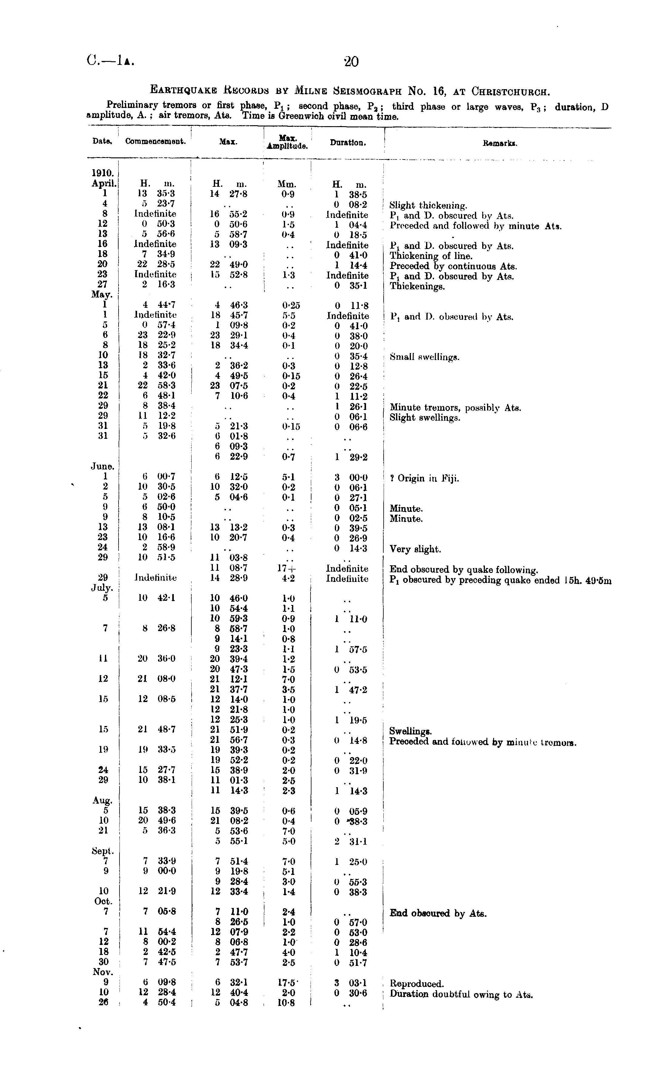 Earthquake Records by Milne Seismograph No. 16, at Christchurch. Preliminary tremors or first phase, P 1; second phase, P 2; third phase or large waves, P3; duration, D amplitude, A.; air tremors, Ats. Time is Greenwich civil mean time.