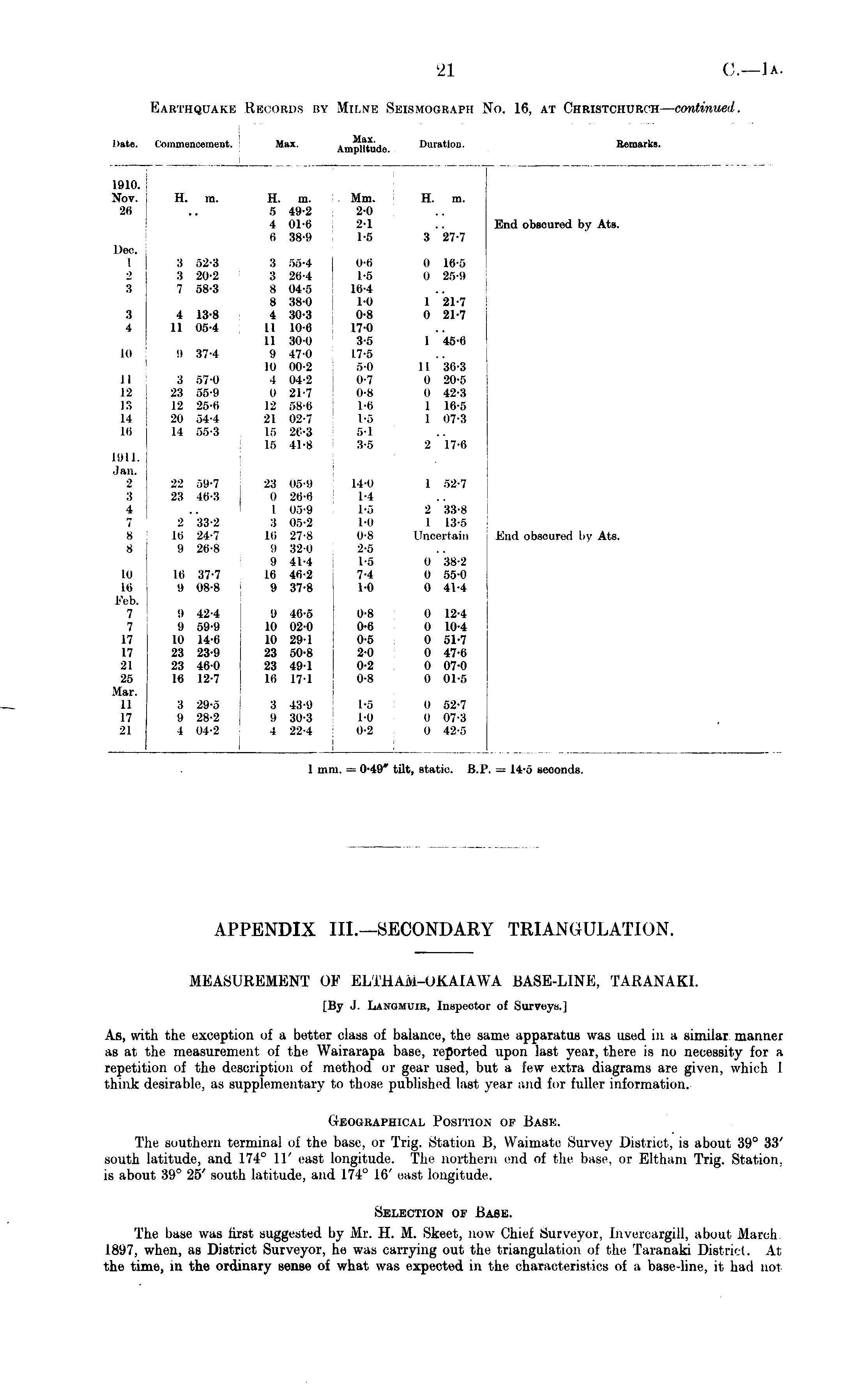 Date. Commencement. Max. AmpHtude Duration. Remarks. 1910. Nov. 2li H. in. H. m. Mm. H. m. 5 49-2 2-0 4 01-6 2-1 t! 38-9 1-5 3 27-7 End obscured by Ats. \)er. I o 3 :i 62-8 '■'< -V>-4 OH 0 16-5 :i 20-2 3 2ti-4 1-5 (I 26-9 7 58-3 8 04-5 16-4 8 38-0 1-0 1 21-7 4 13-8 4 30-3 0-8 0 21-7 11 05-4 11 10-6 17-0 11 300 3-5 1 45-6 9 37-4 9 470 17-5 10 (Mil , 5-0 11 36-3 3 57-0 I 114-2 0-7 0 20-5 23 56-9 0 21-7 0-8 0 42-3 12 25-6 12 68-6 I-β 1 16-5 20 54-4 21 02-7 1-5 1 07-3 14 55-3 15 26-8 5-1 15 41-8 3-5 2 17-fi 3 4 In II 12 13 14 11) Mill. ■ Illll. 2 "i 4 7 8 8 22 59-7 23 05-9 14-0 1 52-7 23 46-3 0 20-H 1-4 I 0.V9 I-γ. 2 33-8 2 33-2 3 0.V2 1-0 1 13-5 Id 24-7 1(> 27-8 0-8 Uncertain 9 26-8 9 32-0 2-5 9 41-4 1-5 0 38-2 Hi 37-7 16 46-2 7-4 0 55-0 9 08-8 9 37-8 1-0 0 41-4 End obscured by Ats. 10 10 Feb. 7 7 17 17 21 25 Mar. 11 17 21 9 42-4 9 40-5 U-8 0 12-4 9 59-9 10 02-0 0-6 0 10-4 10 14-6 10 29-1 0-5 0 51-7 23 23-9 23 50-8 2-0 0 47-6 23 46-0 23 49-1 0-2 0 07-0 16 12-7 1C) 17-1 0-8 0 01-5 3 29-5 3 43-9 1-5 0 52-7 9 28-2 9 30-3 1-0 0 07-3 4 04-2 I 22-4 0-2 0 42-5 1 in i. = 0-49' tilt, static. B. '. = 14-o seconds.