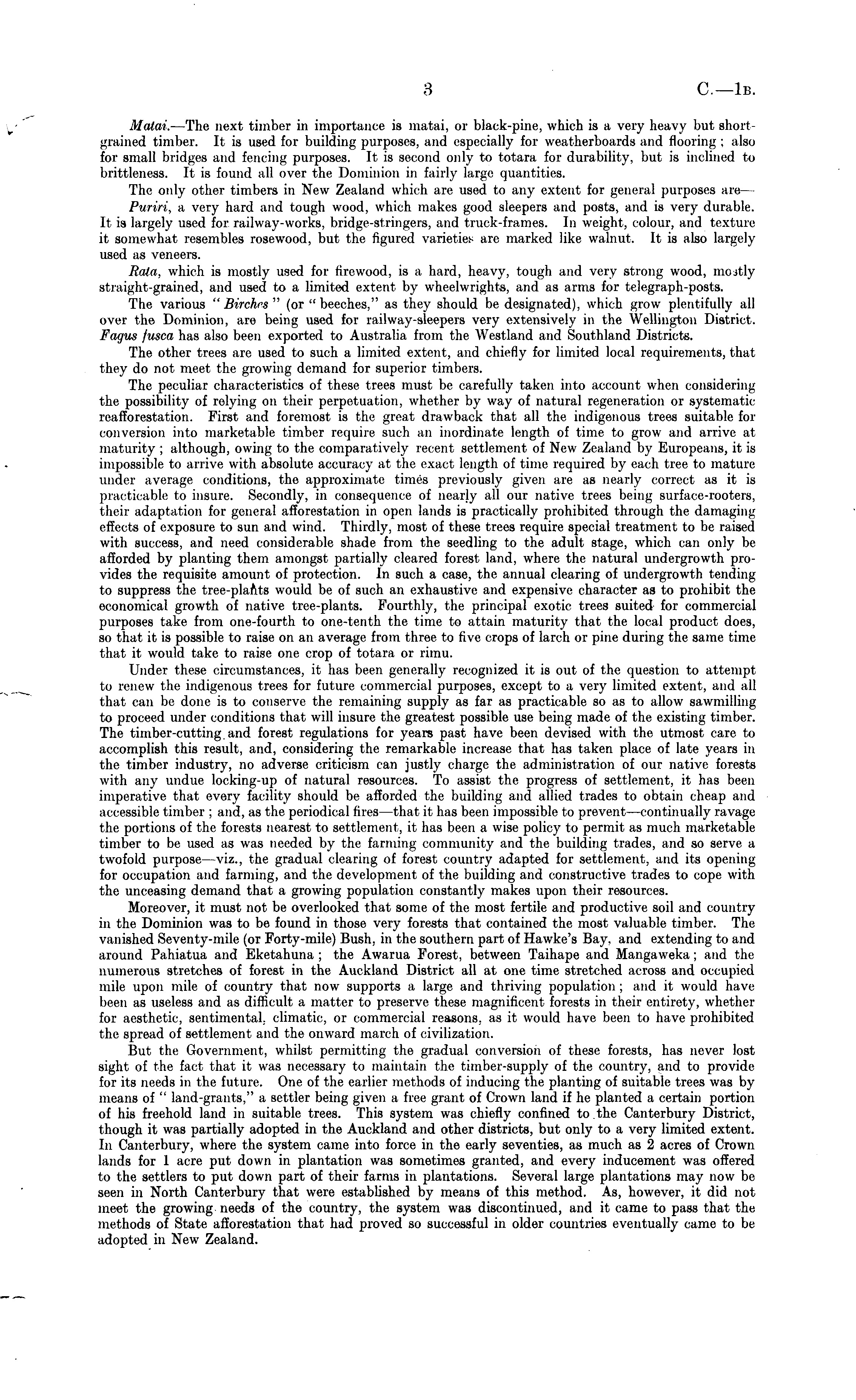 Matai. —The next timber in importance is matai, or black-pine, which is a very heavy bul shortgrained timber. It is used for building purposes, and especially for weatherboards and flooring; also for small bridges and fencing purposes. It is second only to totara for durability, but is inclined to brittleness. It is found all over the Dominion in fairly large quantities. The only other timbers in New Zealand which are used to any extent for general purposes arc. I'itriri. a very hard and tough wood, which makes good sleepers and posts, and is very durable. It ia largely used for railway-works, bridge-stringers, and truck-frames. In weight, colour, and texture it somewhat resembles rosewood, but the figured varieties- are marked like walnut. It is also largely used as veneers. Rain, which is mostly used for firewood, is a hard, heavy, tough and very strong wood, mostly straight-grained, and used to a limited extent by wheelwrights, and as arms for telegraph-posts. The. various " Birch's " (or " beeches," as they should be designated), which grow plentifully all over the Dominion, aro being used for railway-sleepers very extensively in the Wellington District. Fmjus fusca has also been exported to Australia from the Westland and Southland Districts. The other trees are used to such a limited extent, and chiefly for limited local requirements, that they do not meet the growing demand for superior timbers. The peculiar characteristics of these trees must be carefully taken into account when considering the possibility of relying on their perpetuation, whether by way of natural regeneration or systematic reafforestation. First and foremost is the great drawback that all the indigenous trees suitable for conversion into marketable timber require such an inordinate length of time to grow and arrive at maturity ; although, owing to the comparatively recent settlement of New Zealand by Europeans, it is impossible to arrive with absolute accuracy ai the exaci length of time required by each tree to mature under average conditions, the approximate times previously given are as nearly correct as it is practicable to insure. Secondly, in consequence of nearly all our native trees being surface-rooters, their adaptation for general afforestation in open lands is practically prohibited through the damaging effects of exposure to sun and wind. Thirdly, most of these trees require special treatment to be raised with success, and need considerable shade from the seedling to the adult stage, which can only be afforded by planting them amongst partially cleared forest land, where the natural undergrowth provides the requisite amount of protection. In such a case, the annual clearing of undergrowth tending to suppress the tree-plants would be of such an exhaustive and expensive character as to prohibit the economical growth of native tree-plants. Fourthly, the principal exotic trees suited for commercial purposes take from one-fourth to one-tenth the time to attain maturity that the local product does, so that it is possible to raise on an average from three to five crops of larch or pine during the same time that it would take to raise one crop of totara or rimu. Under these circumstances, it has been generally recognized it is out of the question to attempt to renew the indigenous trees for future commercial purposes, except to a very limited extent, and all that can be done is to conserve the remaining supply as far as practicable so as to allow sawniilliiig to proceed under conditions that will insure the greatest possible use being made of the existing timber. The timber-cutting, and forest regulations for years past have been devised with the utmost care to accomplish this result, and, considering the remarkable increase that has taken place of late years in the timber industry, no adverse criticism can justly charge the administration of our native forests with any undue locking-up of natural resources. To assist the progress of settlement, it has been imperative that every facility should be afforded the building and allied trades to obtain cheap and accessible timber ; and, as the periodical fires —that it has been impossible to prevent —continually ravage the portions of the forests nearest to settlement, it has been a wise policy to permit as much marketable timber to be used as was needed by the farming community and the building trades, and so serve a twofold purpose —viz., the gradual clearing of forest country adapted for settlement, and its opening for occupation and fanning, and the development of the building and constructive trades to cope with the unceasing demand that a growing population constantly makes upon their resources. Moreover, it must not be overlooked that some of the most fertile and productive soil and country in the Dominion was to be found in those very forests that contained the most valuable timber. The vanished Seventy-mile (or Forty-mile) Bush, in the southern part of Hawke's Bay, and extending to and around Pahiatua and Eketahuna ; the Awarua Forest, between Taihape and Mangaweka; and the numerous stretches of forest in the Auckland District all at one time stretched across and occupied mile upon mile of country that now supports a large and thriving population; and it would have been as useless and as difficult a matter to preserve these magnificent forests in their entirety, whether for aesthetic, sentimental, climatic, or commercial reasons, as it would have been to have prohibited the spread of settlement and the onward march of civilization. But the Government, whilst permitting the gradual conversion of these forests, has never lost sight of the fact that it was necessary to maintain the timber-supply of the country, and to provide for its needs in the future. One of the earlier methods of inducing the planting of suitable trees was by means of " land-grants," a settler being given a free grant of Crown land if he planted a certain portion of his freehol