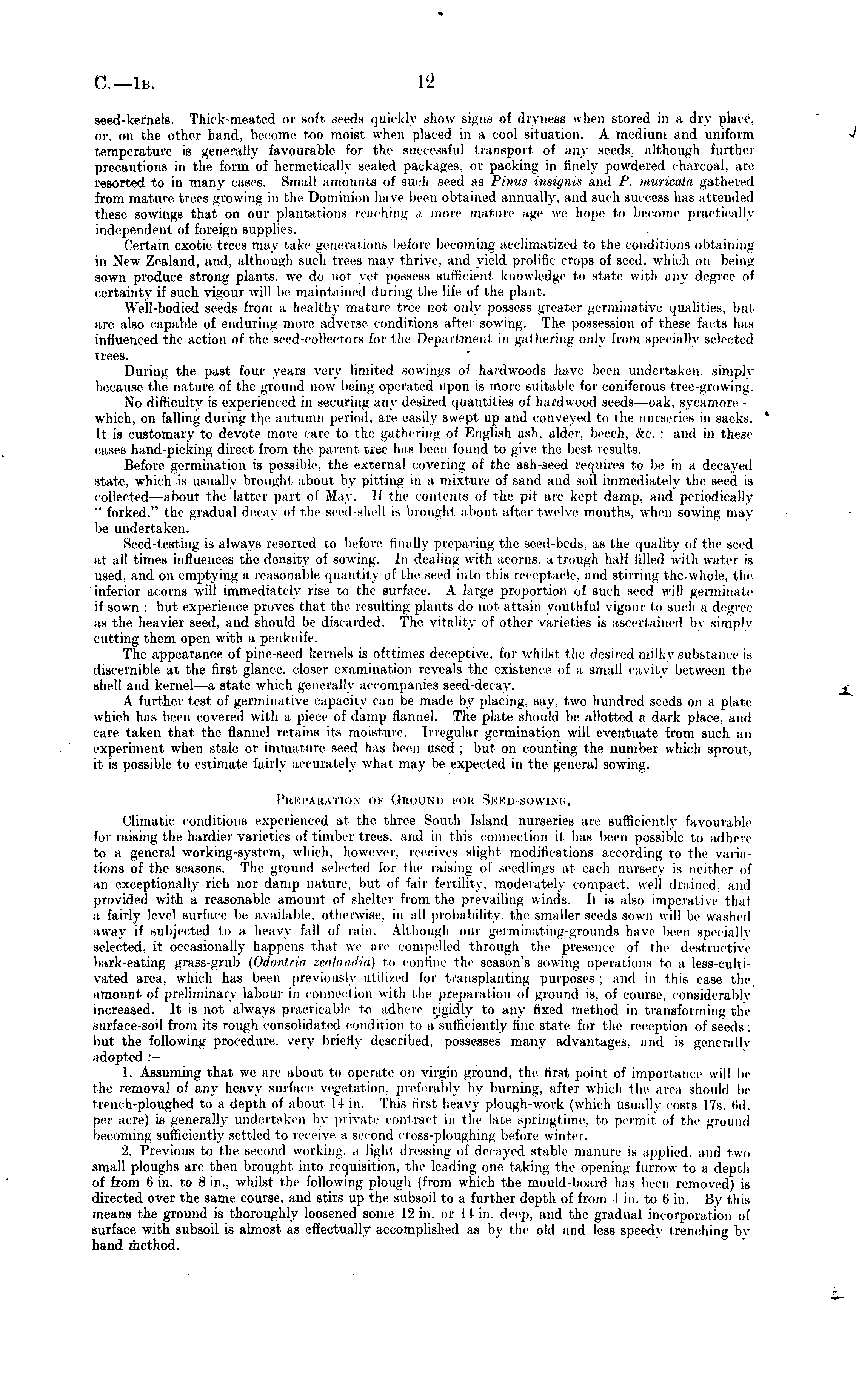 seed-kernels. Thick-meated or soft seeds quickly show signs of dryness when stored in a dry place, or, on the other hand, become too moist when placed in a cool situation. A medium and uniform temperature is generally favourable for the successful transport of any seeds, although further precautions in the form of hermetically sealed packages, or packing in finely powdered charcoal, are resorted to in many cases. Small amounts of such seed as Pinus insignis and /'. muricata gathered from mature trees growing in the Dominion have been obtained annually, and such success has attended these sowings that on our plantations reaching a more mature age we hope to become practically independent of foreign supplies. Certain exotic trees may take generations before becoming acclimatized to the conditions obtaining in New Zealand, and, although such trees may thrive, and yield prolific crops of seed, which on being sown produce strong plants, we do not vet possess sufficient knowledge to state with any degree of certainty if such vigour will lie maintained during the life of the plant. Well-bodied seeds from a healthy mature tree ncit only possess greater germinative qualities, l>ut are also capable of enduring more adverse conditions after sowing. The possession of these facts has influenced the action of the seed-collect,,is for the Department in gathering only from specially selected i rees. During the past four years very limited sowings of hardwoods have been undertaken, simply because the nature of the ground now being operated upon is more suitable for coniferous tree-growing. No difficulty is experienced in securing any desired quantities of hardwood seeds—oak. sycamore which, on falling during tl(e autumn period, are easily swept up and conveyed to the nurseries in sacks. It is customary to devote more care to tin gathering o! English ash. aider, beech, &c. : and in these cases hand-picking direct from the parent Uue has been found to give tin' best results. Before germination is possible, the external covering of the ash-seed requires to be in a decayed state, which is usually broughi about by pitting in a mixture of sand and soil immediately the seed is collected about the latter part of May. If the contents of the pit are kept damp, and periodically " forked." the gradual decay o! i hi' seed-shell is brought about alter twelve months, when sowing may lie undertaken. Seed-testing is always resorted to before finally preparing the seed-beds, as the quality of the s I at all times influences the density of sowing. In dealing with acorns, a trough half filled with water is used, and on emptying a reasonable quani ity of the seed into this receptacle, and stirring t he whole, the inferior acorns will immediately rise to the surface. A large proportion of such seed will germinate if sown ; but experience proves that the resulting plains do not attain youthful vigour to such a degree as the heavier seed, and should lie discarded. The vitality of other varieties is ascertained by simply cutting them open with a penknife. The appearance of pine-seed kernels is ofttimes deceptive, for whilst the desired milky substance is discernible at the first glance, closer examination reveals the existence of a small cavity between the shell and kernel —a state which generally accompanies seed-decay. A further test of germinative capacity can lie made by placing, say. two hundred seeds on a plate which has been covered with a piece of damp flannel. The plate should lie allotted a dark place, and care taken that the flannel retains its moisture. Irregular germination will eventuate from such an experiment when stale or immature seed has been used : lint on ((uniting the number which sprout, ii is possible to estimate fairly accurately what may I xpected m the general sowing. Preparation of Ground for Seed-sowing. Climatic conditions experienced at the three South Island nurseries are sufficiently favourable tor raising the hardier varieties oi timber trees, and in this connection it has been possible to adhere in a general working-system, which, however, receives slight, modifications according to the variations of the seasons. The ground selectee! for the raising of seedlings at each nursen is neither of an exceptionally rich nor damp nature, hut of fair fertility, moderately compact, well drained, and provided with a reasonable amount ol sheltei from the prevailing winds. It is also imperative that a fairly level surface lie available, otherwise, in all probability, the smaller seeds sown will lie washed away if subjected to a heavy fall of rain. Although our germinating-grounds have been specially selected, it occasionally happens that we are compelled through the presence of Ihe destructive bark-eating grass-grub (Odomtria lealandia) to confine the season's sowing operations to a less-culti-vated area, which has been previously utilized lor transplanting purposes: and in this case the amount of preliminary labour in connection with the preparation of ground is. of course, considerably increased. It is not always practicable to adhere ngidlv to any fixed method in transforming the surface-soil from its rough consolidated condii ion to a sufficiently line state for the reception of seeds : but the following procedure, very briefly described, possesses many advantages, and is generally adopted : — 1. Assuming that we are about to operate on virgin ground, the lirsl point of importance will be the removal of any heavy surlace vegetation, preferably by burning, after which the area should he trench-ploughed to a depth of aboul I I in. This first heavy plough-work (which Usually costs I 7s. (id. pci- acre) is generally undertaken by private contract in the late springtime, to permit of the ground becoming sufficiently settled to receive a second cross-ploughing before winter. 2. Previous to the second working, a light dressing of decayed stable manure is applied, and two small ploughs are then brought int