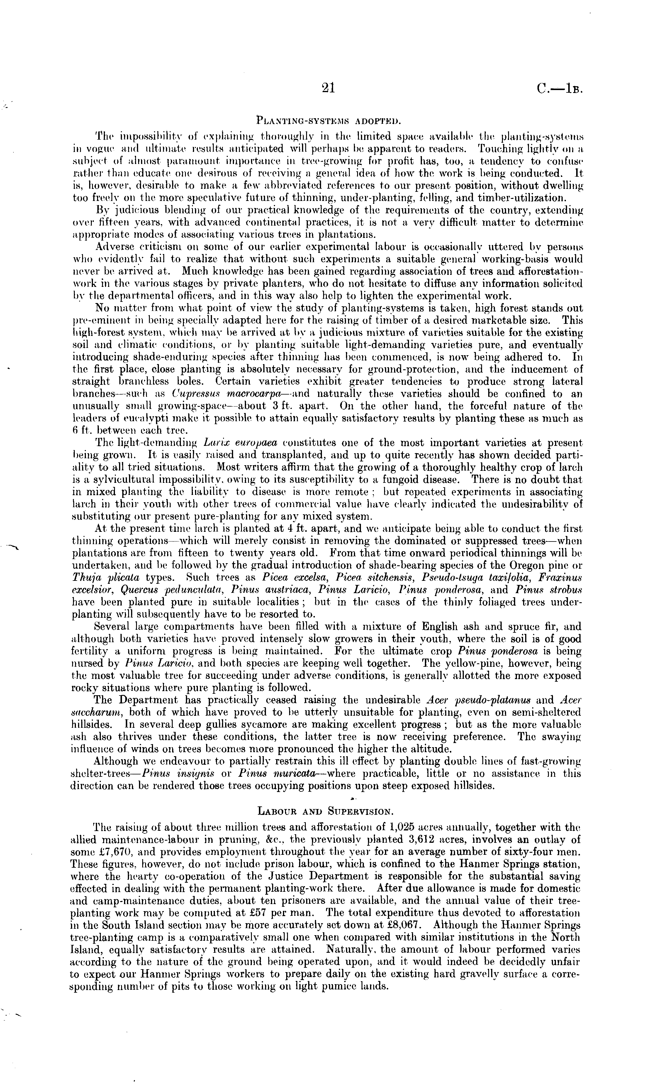 Planting-systems adopted. The impossibility <il explaining thoroughly in the limited space available the planting-systems in vogue and ultimate results anticipated will perhaps be appareni to lenders. Touching lightly ou a subject of almost paramount importance in tree-growing for profit lias, too, a tendency to ((infuse iviiher than educate one desirous of receiving a general idea of how the work is being conducted. li is. however, desirable to make a lew abbreviated references to our present position, without dwelling too freely on the more speculative future of thinning, under-planting, felling, and timber-utilization. By judicious blending of our practical knowledge of the requirements of the country, extending over fifteen years, with advanced continental practices, it is not a very difficult matter to determine appropriate modes of associating various trees in plantations. Adverse criticism on some of our earlier experimental labour is occasionally uttered by persons who evidently fail to realize thai without such experiments a suitable general working-basis would never lie arrived at. Much knowledge has been gained regarding association of trees and afforestationwork in the various stages by private planters, who do nol hesitate to diffuse any information solicited by the departmental officers, and in this way also help to lighten the experimental work. No matter from what point of view the study of planting-SYStems is taken, high forest stands out pre eminent in beine. specially adapted here for the raising of timber of a desired marketable size. This high-forest system, which may be arrived at by a judicious mixture of varieties suitable for the existing soil and climatic conditions, or by planting suitable light-demanding varieties pure, and eventually introducing shade-enduring species alter thinning has been commenced, is now being adhered to. In the first place, close planting is absolutely necessary lor ground-protection, and the inducement of Straighi branchless boles. Certain varieties exhibit greater tendencies to produce strong lateral branches such as Cupressus macroearpa and uaturally these varieties should be confined to an unusually small growing-space about .'Sit. apart. On the other hand, the forceful nature of the leaders of eucalypti make it possible to attain equally satisfactory results by planting these as much as (i ft. between each tree. The light-demanding Larix europaea constitutes one of the most important varieties at present being grown. It is easily raised and transplanted, and up to quite recently has shown decided partiality to all tried situations. Most writers affirm that the growing of a thoroughly healthy crop of larch is a sylvicultural impossibility, owing to its susceptibility to a fungoid disease. There is no doubt that in mixed planting the liability to disease is more remote : but repeated experiments in associating larch in their youth with other trees of commercial value have clearly indicated the undesirability of substituting our present pure-planting for any mixed system. At the present time larch is planted at 4 ft. apart, and we anticipate being able to conduct the first thinning operations which will merely consist in removing the dominated or suppressed trees —when plantations are from fifteen to twenty years old. From that time onward periodical thinnings will be undertaken, and be followed by the gradual introduction of shade-bearing species of the Oregon pine or Thuja plicala types. Such trees as Picea exoeiea, Picea sitchensis, Pseudo-tsuga taxifoUa, Fraxinus excelsior, Quercus pedunculata, PmuB auMriaca, Pinus l.<iri<i<>. Pinus ponderosa, and Pinus *tr<>l>us have been planted pure in suitable localities; but in the cases of the thinly foliaged trees underplanting will subsequently have to be resorted to. Several large compartments have been filled with a mixture of English ash and spruce fir, and although both varieties have proved intensely slow growers in their youth, where the soil is of good fertility a uniform progress is being maintained. For the ultimate crop Pinus ponderosa is being nursed by Pinus Laricio, and both species are keeping well together. The yellow-pine, however, being the most valuable tree lor succeeding under adverse conditions, is generally allotted the more exposed rocky situations where pure planting is followed. The Department has practically ceased raising the. undesirable Acer pseudo-platanus and Acer saocha/rum, both of which have proved to be utterly unsuitable for planting, even on semi-sheltered hillsides. In several deep gullies sycamore are making excellent progress ; but as the more valuable ash also thrives under these conditions, the latter tree is now receiving preference. The swaying influence of winds on trees becomes more pronounced the higher the altitude. Although we endeavour to partially restrain this ill effect by planting double lines of fast-growing shelter-trees — Pinus insignia or Pinus muricata —where practicable, little or no assistance in this direction can be rendered those trees occupying positions upon steep exposed hillsides. Labour and Supervision. The raising of about three million trees and afforestation of 1,025 acres annually, together with the allied maintenance-labour in pruning, &c, the previously planted 3,612 acres, involves an outlay of some £7.670. and provides employment throughout the year for an average number of sixty-four men. These figures, however, do not include prison labour, which is confined to the Haimier Springs station, where the hearty co-operation of the Justice Department is responsible for tin , substantial saving effected in dealing with the permanent planting-work there. After due allowance is made for domestic and camp-maintenance duties, about ten prisoners are available, and the annual value of their treeplanting work may be computed at £57 per man. The total expenditure thus devoted to afforestation in the South Island secti
