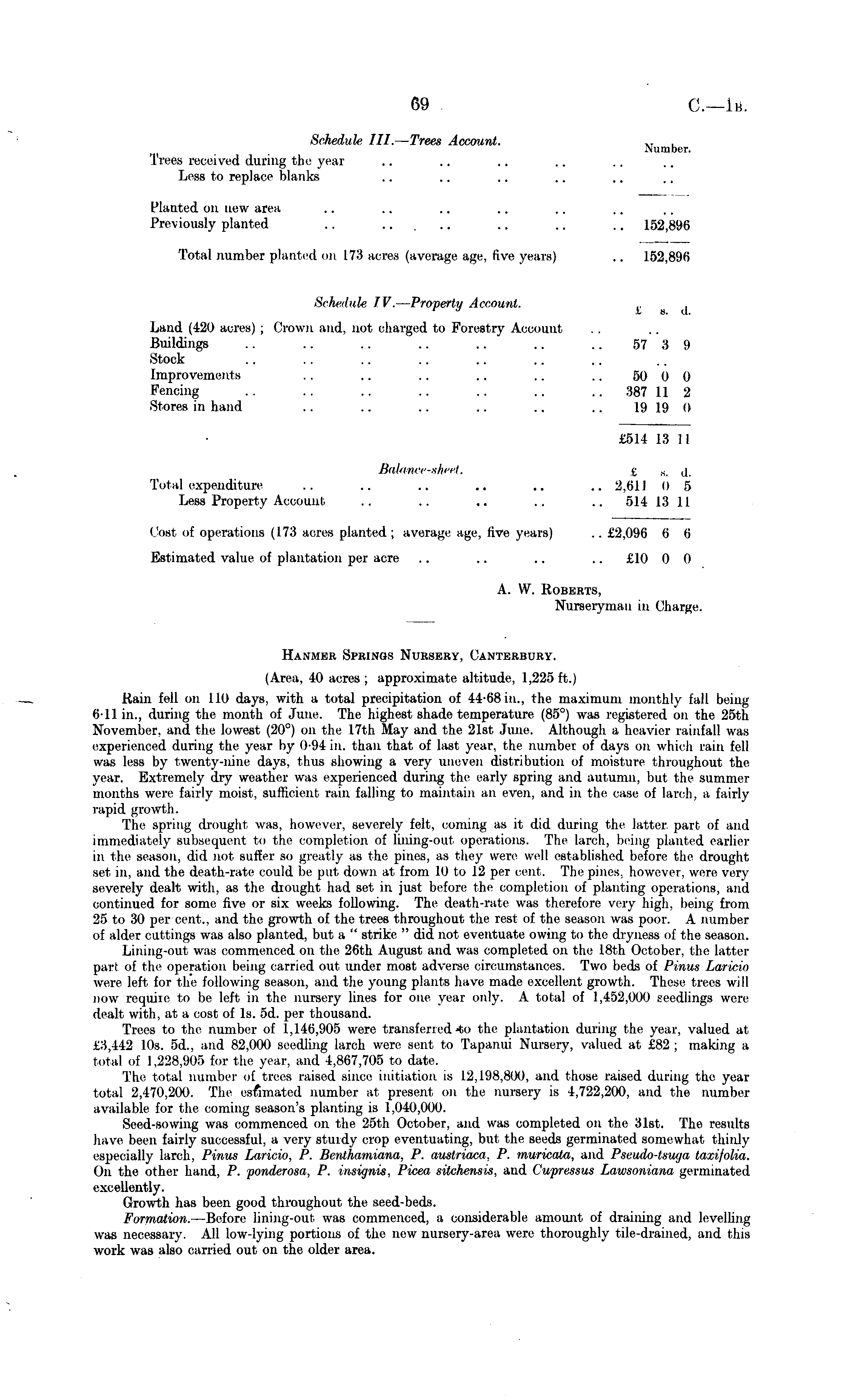Schedule 111. — Trees Account. , T , Number. Trees received during the year Less to replace blanks Planted on new area Previously planted .. ..... .. .. .. 152,896 Total number planted on 173 acres (average age, five years) .. 152,896 Schedule IV. — Property Account. Laud (420 acres) ; Crown and, not charged to Forestry Account Buildings .. .. .. .. .. .. .. 57 3 9 Stock Improvements .. .. .. .. .. .. 50 0 0 Fencing .. .. .. .. .. .. 387 11 2 .Stores in hand .. .. .. .. .. .. 19 19 0 £514 13 11 Balance-sheet. t; 8> j. Total expenditure .. .. .. .. .. .. 2,61] 0 5 Less Property Account .. .. .. .. .. 514 13 11 Cost of operations (173 acres planted ; average age, five years) .. £2,096 6 6 Estimated value of plantation per acre .. .. .. .. £10 0 0 A. W. Roberts, Nurseryman in Charge. Hanmer Springs Nursery, Canterbury. (Area, 40 acres ; approximate altitude, 1,225 ft.) Rain fell on 110 days, with a total precipitation of 44-68 in., the maximum monthly fall being 6-11 in., during the month of June. The highest shade temperature (85°) was registered on the 25th November, and the lowest (20°) on the 17th May and the 21st June. Although a heavier rainfall was experienced during the year by 0-94 in. than that of last year, the number of days on which ruin fell was less by twenty-nine days, thus showing a very uneven distribution of moisture throughout the year. Extremely dry weather was experienced during the early spring and autumn, but the summer months were fairly moist, sufficient rain falling to maintain an even, and in the case of larch, a fairly rapid growth. The spring drought was, however, severely felt, coming as it did during the latter part of and immediately subsequent to the completion of lining-out operations. The larch, being planted earlier in the season, did not suffer so greatly as the pines, as they were well established before the drought set in, and the death-rate could be put down at from 10 to 12 per cent. The pines, however, were very severely dealt with, as the diought had set in just before the completion of planting operations, and continued for some five or six weeks following. The death-rate was therefore very high, being from 25 to 30 per cent., and the growth of the trees throughout the rest of the season was poor. A number of alder cuttings was also planted, but a " strike " did not eventuate owing to the dryness of the season. Lining-out was commenced on the 26th August and was completed on the 18th October, the latter part of the operation being carried out under most adverse circumstances. Two beds of Pinus Laricio were left for the following season, and the young plants have made excellent growth. These trees will now require to be left in the nursery lines for one. year only. A total of 1,452,000 seedlings were dealt with, at a cost of Is. sd. per thousand. Trees to the number of 1,146,905 were transferred 4o the plantation during the year, valued at £3,442 10s. 5d., and 82,000 seedling larch were sent to Tapanui Nursery, valued at £82 ; making a total of 1,228,905 for the year, and 4,867,705 to date. The total number of trees raised .since initiation is 12,198,800, and those raised during the year total 2,470,200. The estimated number at present on the nursery is 4,722,200, and the number available for the coming season's planting is 1,040,000. Seed-sowing was commenced on the 25th October, and was completed on the 31st. The results have been fairly successful, a very sturdy crop eventuating, but the seeds germinated somewhat, thinly especially larch, Pinus Laricio, P. Benthamiana, P. austriaca, P. muricata, and Pseudo-tswja taxifolia. On the other hand, P. ponderosa, P. insignis, Picea sitchensis, and Cupressus Lawsoniana germinated excellently. Growth has been good throughout the seed-beds. Formation. —Before lining-out was commenced, a considerable amount of draining and levelling was necessary. All low-lying portions of the new nursery-area were thoroughly tile-drained, and this work was also carried out on the older area.