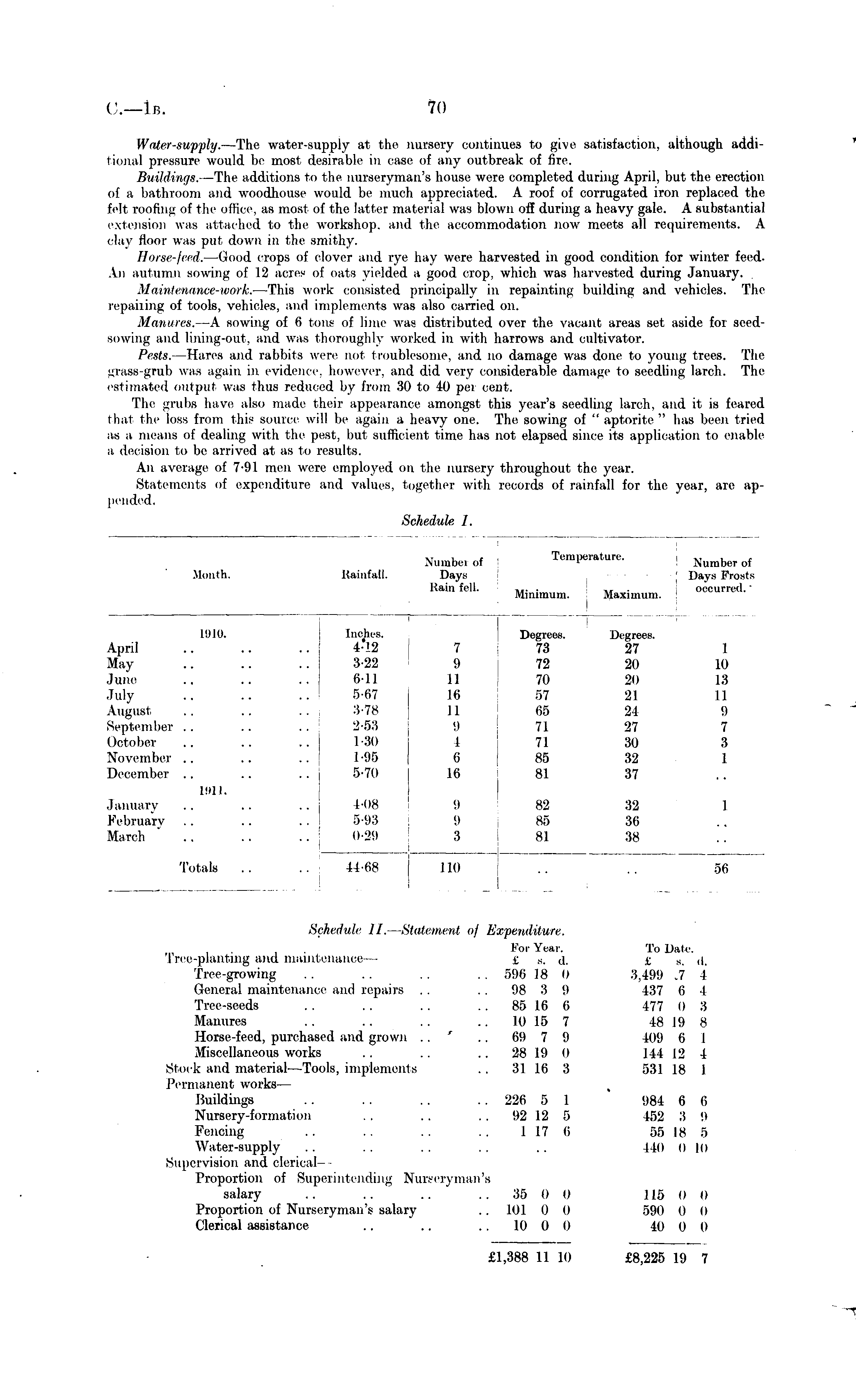 Schedule 11. Statement <>/ Expenditure. For Year. To Date. Tree-planting and. maintenance — t B , j. £ X ,|. Tree-growing .. . . . . .. 596 18 0 3,499 7 I General maintenance anil repairs .. .. 98 •'! 9 437 6 -I Tree-seeds . . . . . . 85 16 6 177 0 3 Manures .. .. .. 10 15 7 18 19 8 Horse-feed, purchased and grown .. .. (>9 7 9 409 6 I Miscellaneous works .. .. .. 28 19 0 144 12 I Stock and material Tools, implements .. 31 16 •"> 531 18 1 Permanent works — Buildings .. . . .. . . 226 r> I !iM I 6 (i Nursery-formation . . .. . . 92 12 5 152 .'! 9 Fencing .. .. .. .. Ll7 6 55 18 5 Water-supply .. .. .. .. .. 140 610 Supervision and clericalProportion of Superintending Nurseryman's salary .. .. .. 35 () 0 115 0 0 Proportion of Nurseryman's salary .. 101 0 0 590 0 0 Clerical assistance .. .. 10 0 0 10 0 0 £1,388 11 10 £8,225 19 7