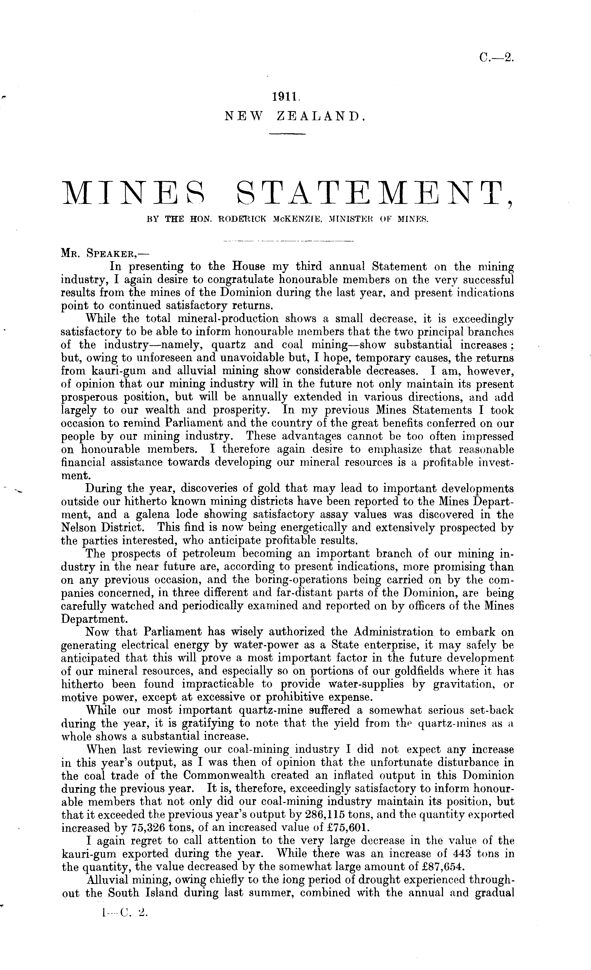 MINES STATEMENT, BY THE HON. RODERICK McKENZIE, MINISTER OF MINES.