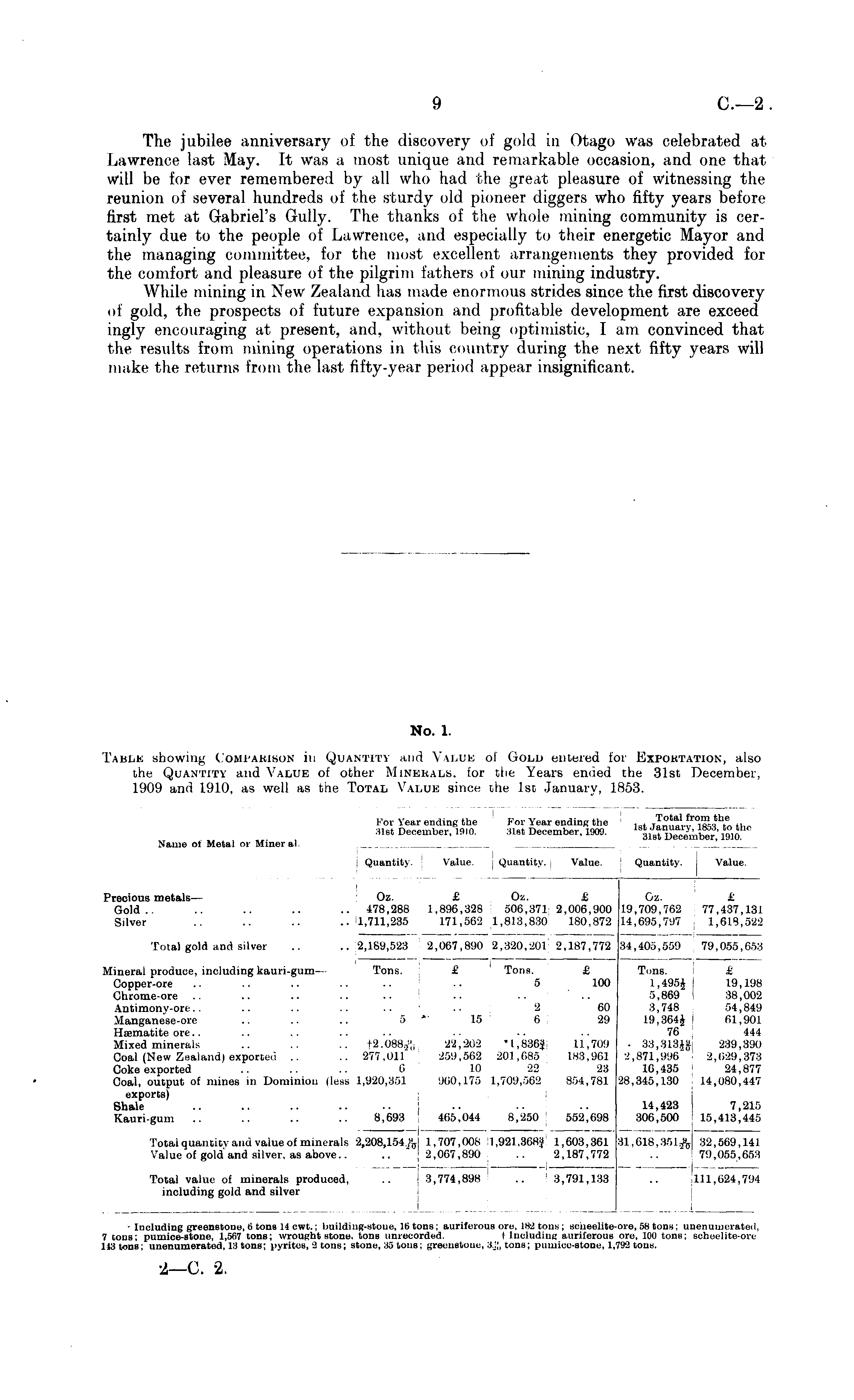 No. 1. Table showing Comparison in Quantity and Value of Gold entered for Exportation, also the Quantity and Value of other Minerals, for the Years ended the 31st December, 1909 and 1910, as well as the Total Value since the 1st January, 1853.