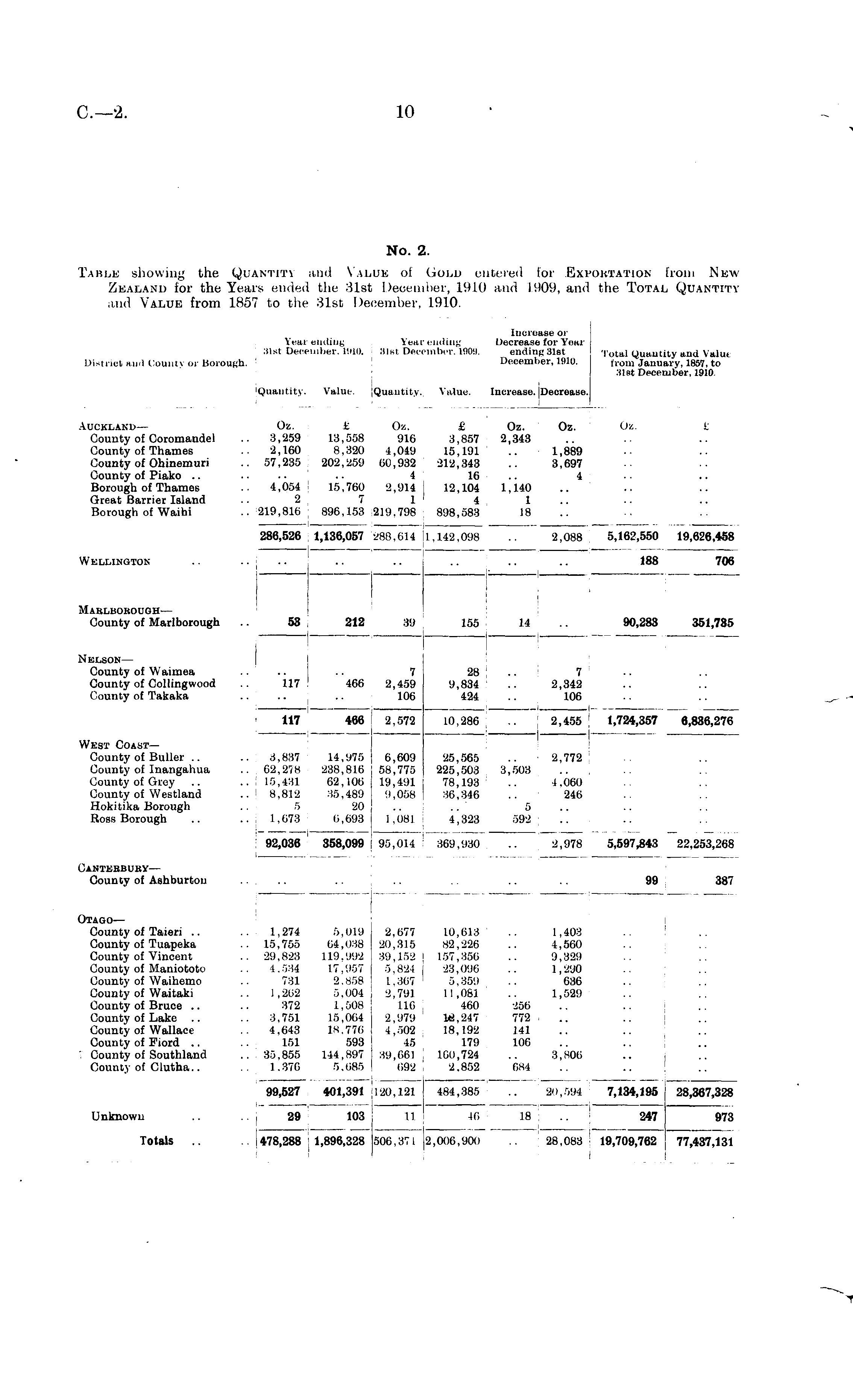 No. 2. Table showing the Quantity and Value of Gold entered for Exportation from New Zealand for the Years ended the 31st December, 1910 and 1909, and the Total Quantity and Value from 1857 to the 31st December, 1910.